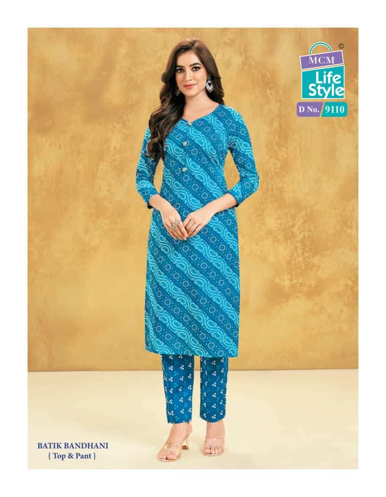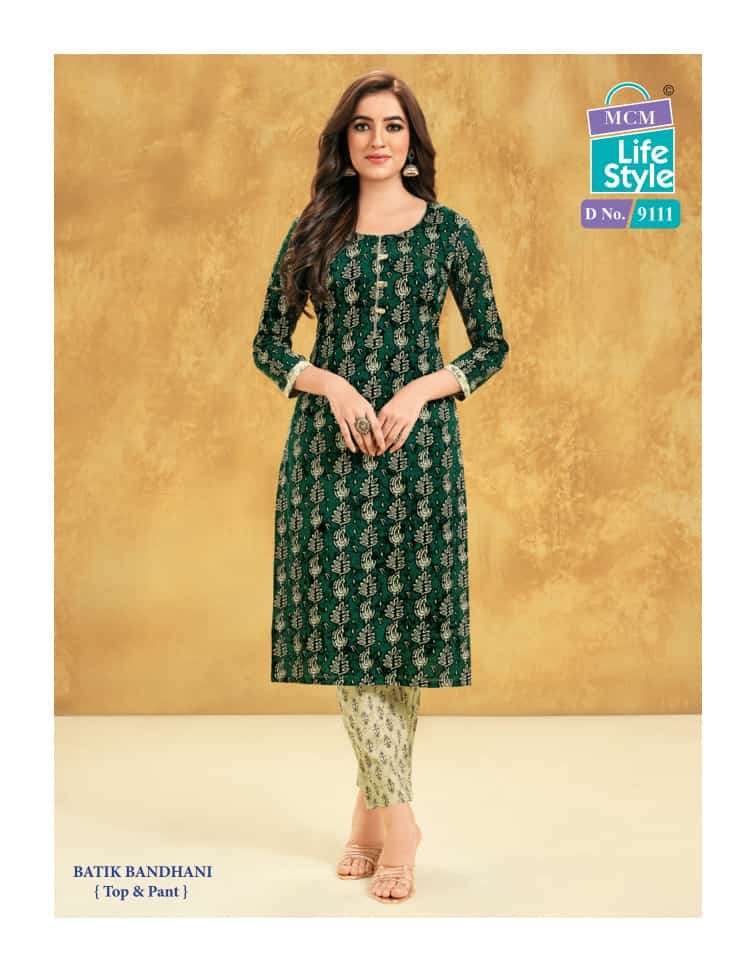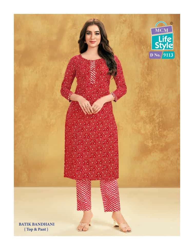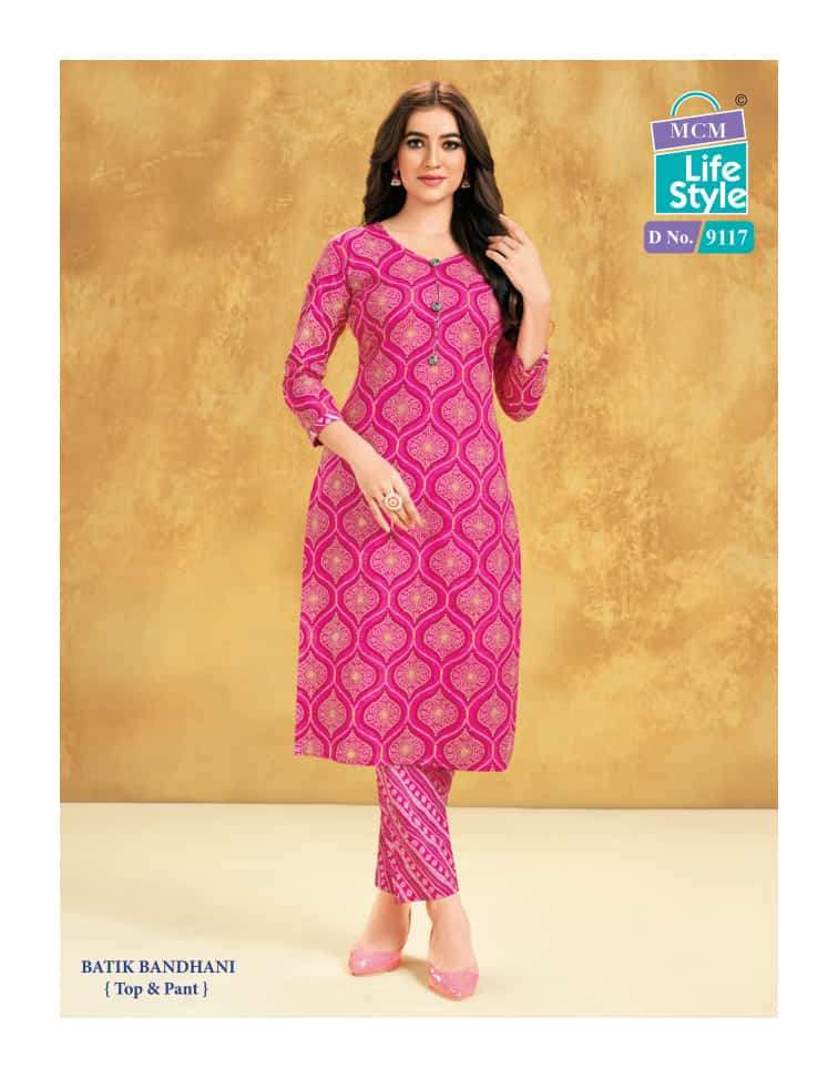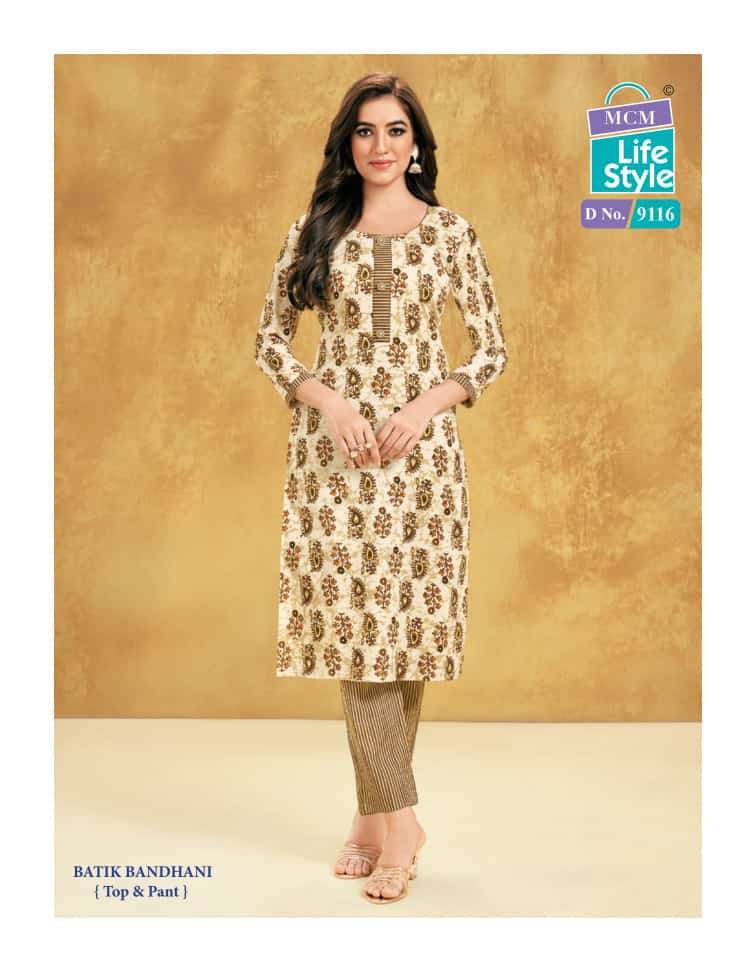 mcm lifestyle batik bandhani special pair 2pcs set fancy straight kurti with pant catalog