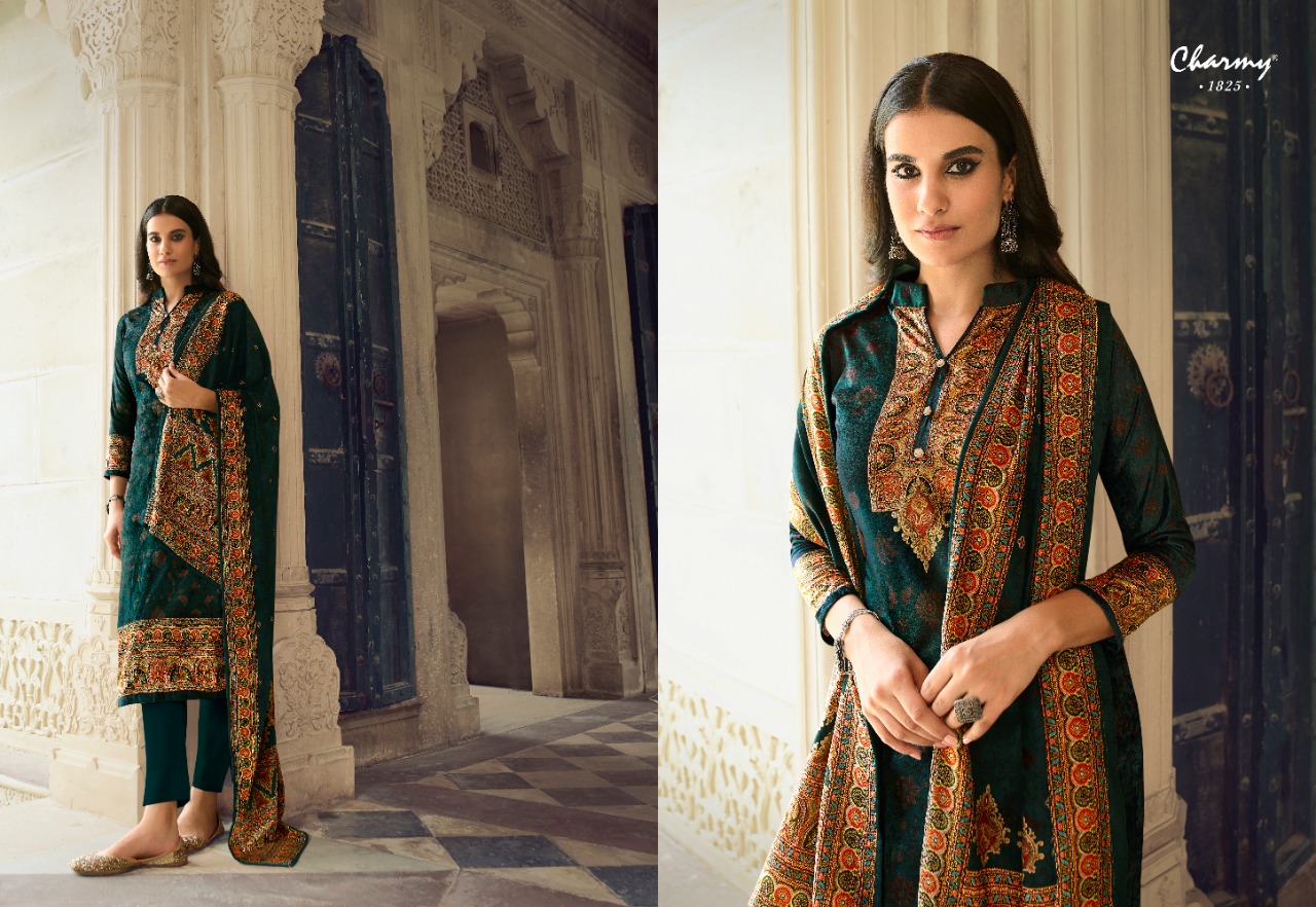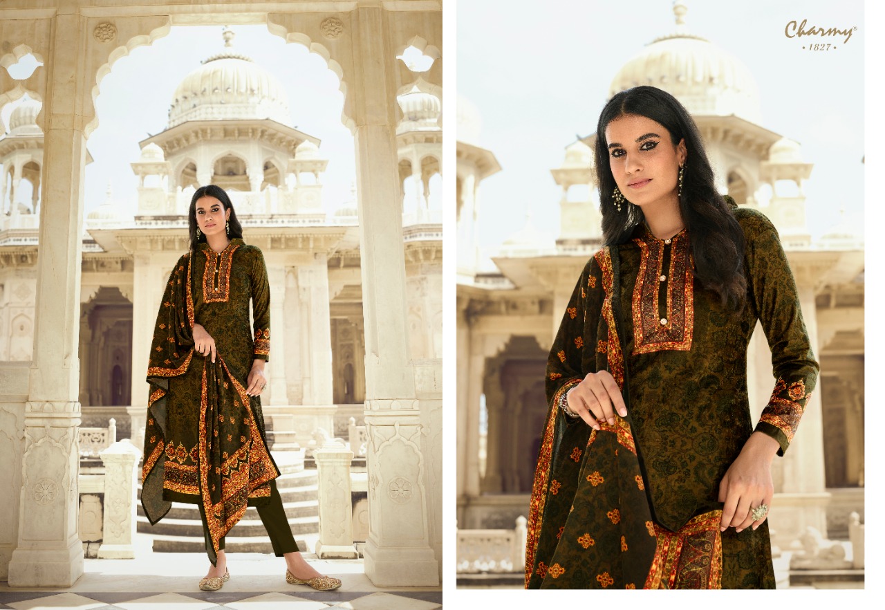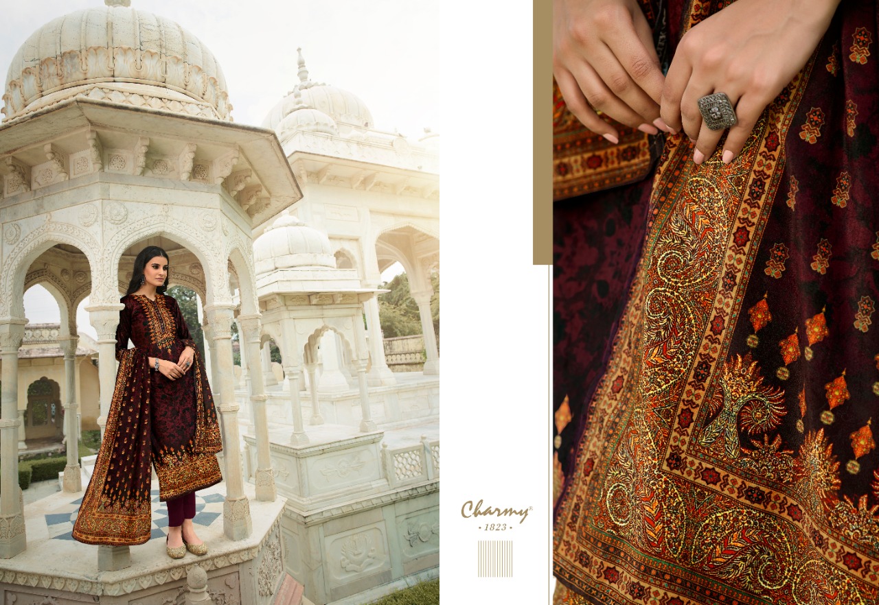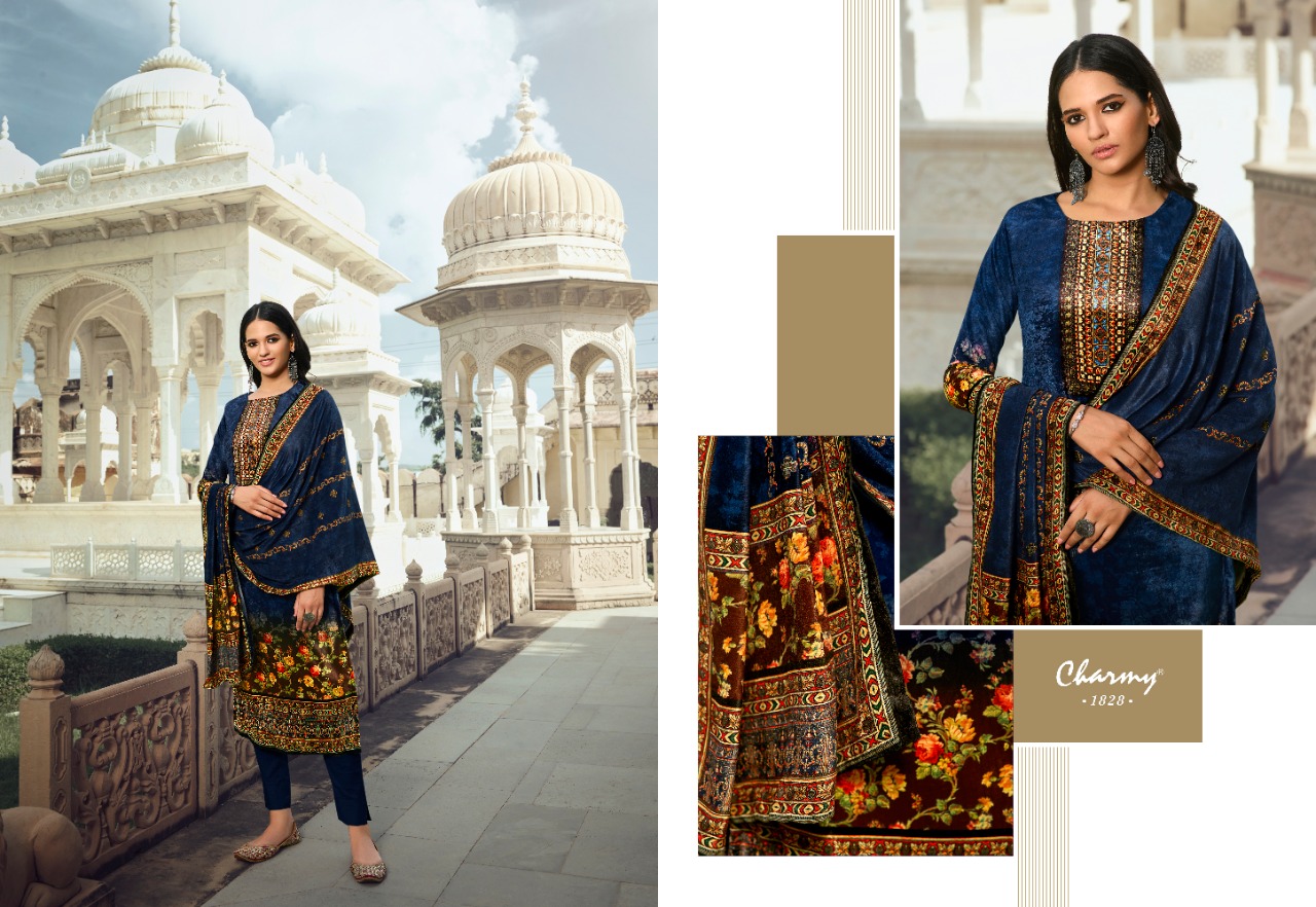 PRESENTS CHARMY * Velvet-2* TOP: Velvet digital print DUP: Velvet stall dupatta with digital print BOTTOM: Pure Pashmina RATE: 1295/- + GST |