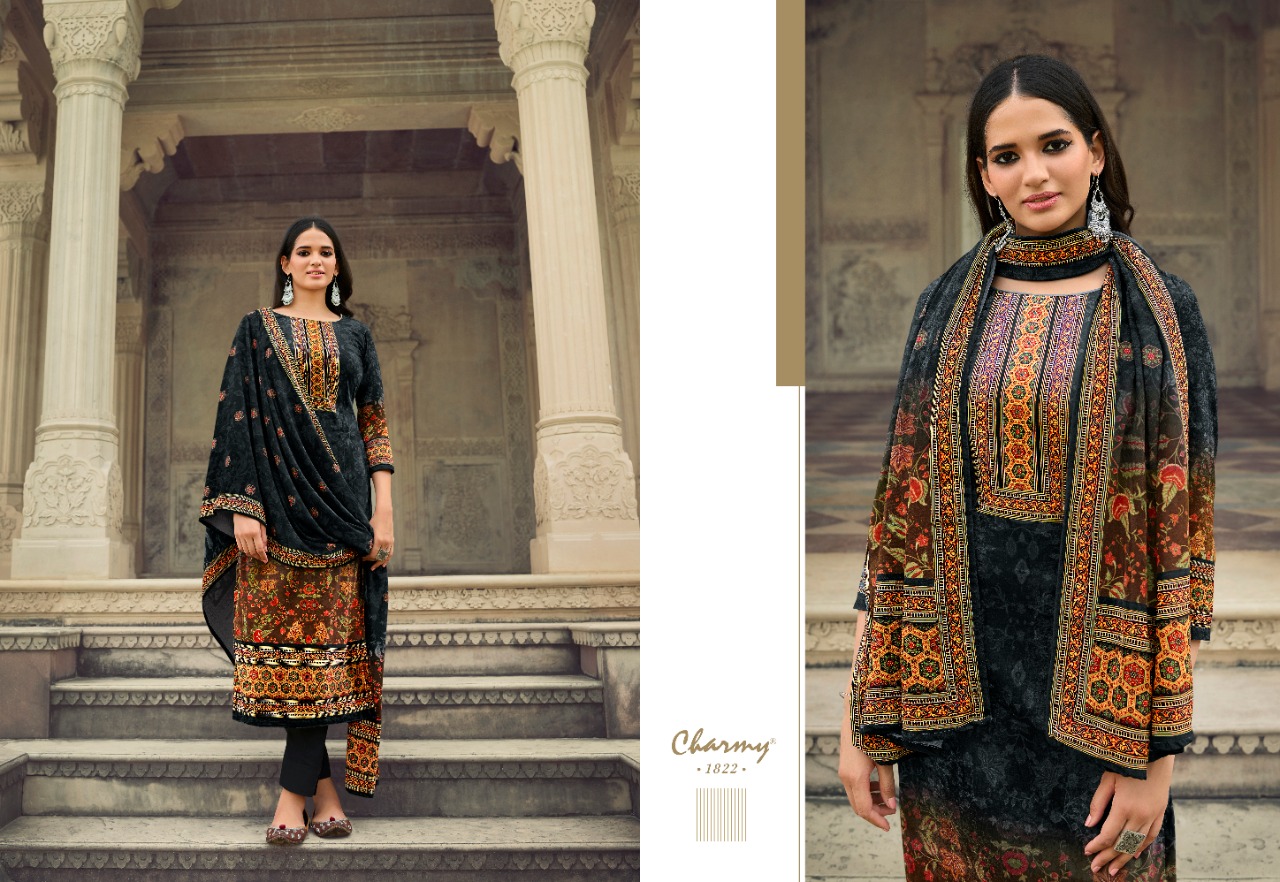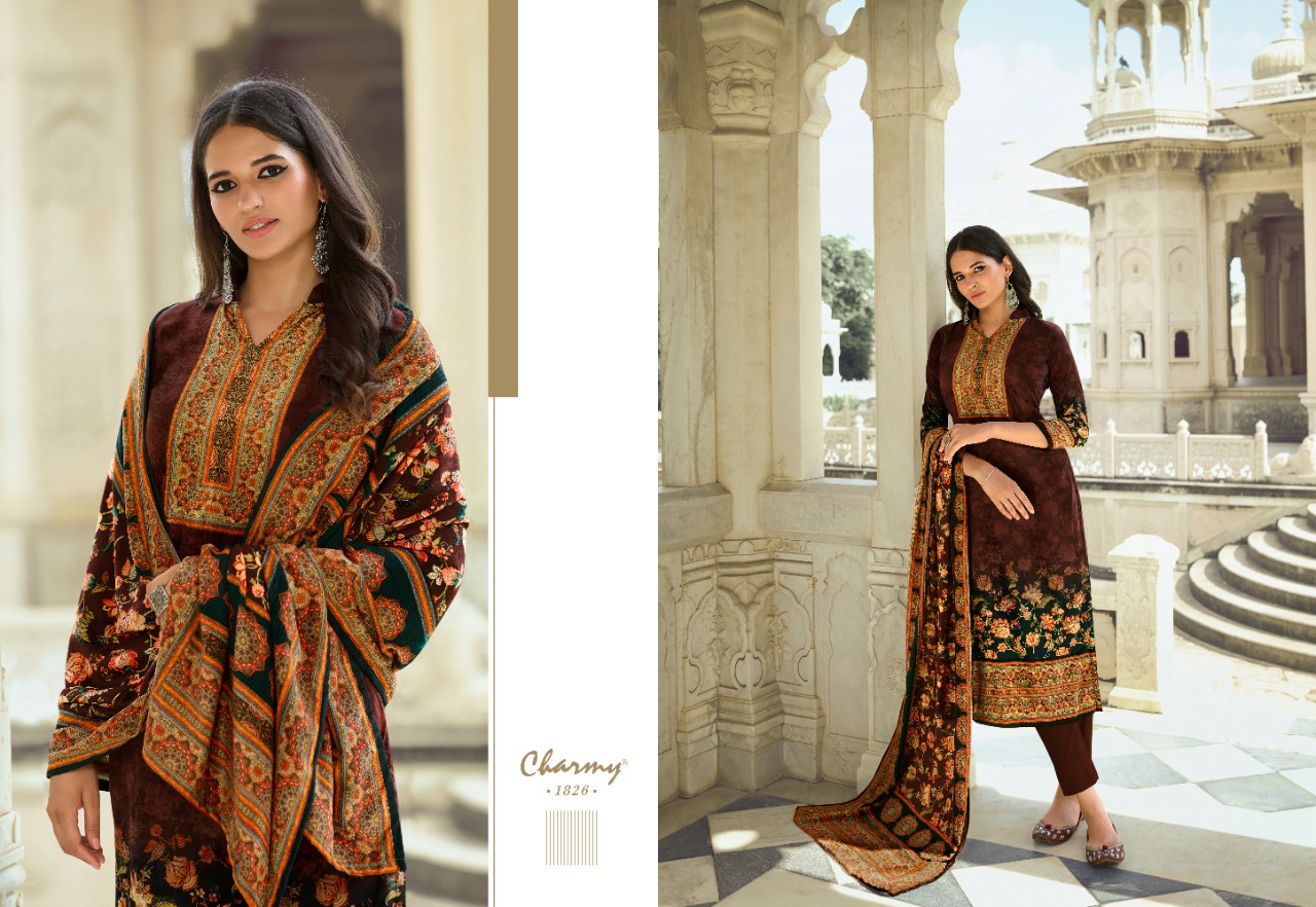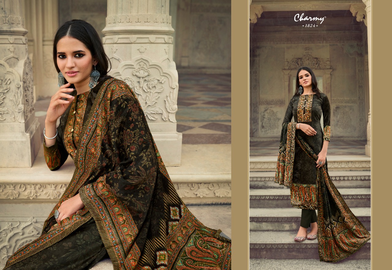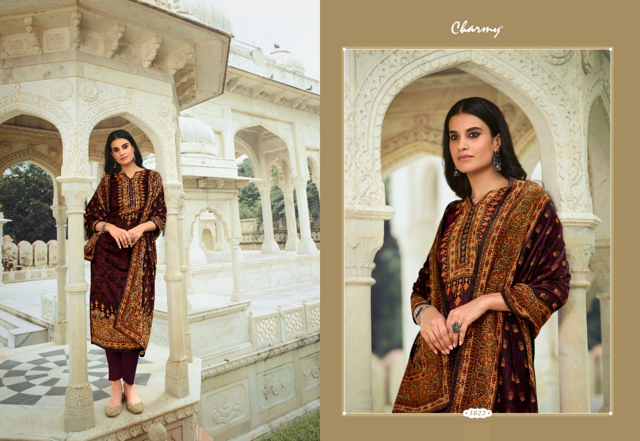 PRESENTS CHARMY * Velvet-2* TOP: Velvet digital print DUP: Velvet stall dupatta with digital print BOTTOM: Pure Pashmina RATE: 1295/- + GST |