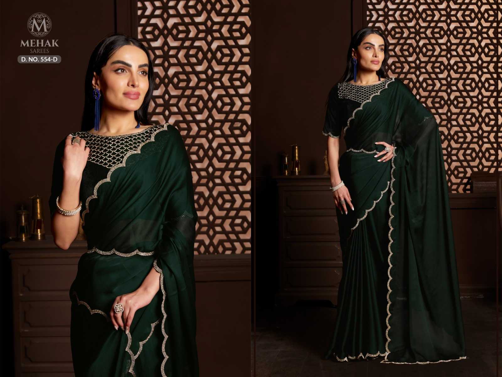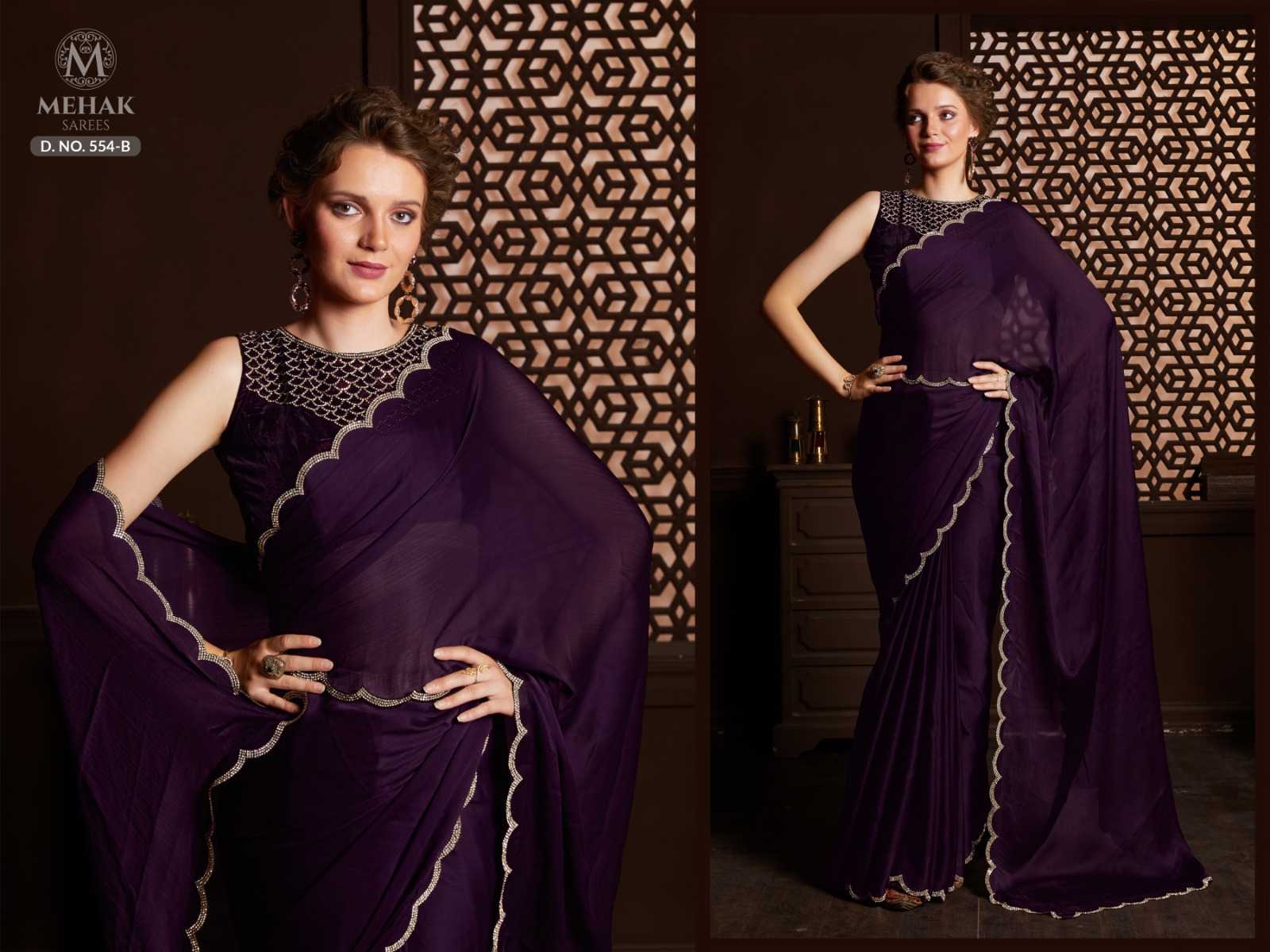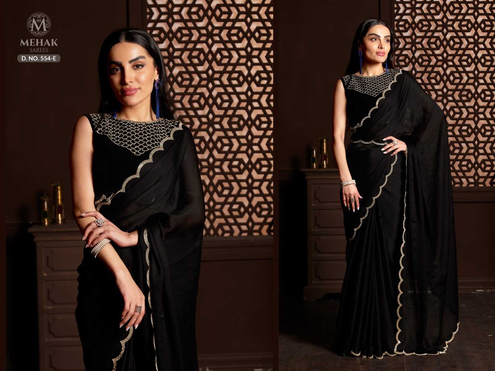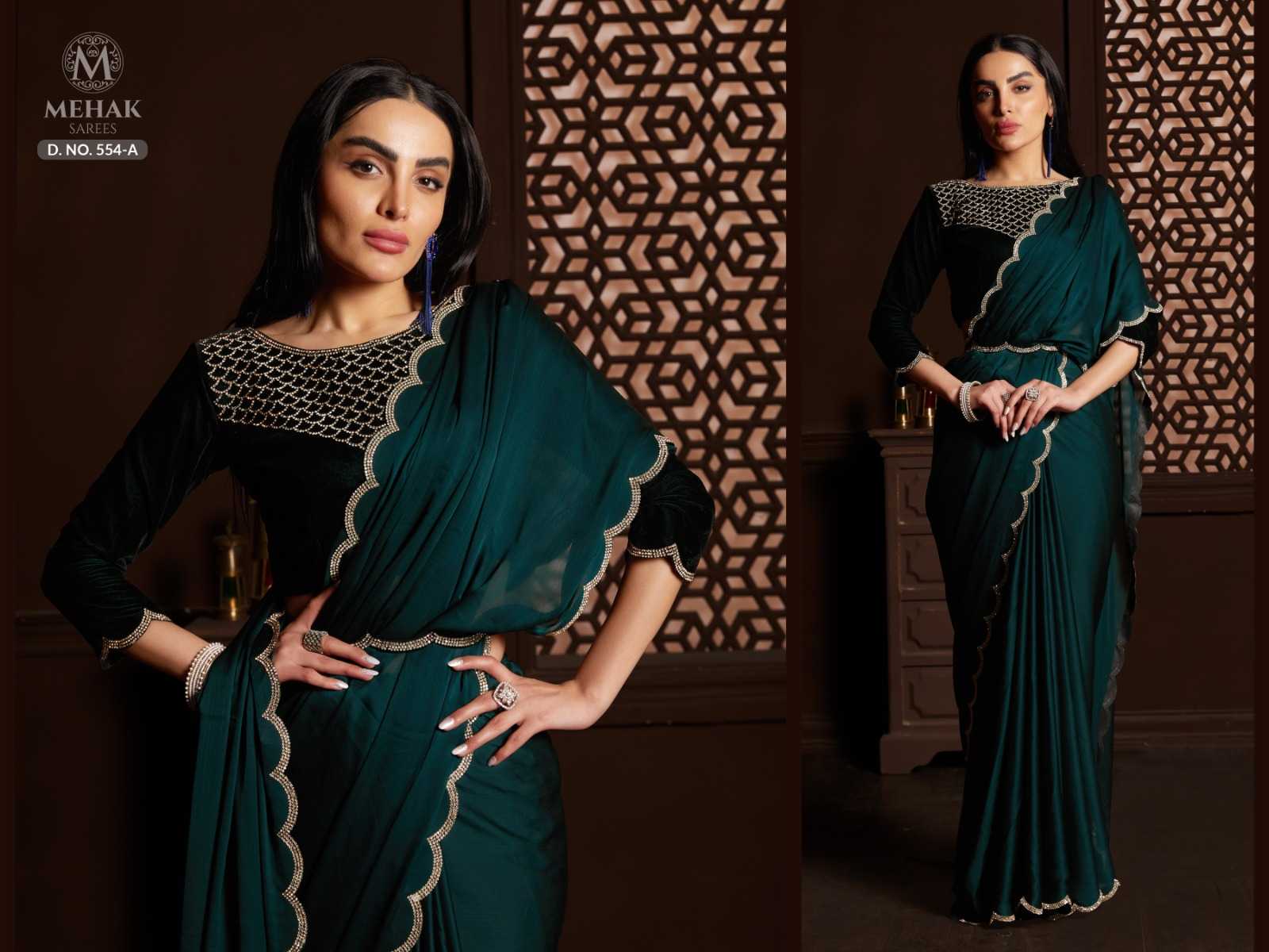 Brand name - MEHAK SAREES SERIES– 554 A - E Total colours - 5 PRICE - 1695 Saree Fabric- silk satin chiffon Work - Heavy jerquen hand work border. Blouses- pure 9000 velvet blouses with hand work neck and sleeves. Belt - heavy jerquen hand work belt