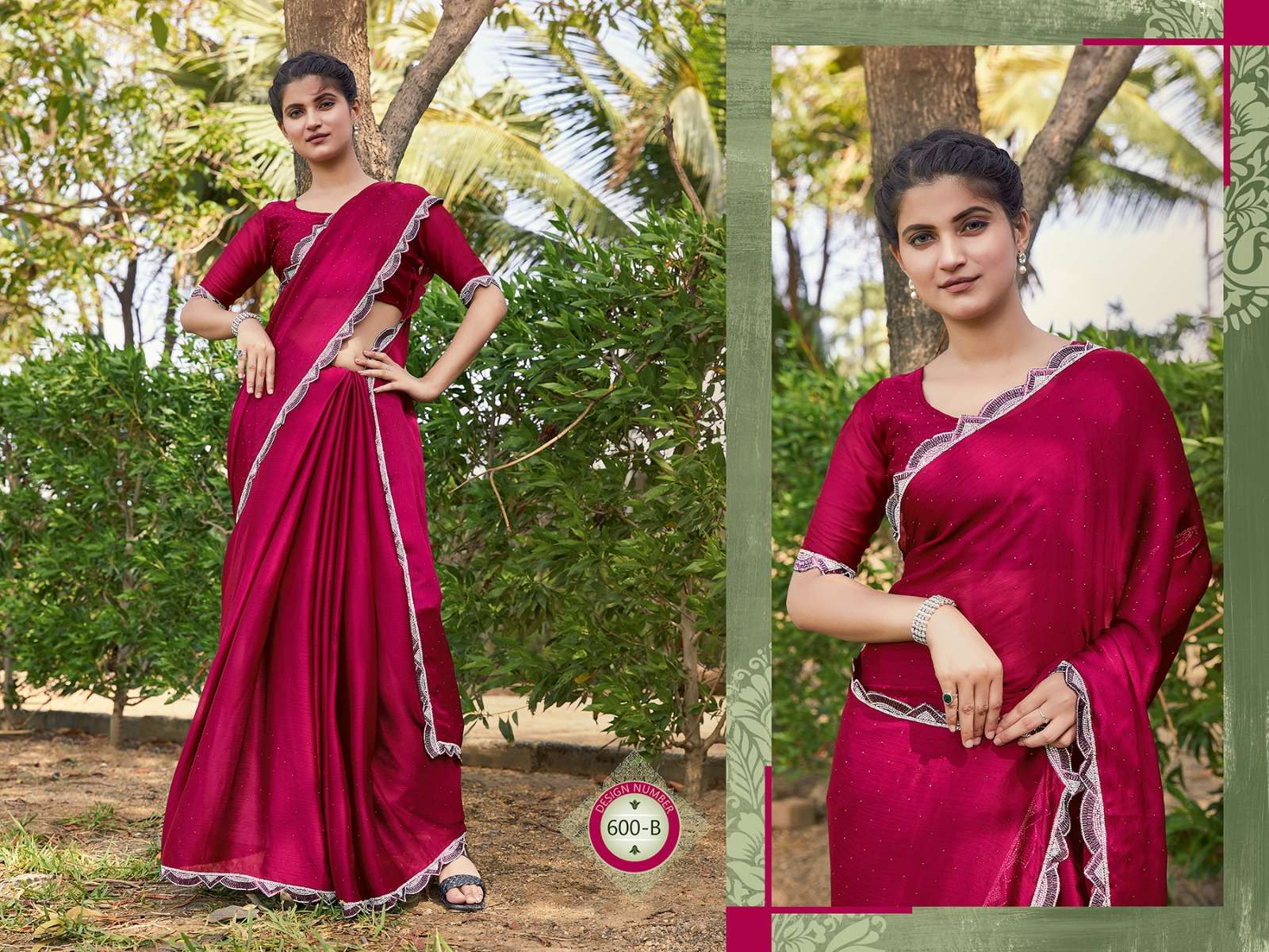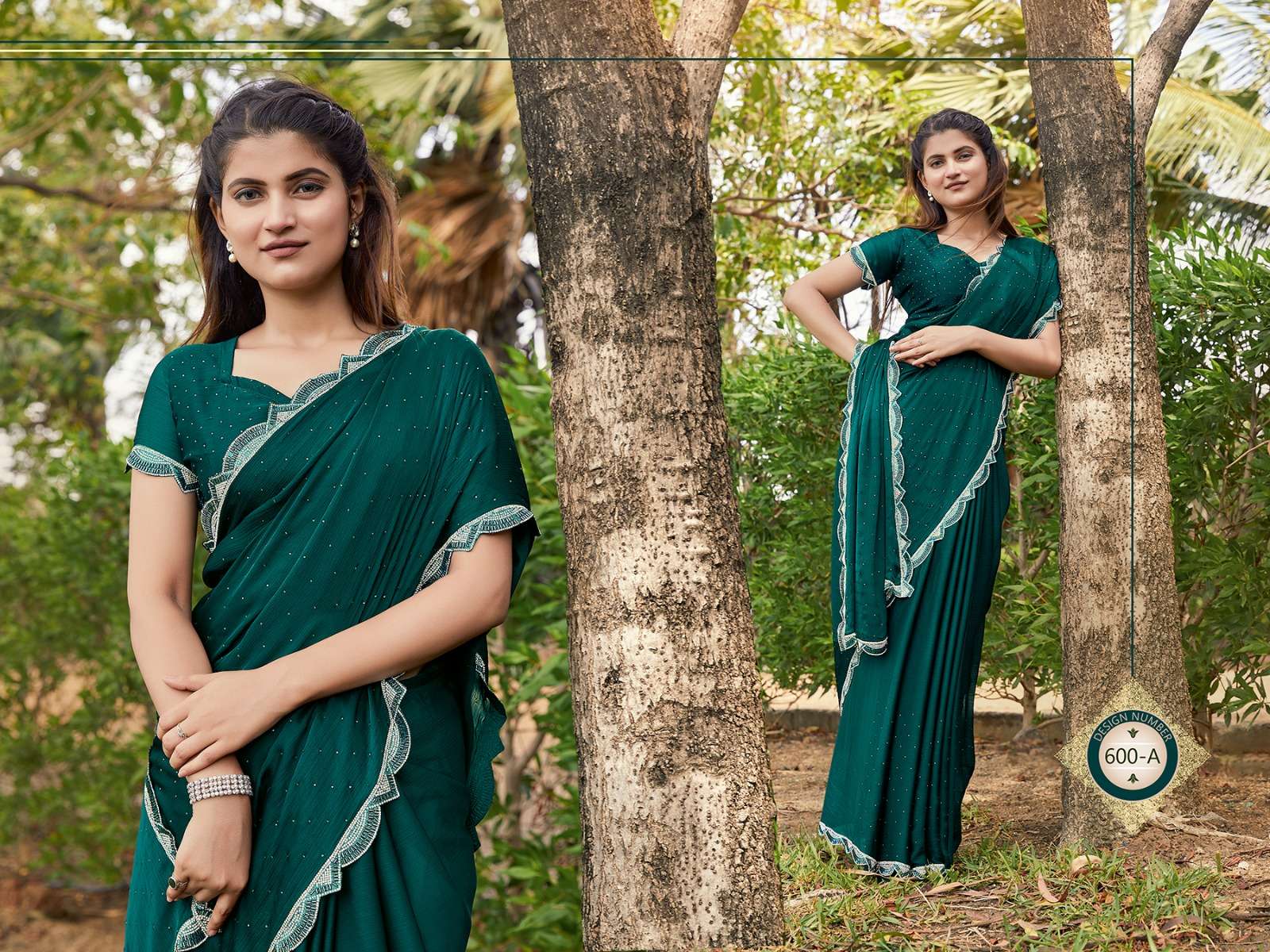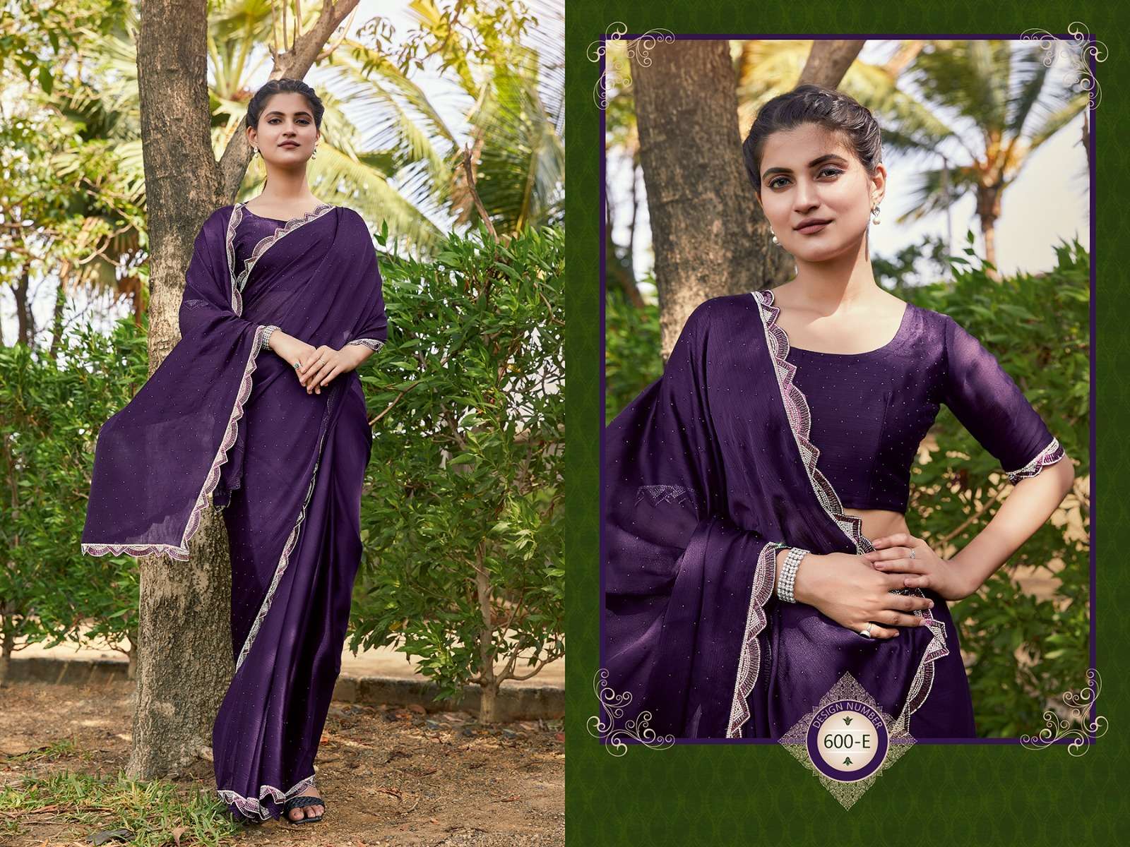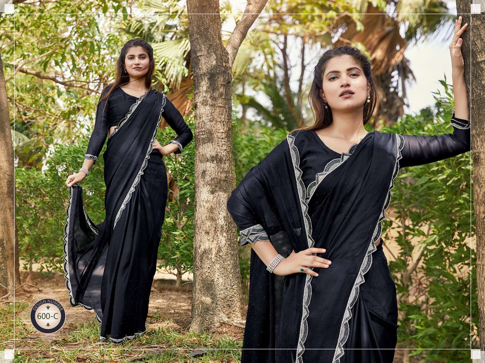 Brand name - MEHAK SAREES SERIES– 600 A to F Total colours - 6 Saree fabric - satin silk chiffon. Work - Tone to tone diamond swroski work in all over saree and jerquen hand work in border Blouses- Satin silk chiffon with swroski back front and hand work sleeves |