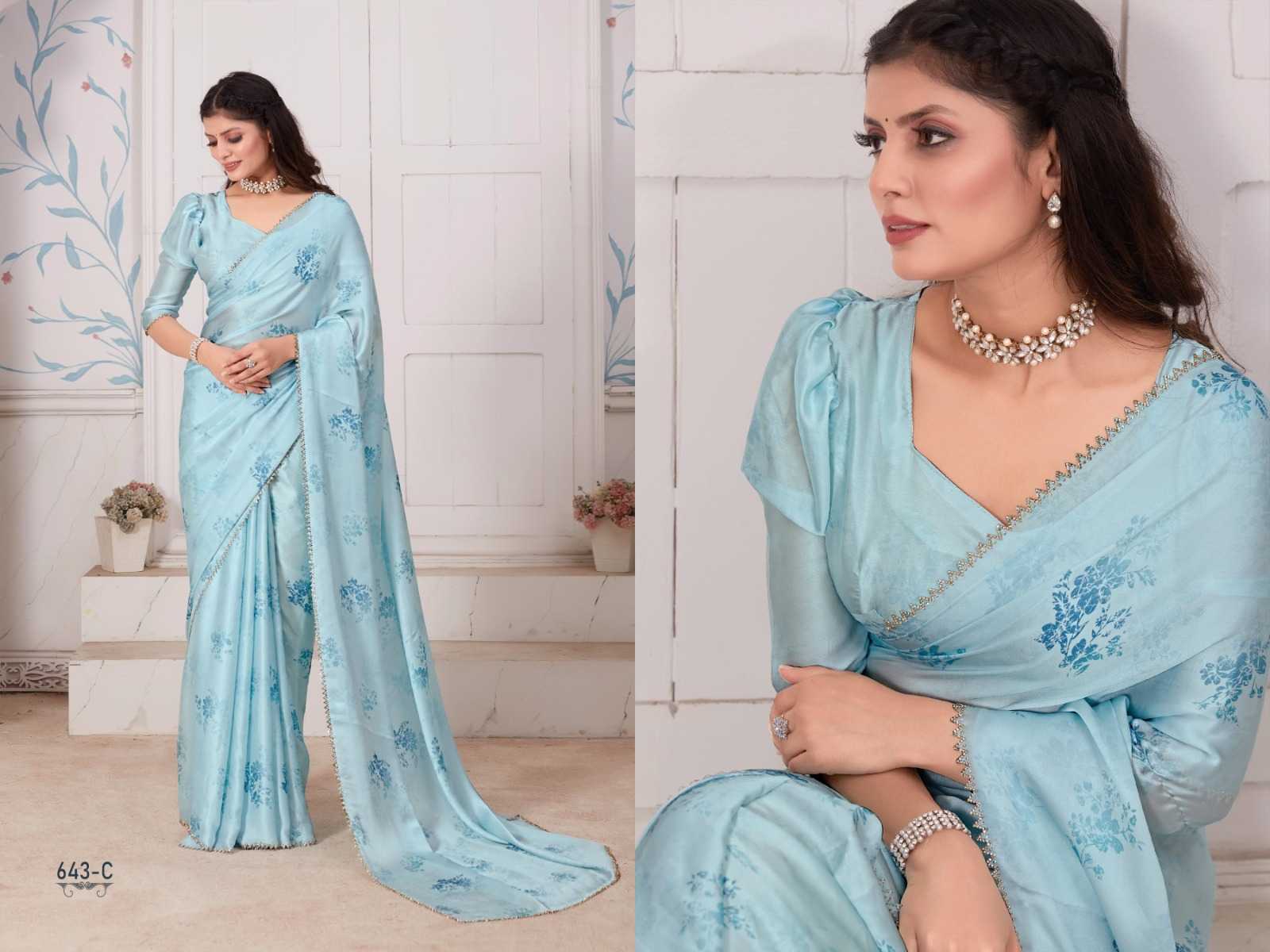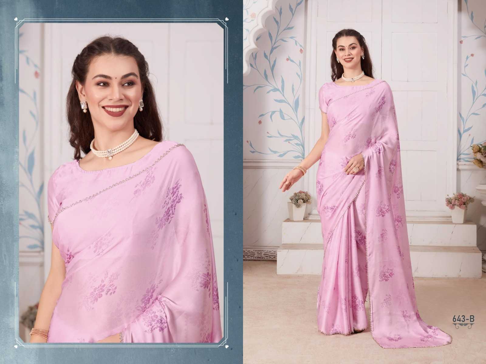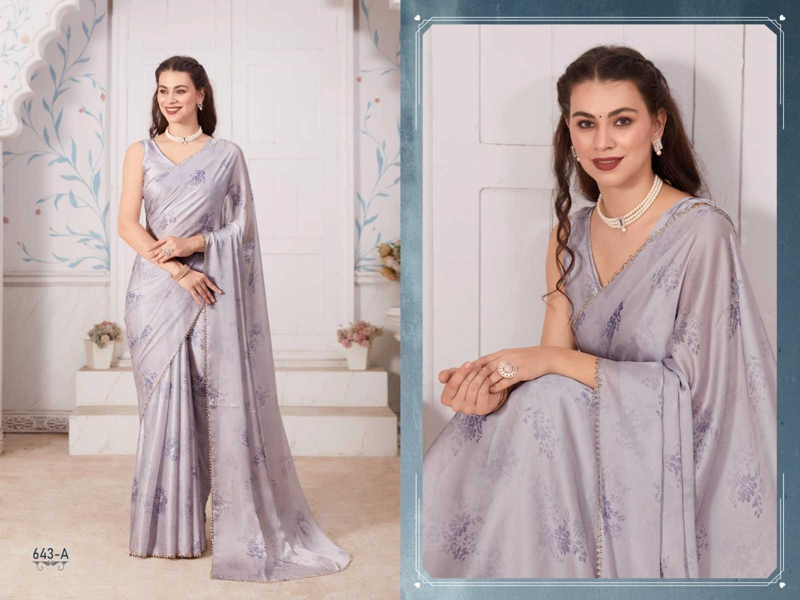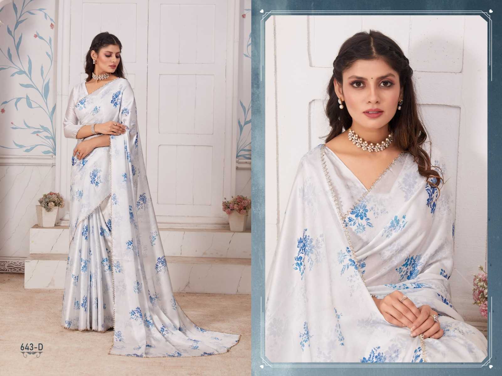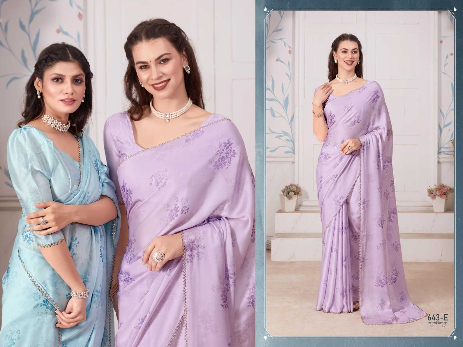 Brand Name – Mehek Catalog : Mahek D.No. 643A TO 643E 5 colours Saree Fabric : Rate : 1750/- Gst 5% Extra Book Your Order Now |