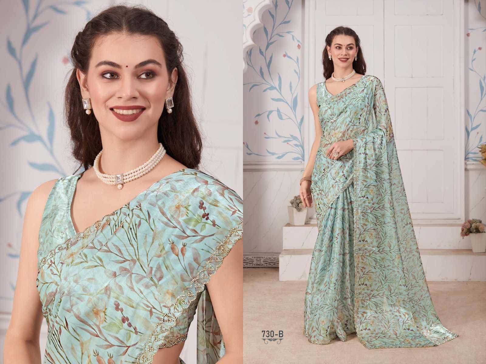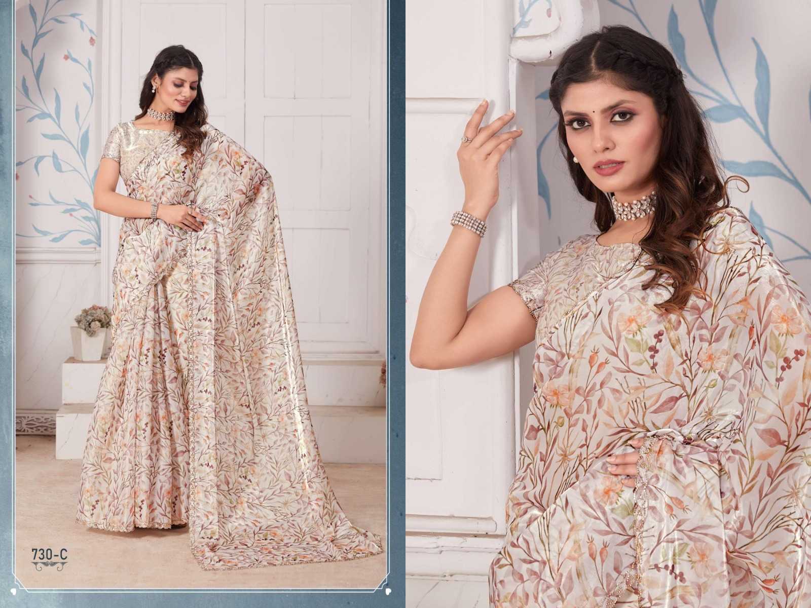 Brand name - MEHAK SAREES SERIES– 730 A - D Total colours - 4 PRICE - 1750 Soft Jimmy Chhoo Digital Print Fabric with Hand Zircon Cutwork Border Same Fabric Running Blouse with Zircon Border |