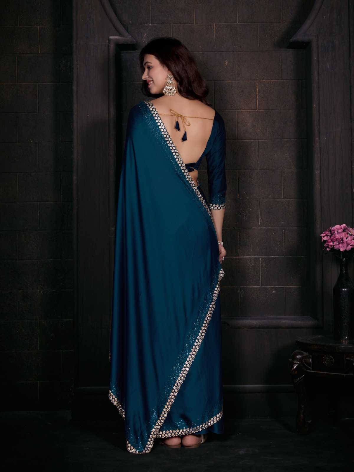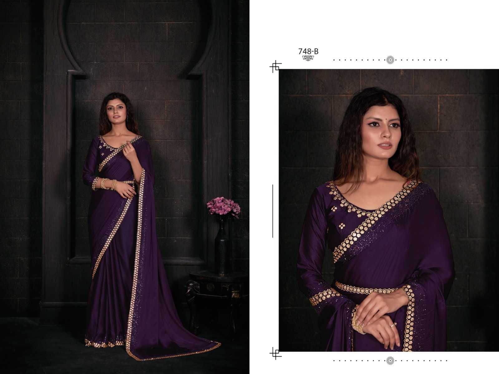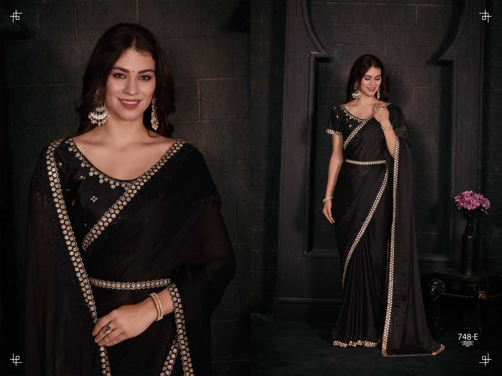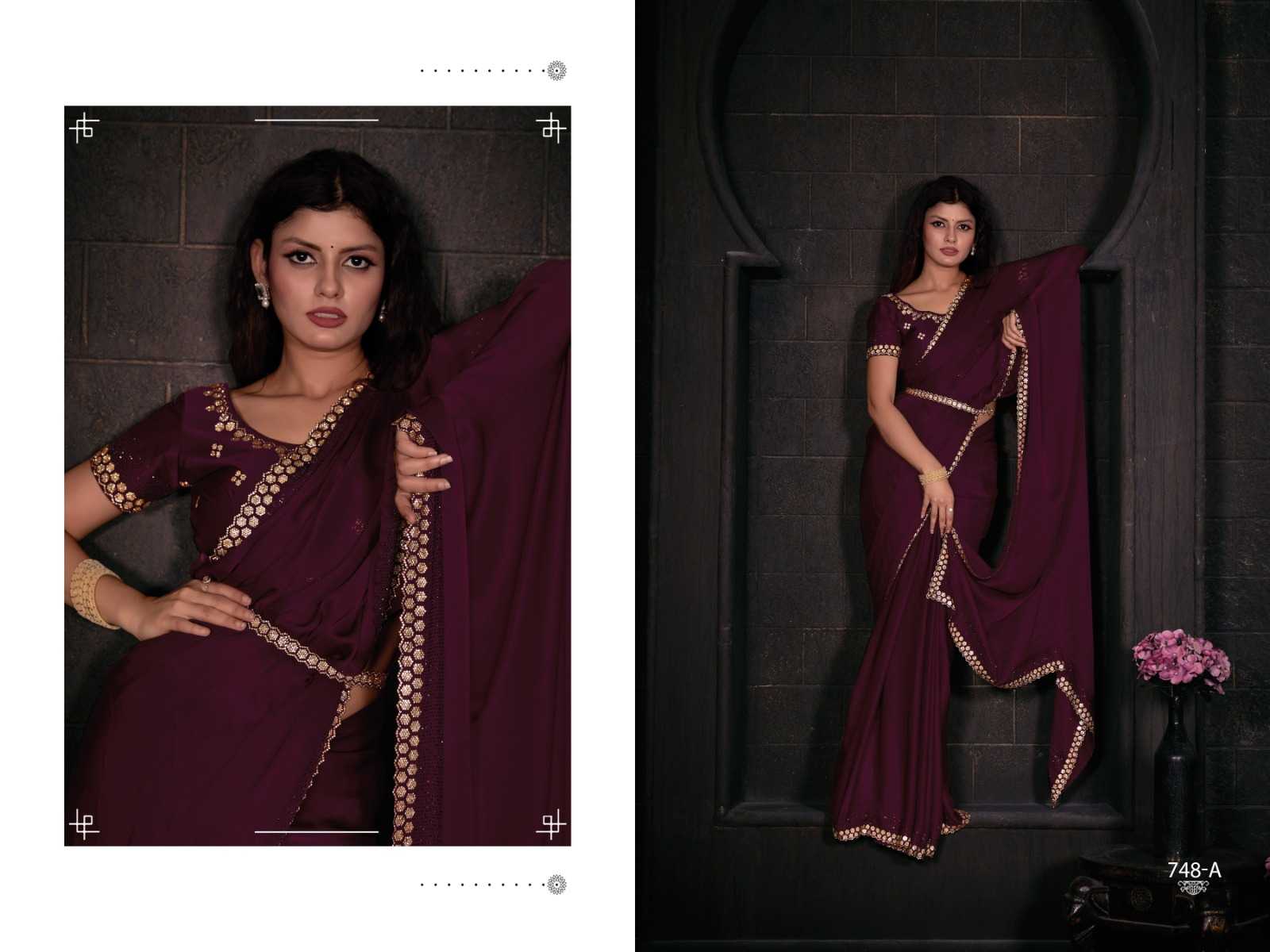 Brand Name – Mehak Catalog : Mahek D.No. 748A To 748F Colour 6 FABRIC: Pure Satin Georgette Blooming Fabric with Heavy Handwork Zircon Cutwork Border ] Same Fabric Running Blouse with Heavy Zircon Work and Belt Rate : 2795/- Gst 5% Extra Occasion : wedding, party ,event |