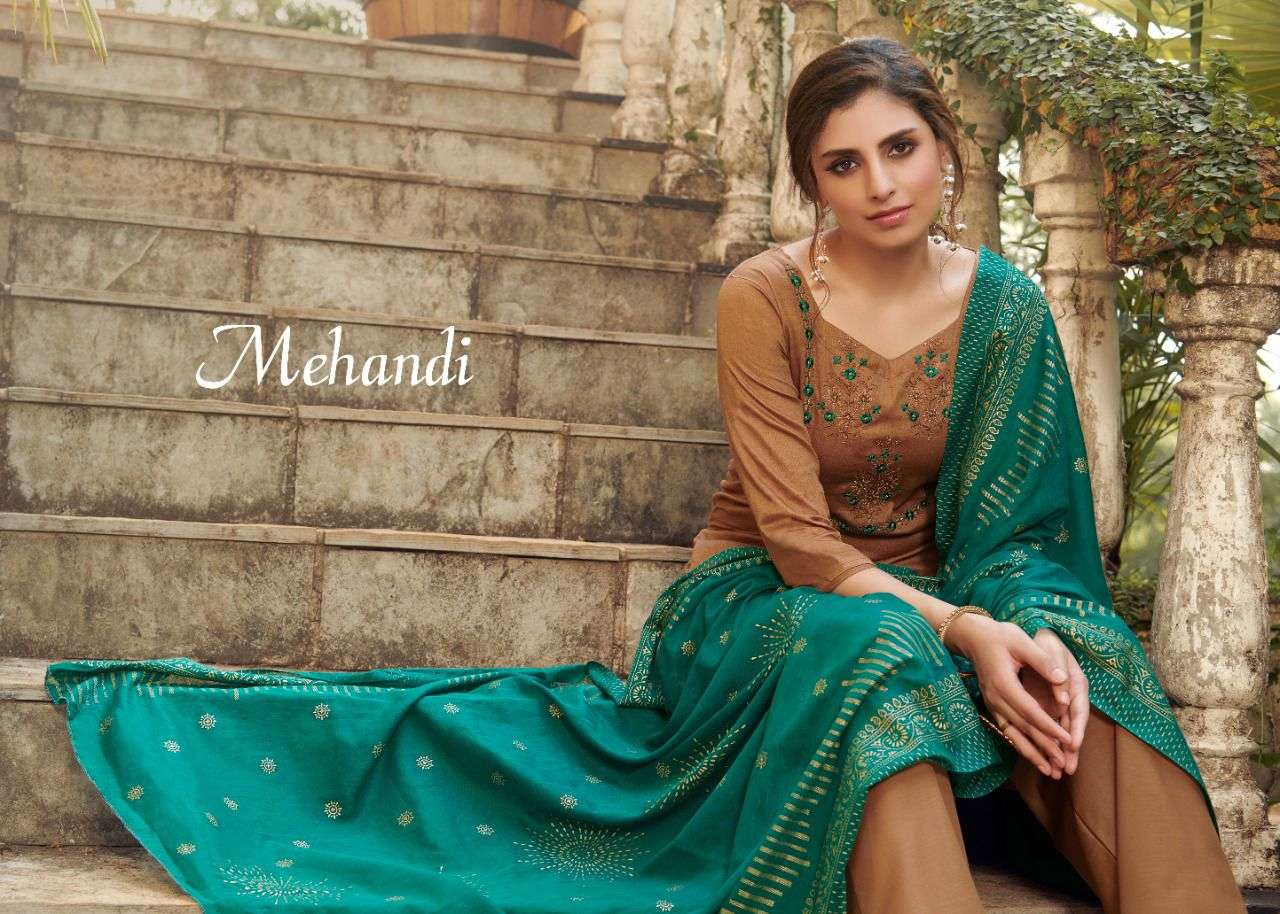 . 7️⃣ CLOUDS®️ Presents 👗MEHANDI👗 Top: PURE ZAAM PRINT WITH KASHMIRI EMBROIDERY Bottom: SEMI LOAN Dupatta: PURE MULL COTTON PRINT Designs: 8 PCS Ex. Mill Rate - 695 |