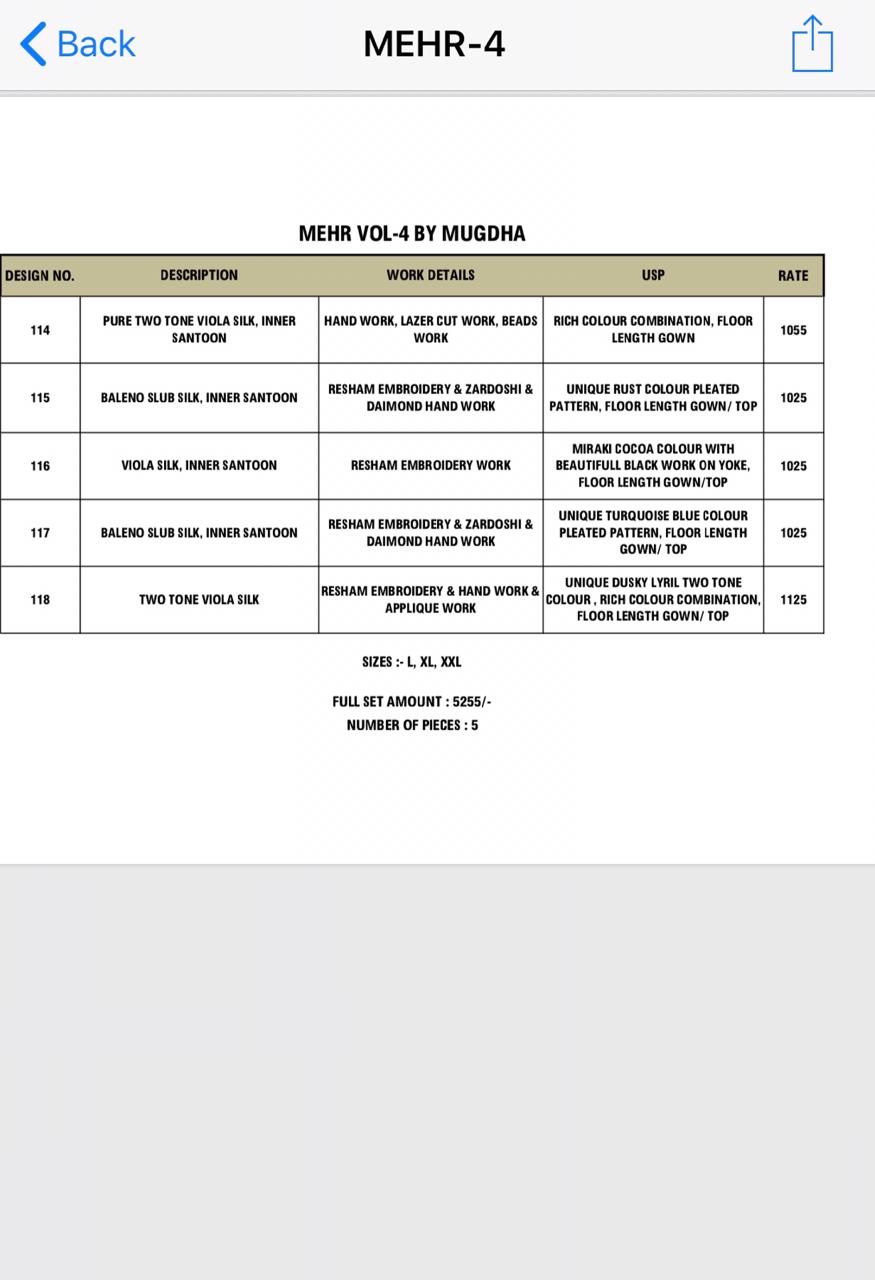 Brand - Mugdha . Catlog name - MEHER VOL -4. Size - L , XL & XXL. Set To Set. GST Extra . Delivery 4-5 days . |