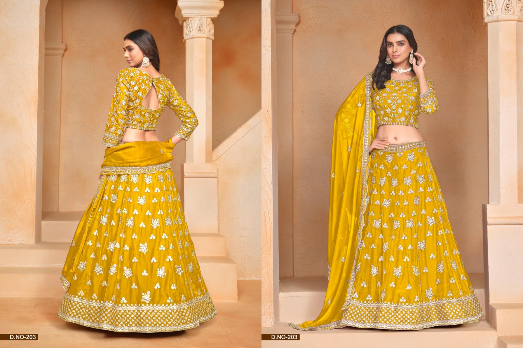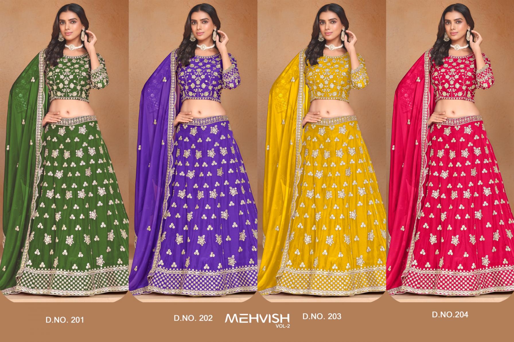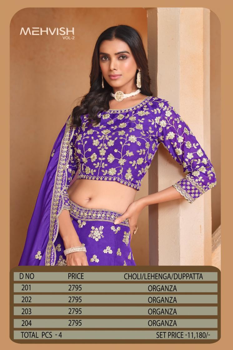 Brand : Mehvish Catalog Name : Mehvish Vol -2 Series : 201-204 Lehenga Fabric : Organza With Heavy Work (Unstitched) Blouse : Organza With Heavy Work 0 .80 Meter Dupatta Organza 2.00 Meter Rate : 2795/- +12% Gst Occasion: Party Wear,Festival Wear |