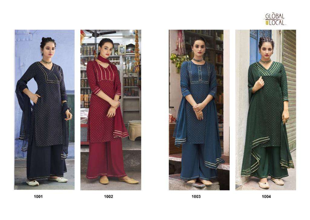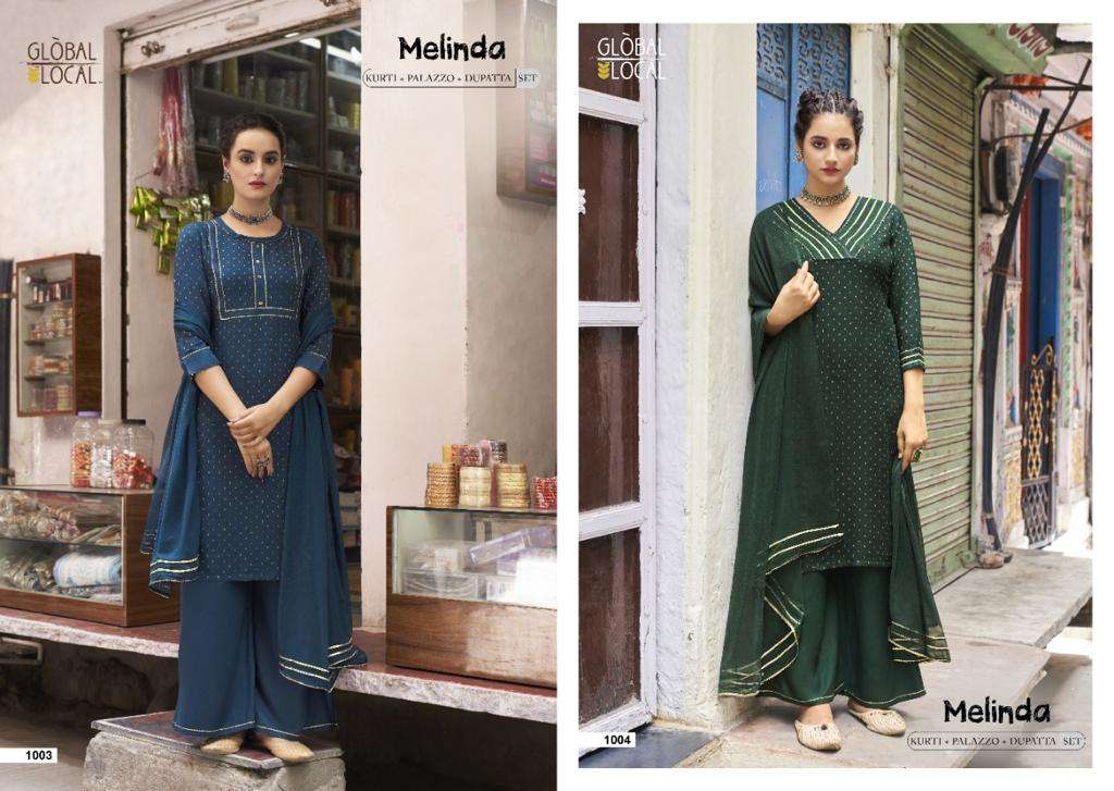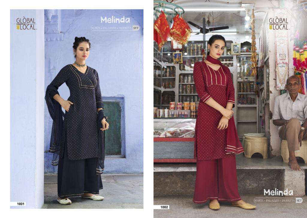 Catalog : MELINDA kurtis with palazzo & dupatta 3 piece readymade set BRAND : GLOBAL LOCAL™ TYPE : 100% golden Dobby stylish Rayon Kurtis with pocket, 100% Rayon fabric Palazzo, & chiffon dupatta with lace deatailing SIZES : S to 3XL |