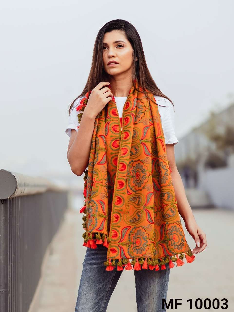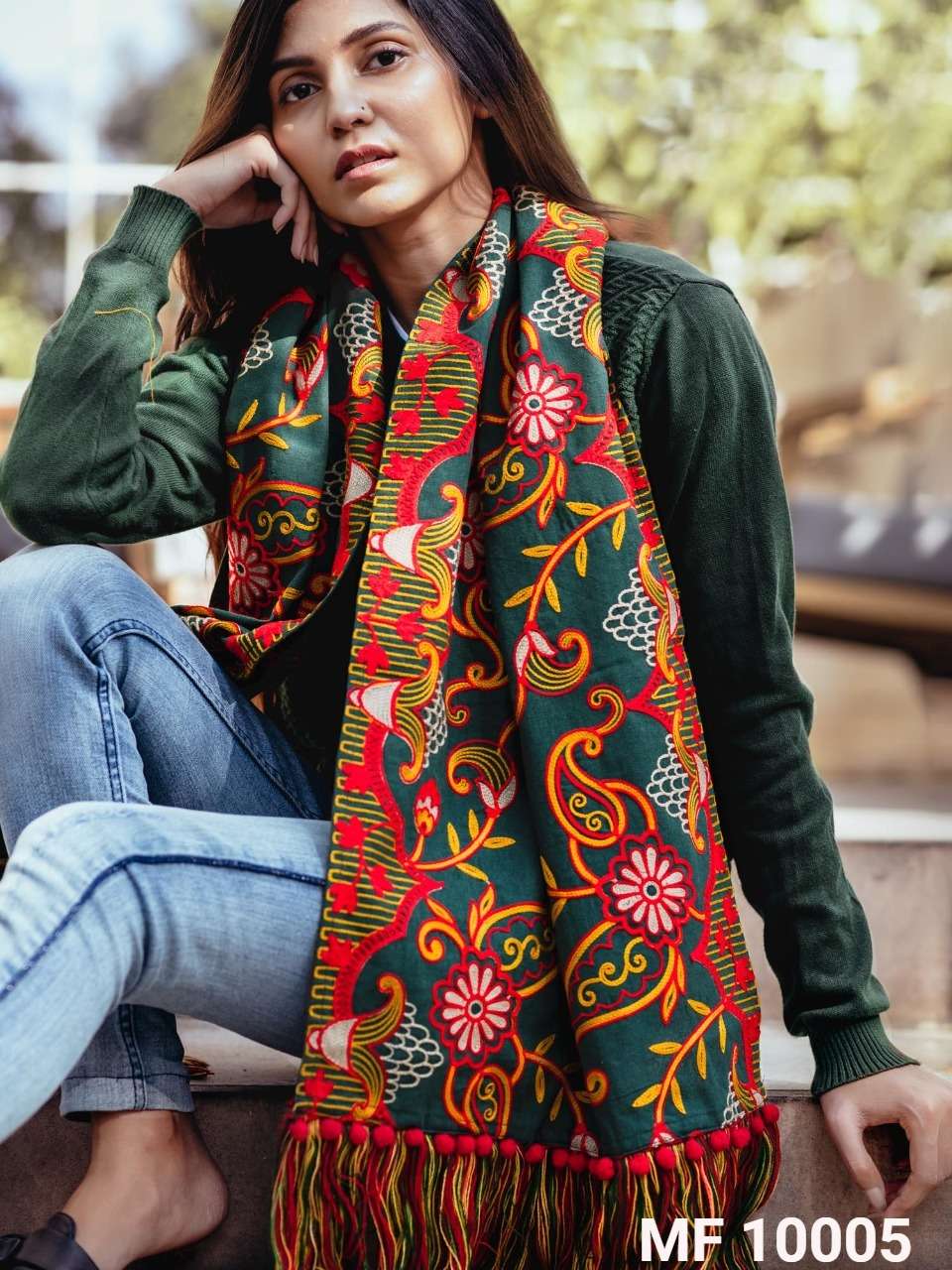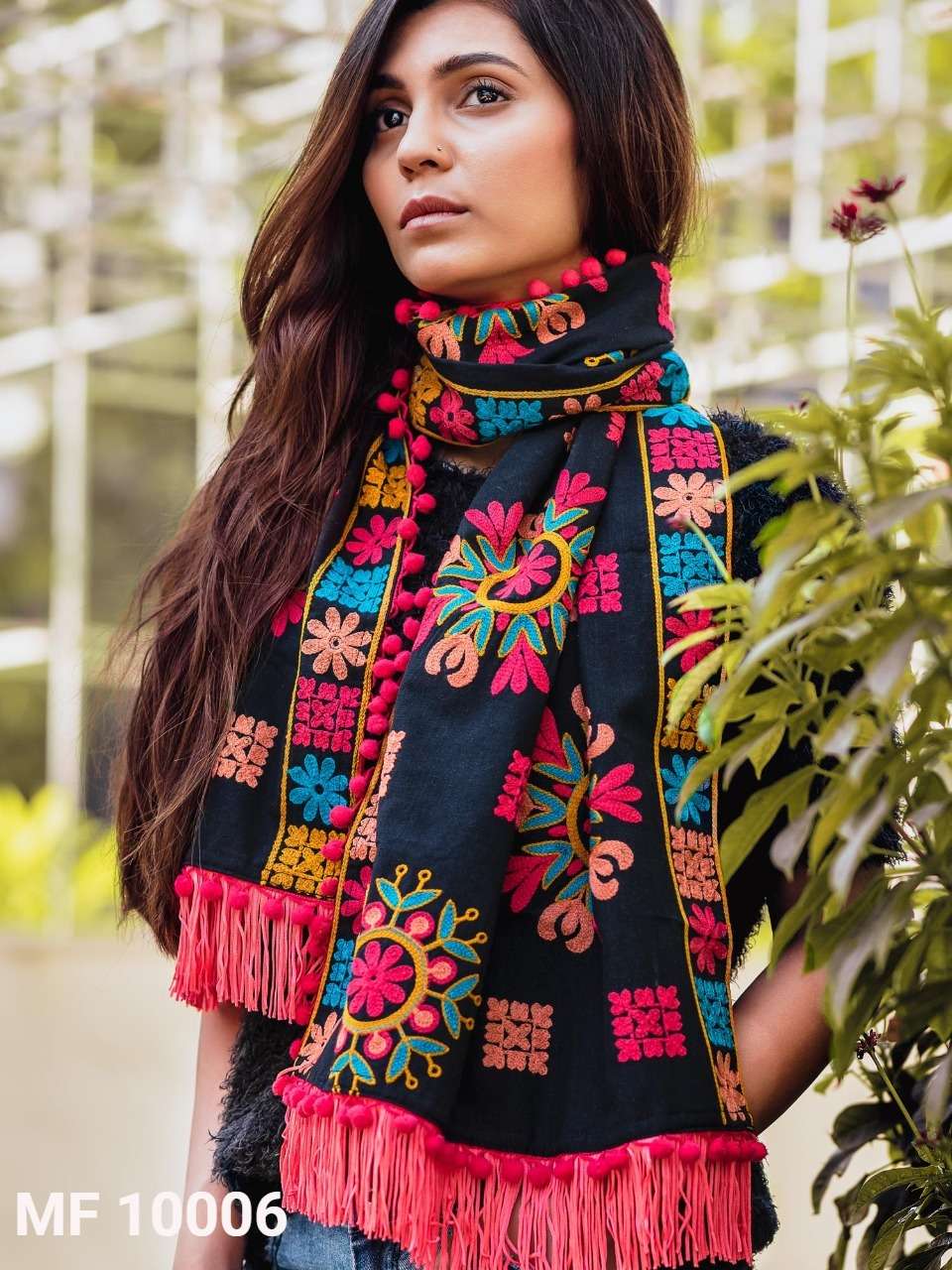 ❄️*Mesmora's Mufflers decorated with long woollen laces and pompom laces. The intricate big motif heavy embroidery design makes it unique and a complete handicraft product. Fabric Dimensions You can wear it on |