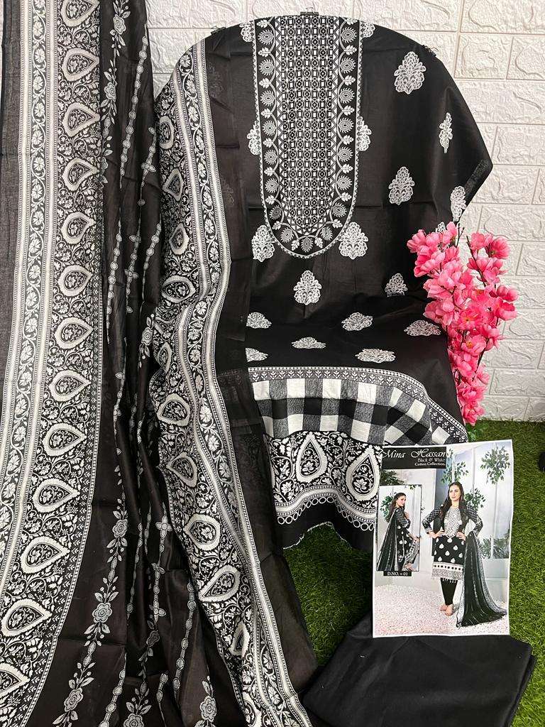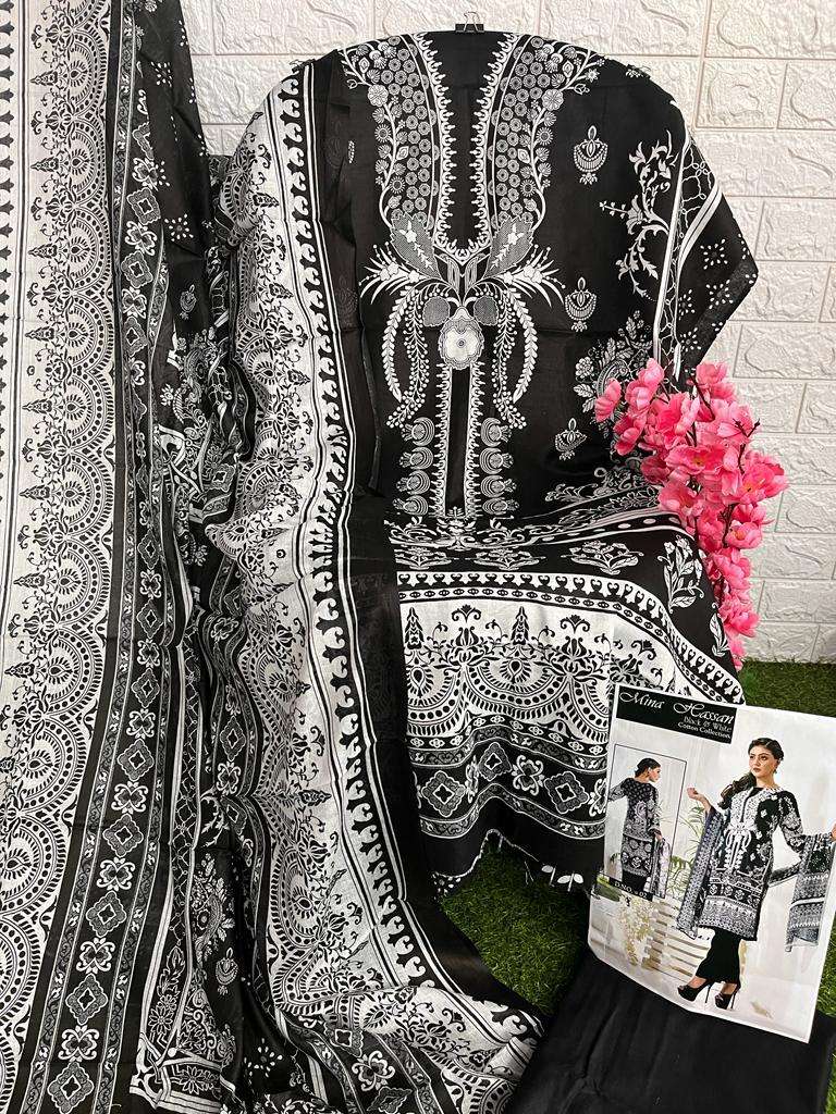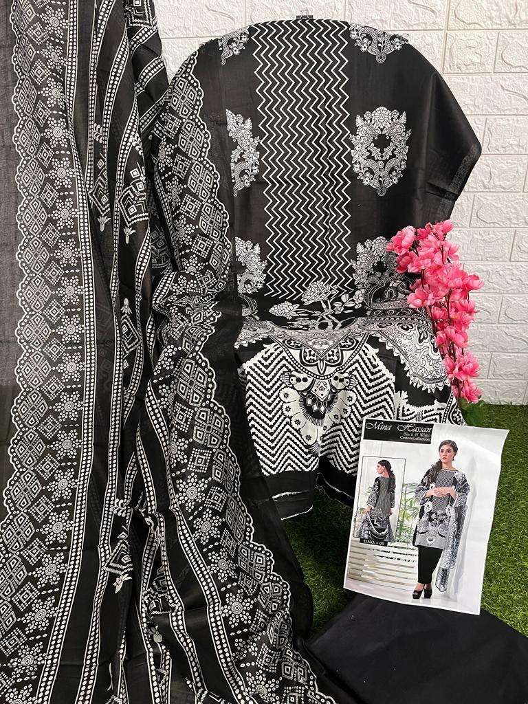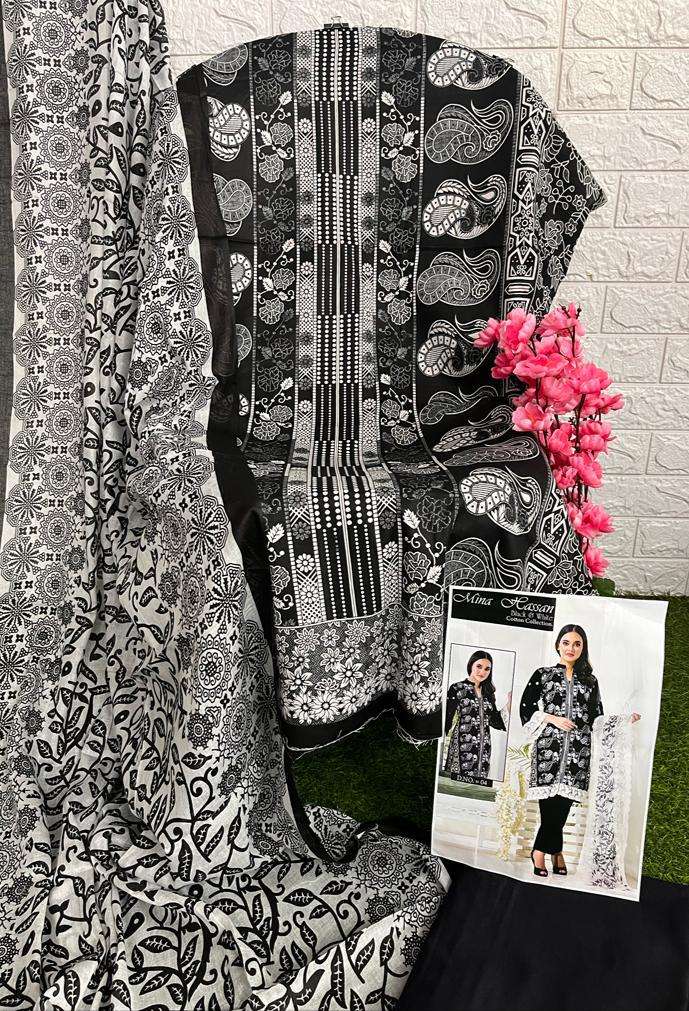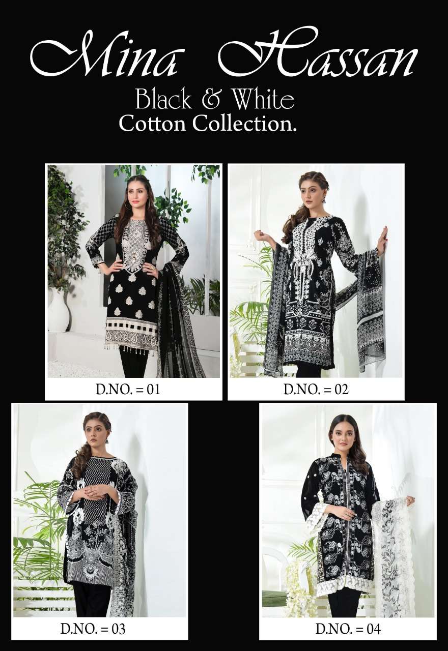 NEW LUNCHING HEAVY COTTON COLLECTION MINA HASSAN BLACK N WHITE COTTON COLLECTION 💫 BOTTOM COTTON 2.00 MTR DUPATTA PRINTED COTTON 2.25 MTR PRICE 389 4 EXCLUSIVE DESIGNS EXCLUSIVE PAUCH 👜 |