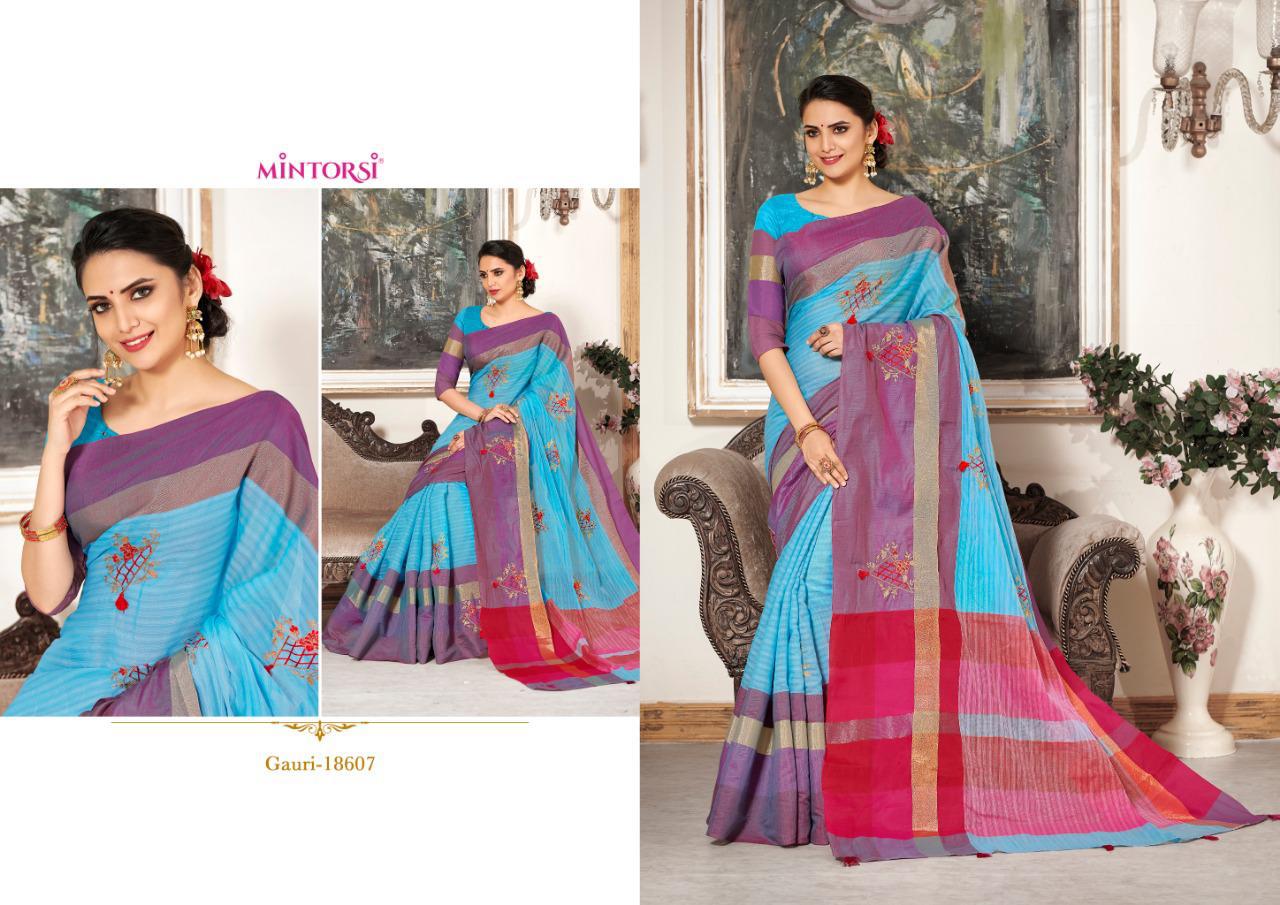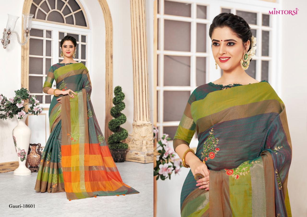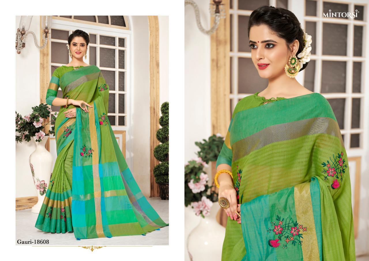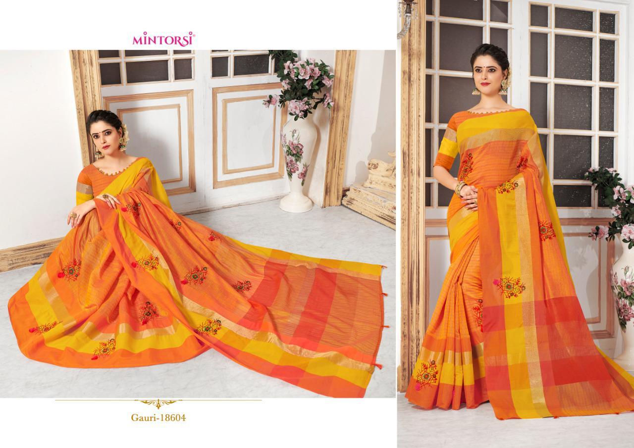 MINTORSI Deeigner Sarees Collection GAURI Fabric - Cotton Silk With Exclusive Embroidery Work Total Design - 8 New . Sereis 18601 to 18608 Per Pcs rate -805+gst 5 Percent Extra. |