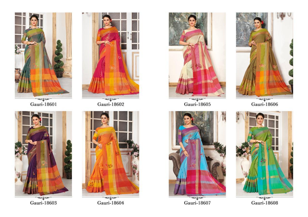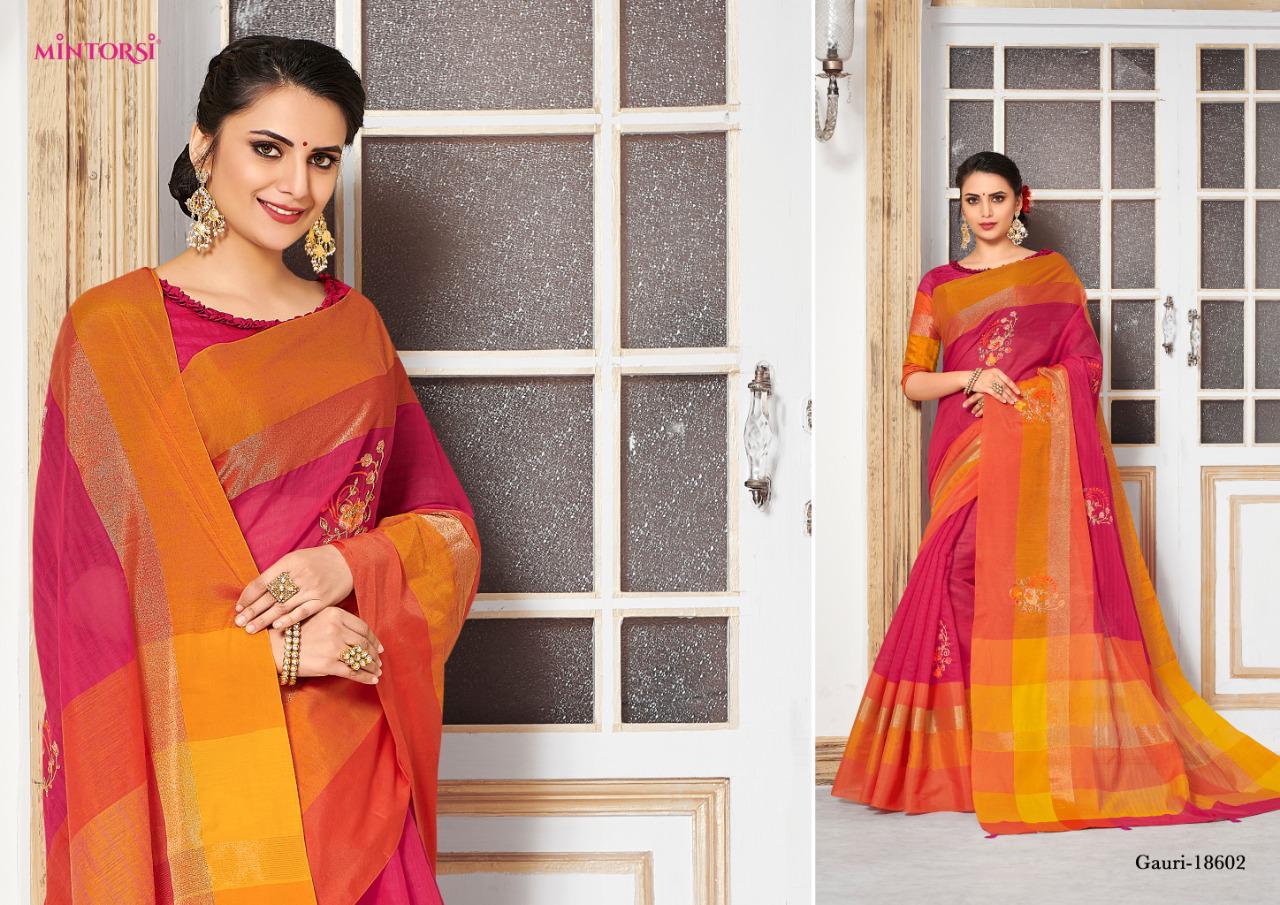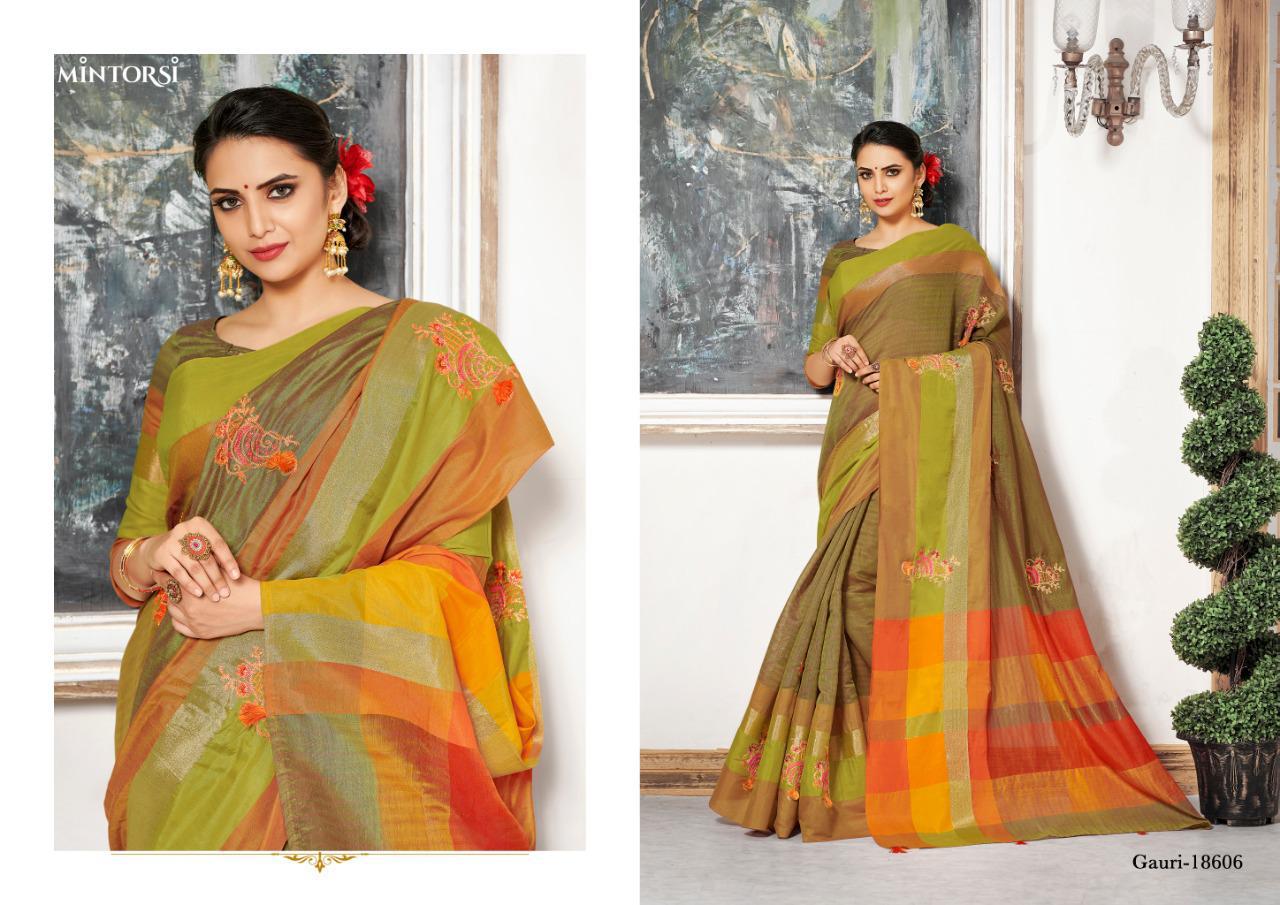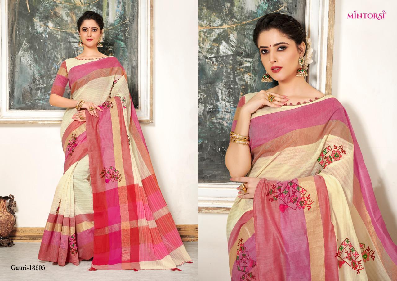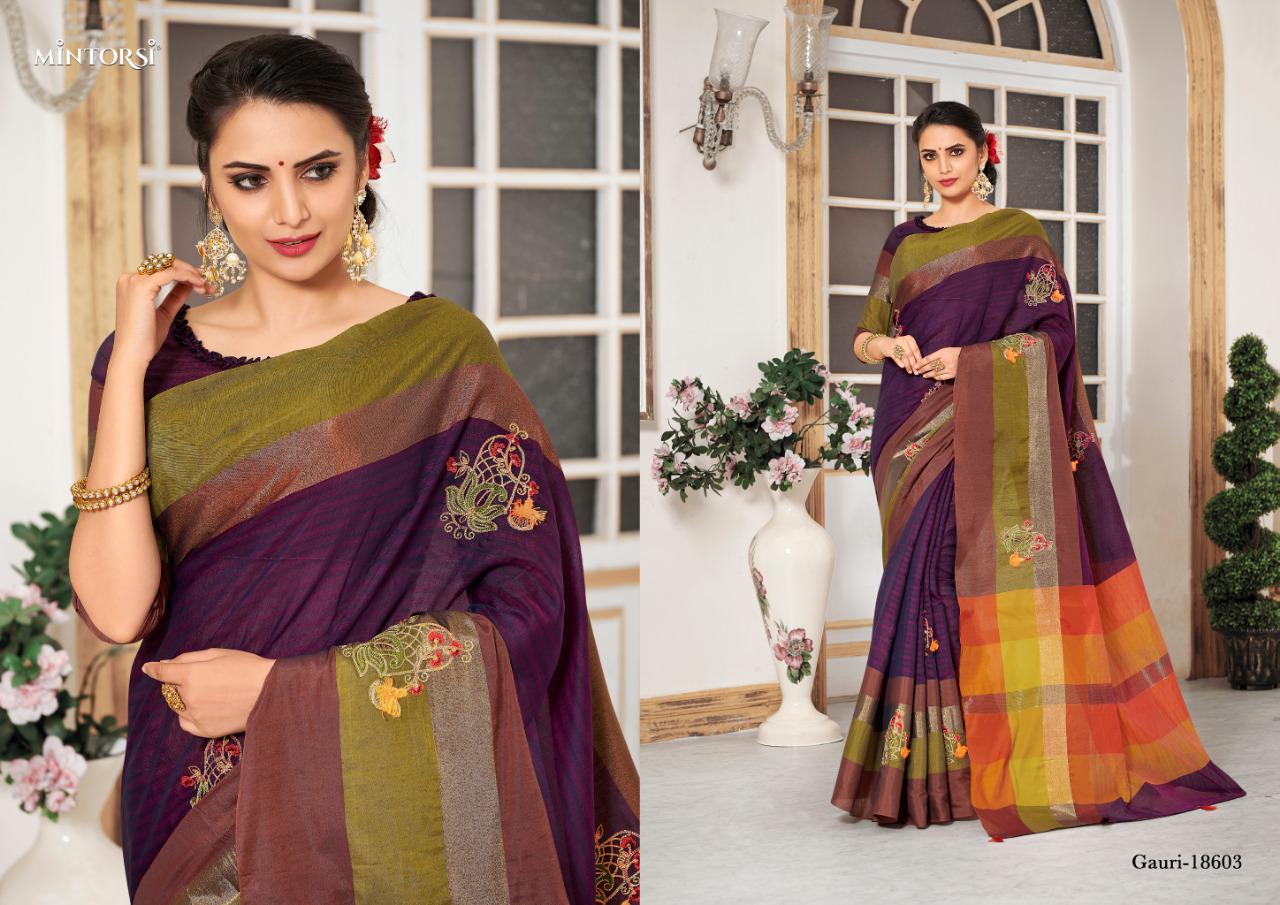 MINTORSI Deeigner Sarees Collection GAURI Fabric - Cotton Silk With Exclusive Embroidery Work Total Design - 8 New . Sereis 18601 to 18608 Per Pcs rate -805+gst 5 Percent Extra. |