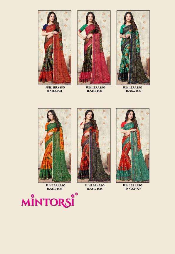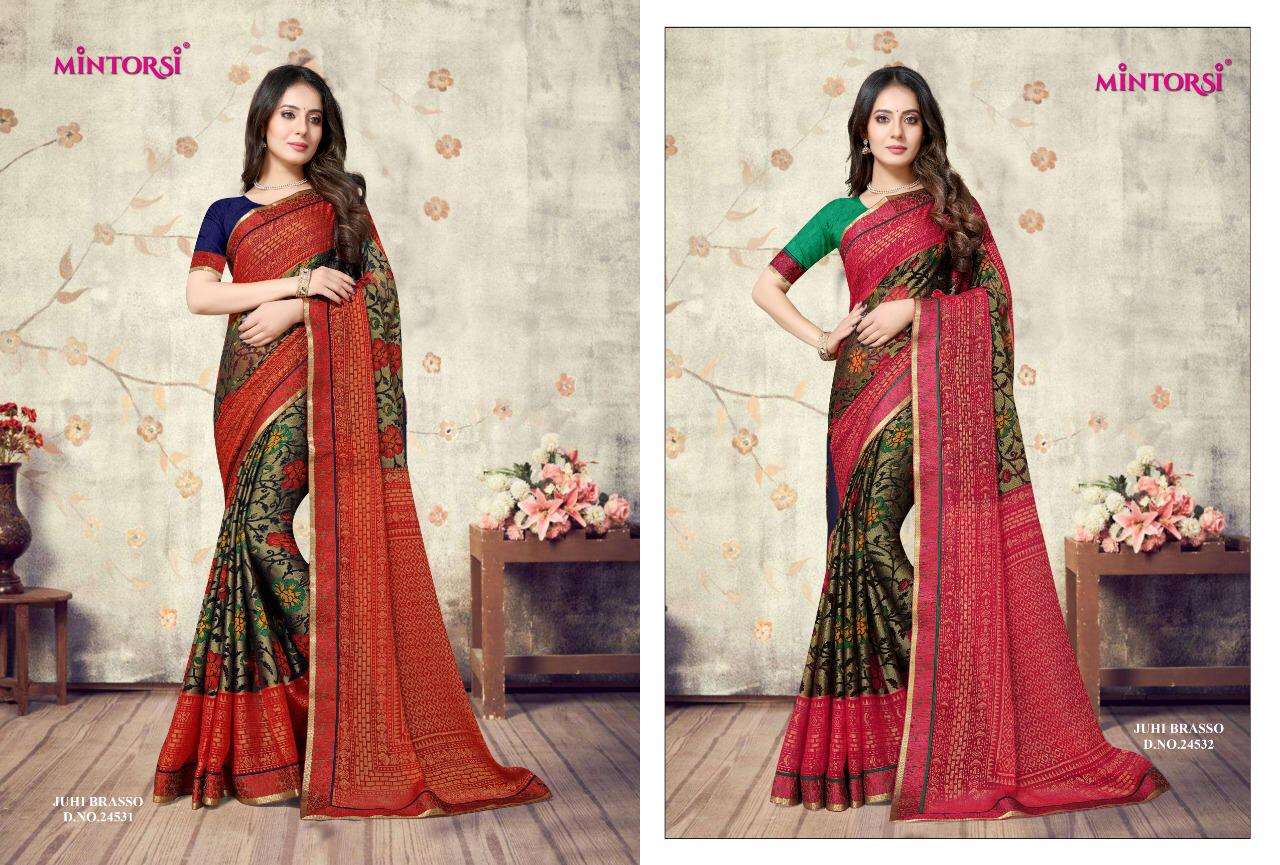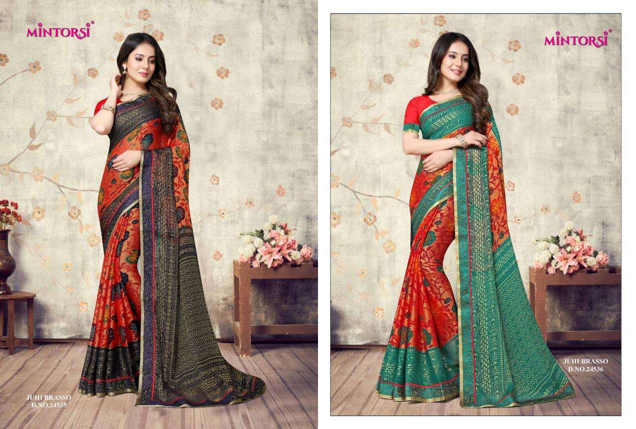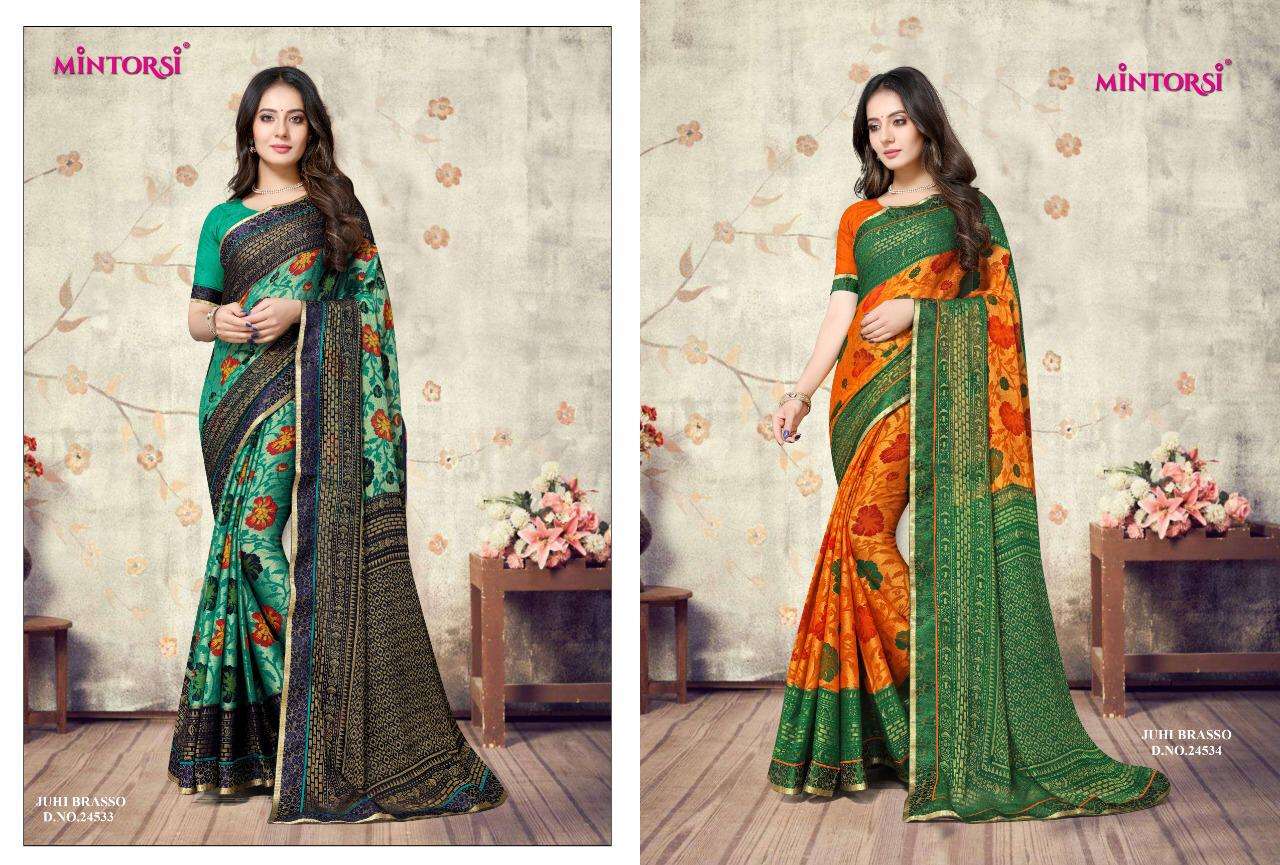 BRAND NAME - MINTORSI  Designer Brasso Sarees CATALOG NAME  - Juhi Brasso SERIES â 24531 TO 24536 Fabric- Chiffon Brasso With exclusive soft banarsi lace Total Design - 6 RATE  - 885/-  per pcs GST 5% EXTRA |