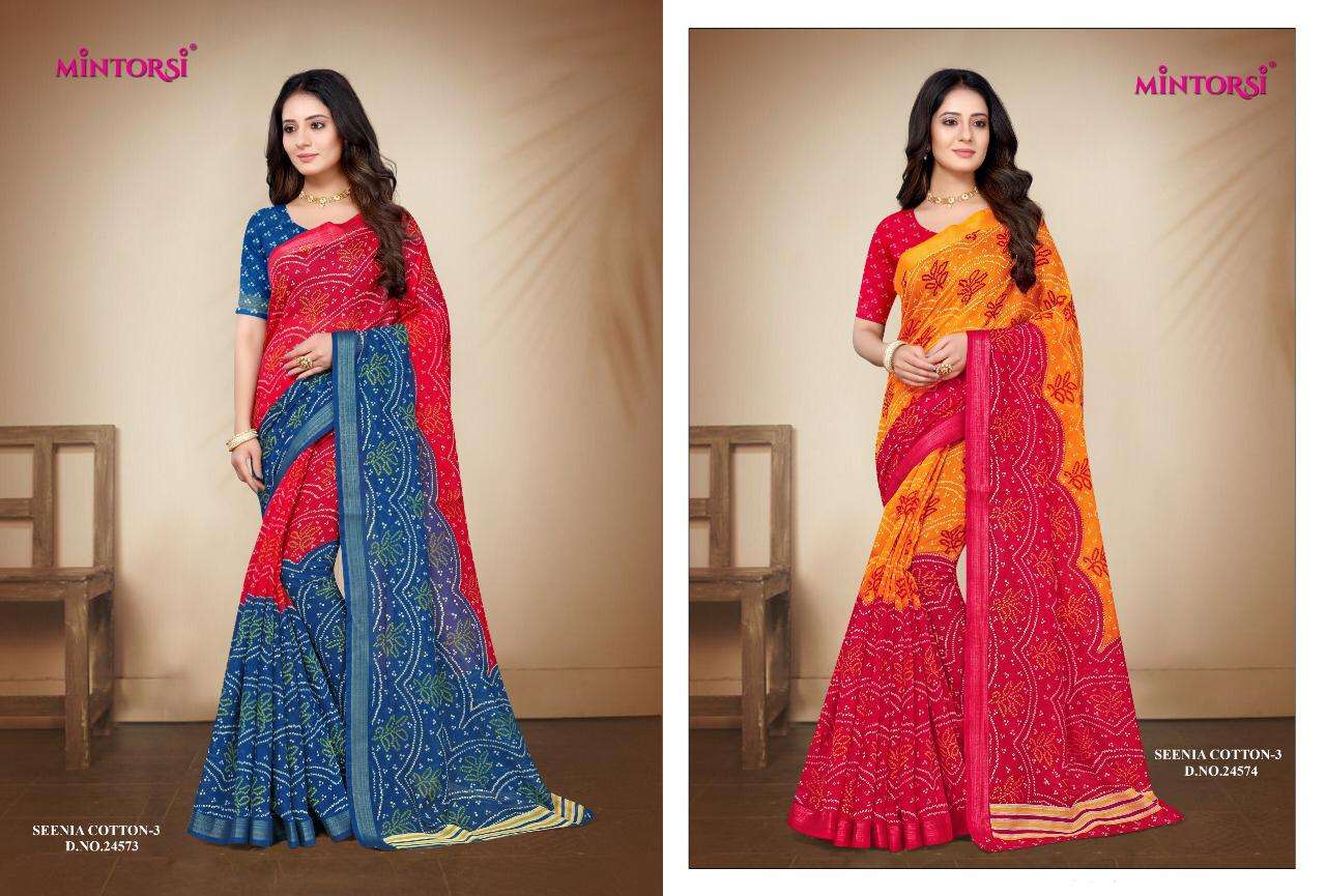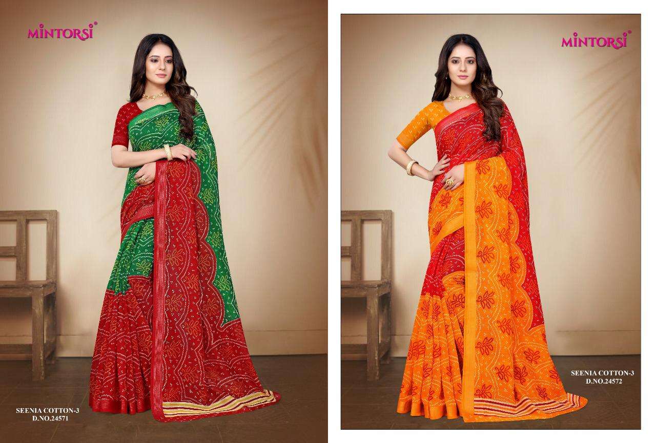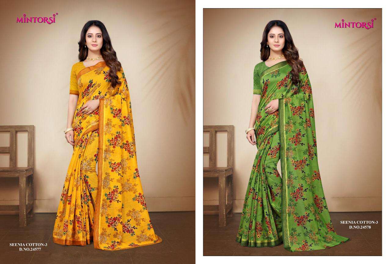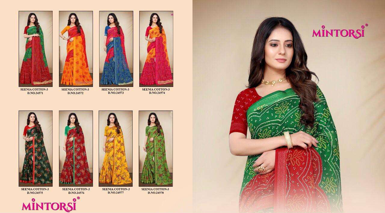 BRAND NAME â MINTORSI CATALOG NAME -  SEENIA COTTON VOL-3 SERIES â 24571 TO 24578 Fabric - Cotton Silk with weave zari border Total Design - 8 RATE â 495/-  per pcs GST 5% EXTRA |