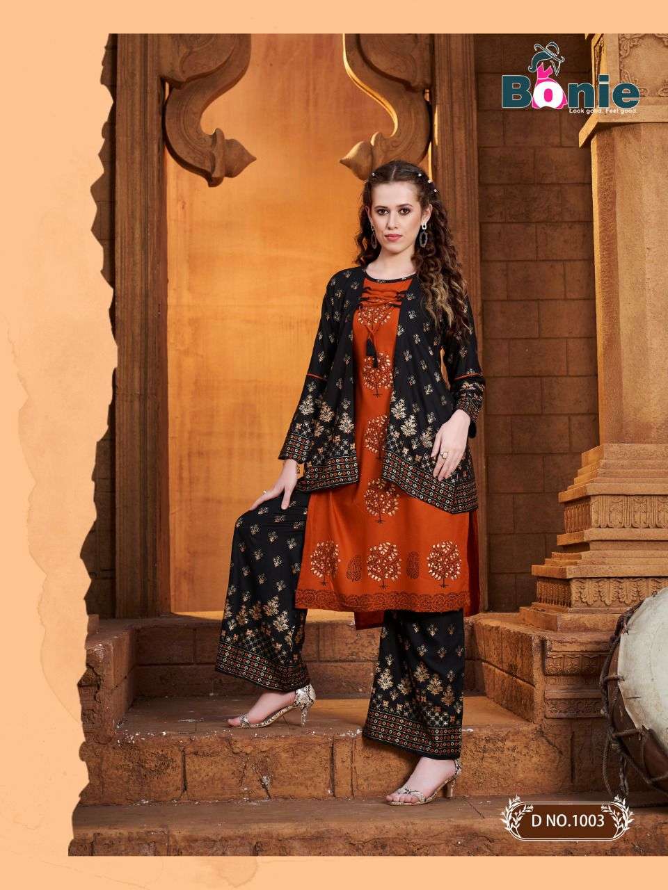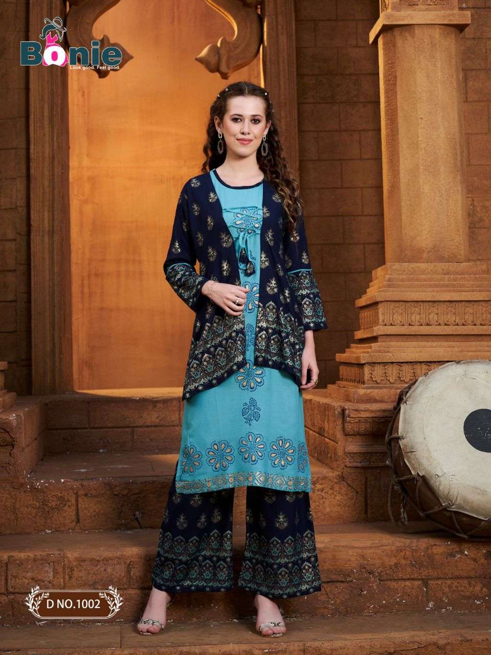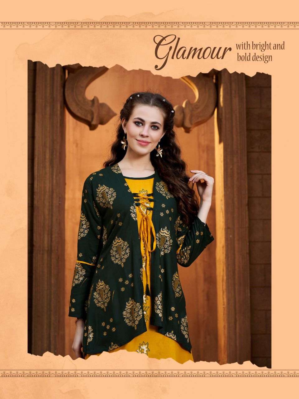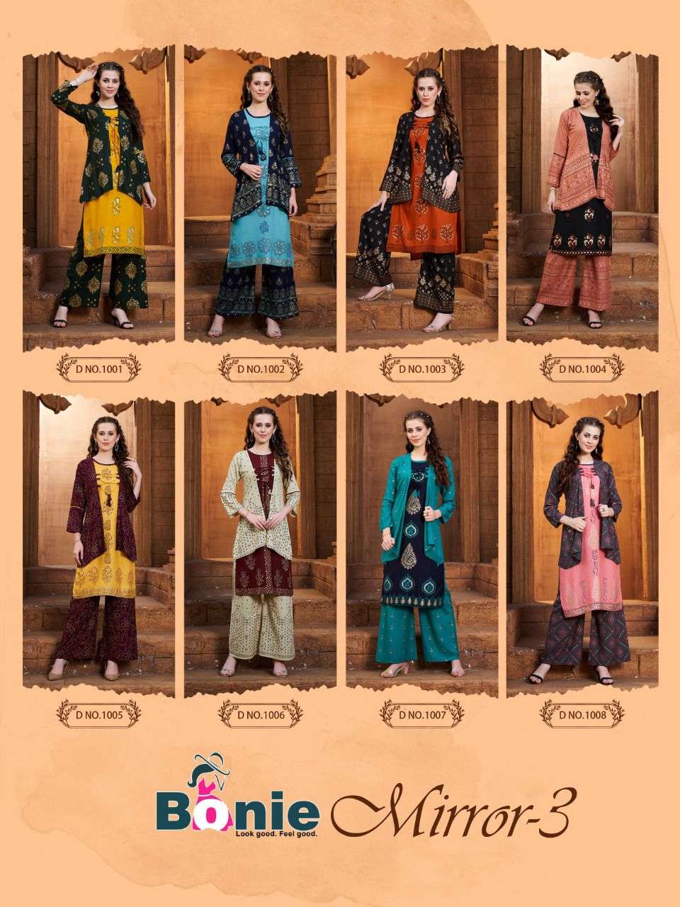 MIRROR 3 BY BONEY HEAVY RAYON KURTI PLAZZO WITH SEPRATE JACKET KURTI CATALOUG