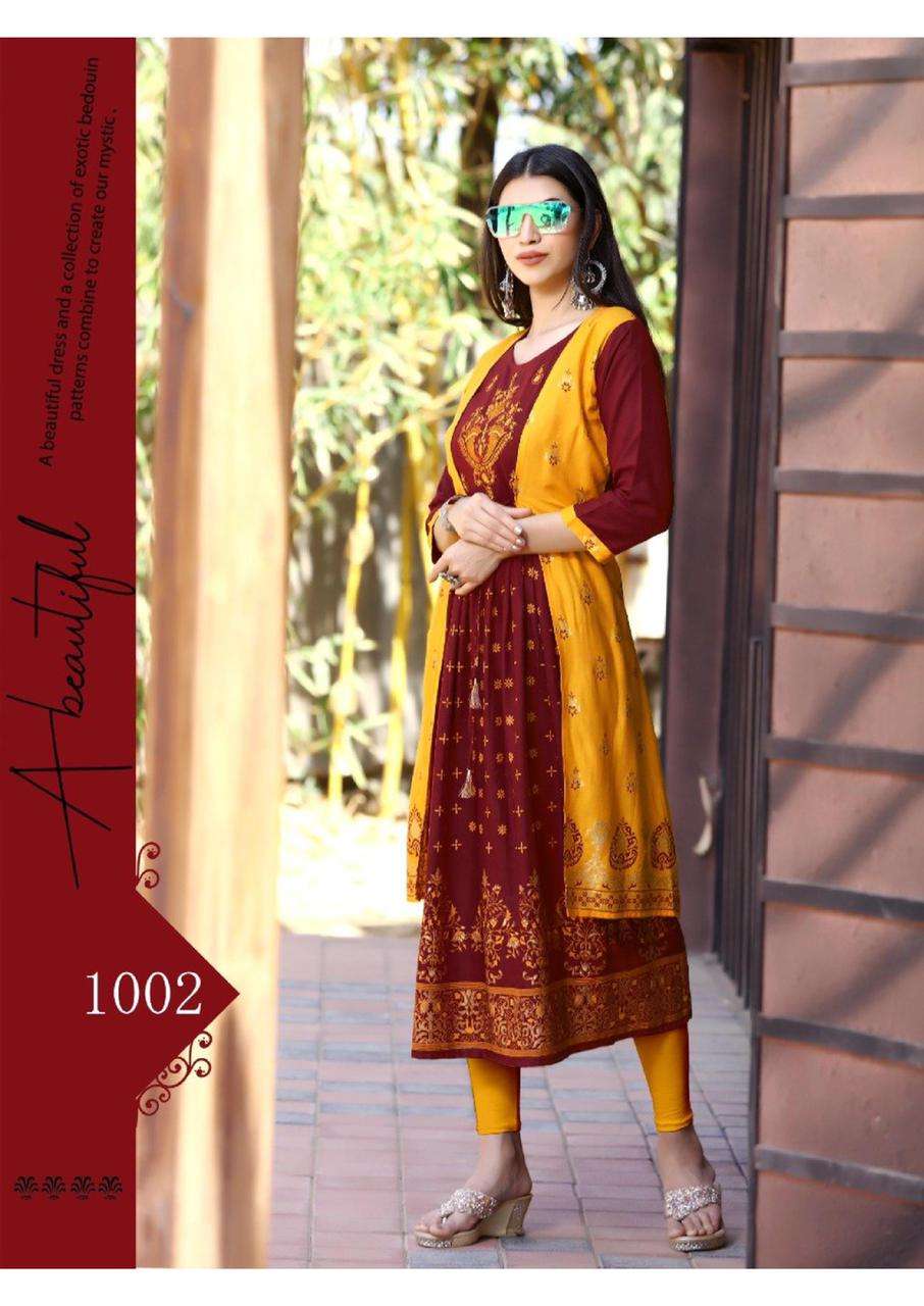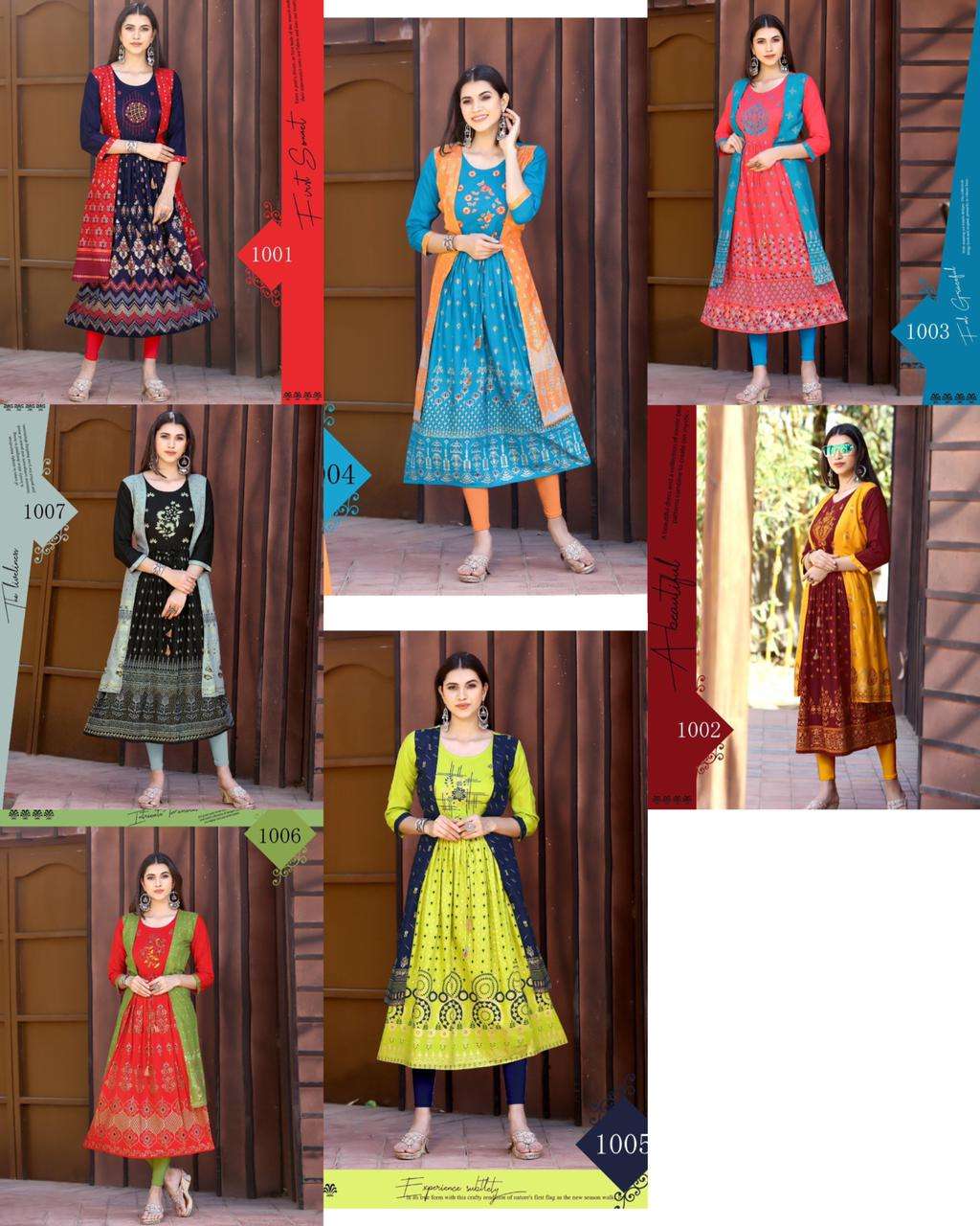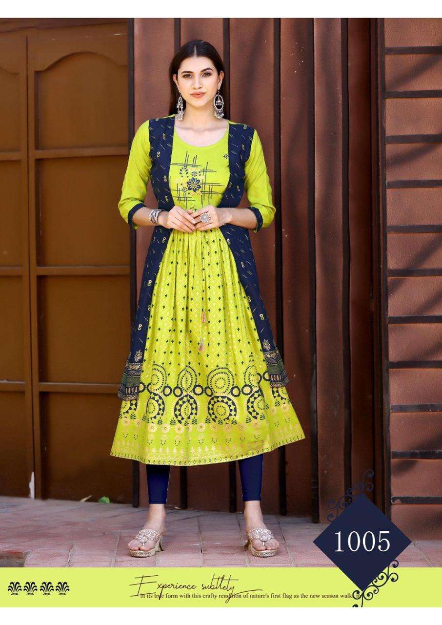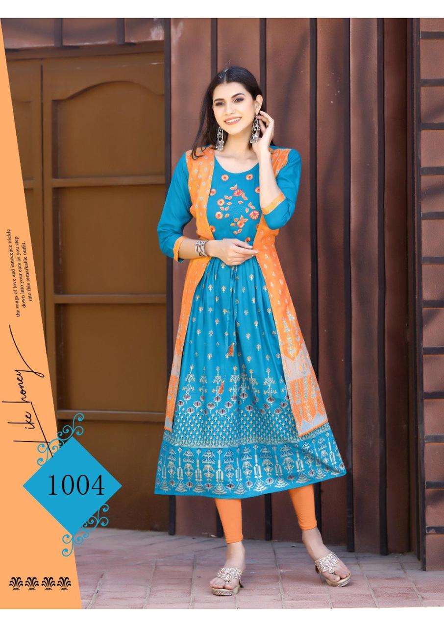 MISTHI BY BEAUTY QUEEN HEAVY RAYON FOIL GOLD PRINT FRONT-BACK / JACKET MODEL KURTI CATALOG WHOLESALER BEST RATE
