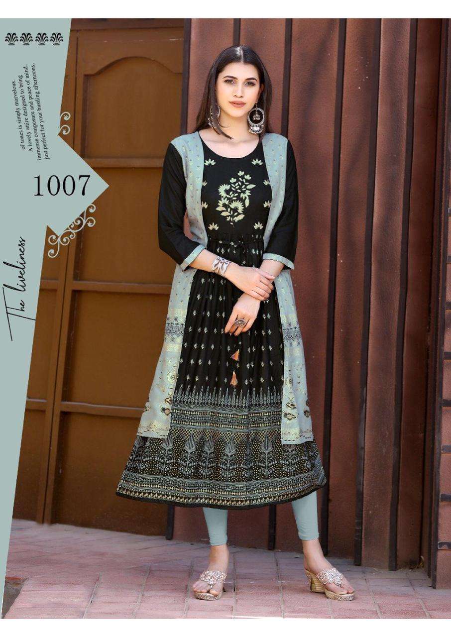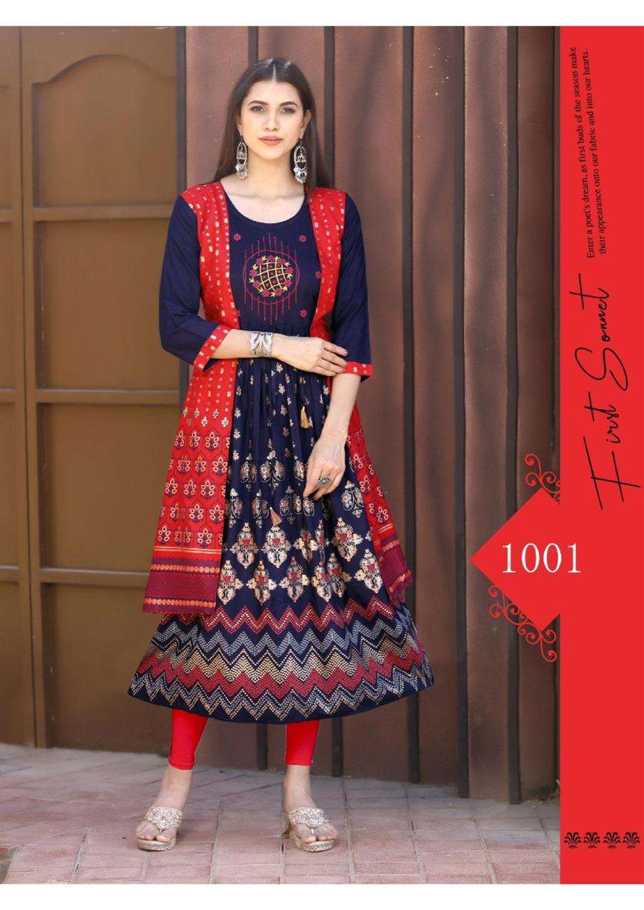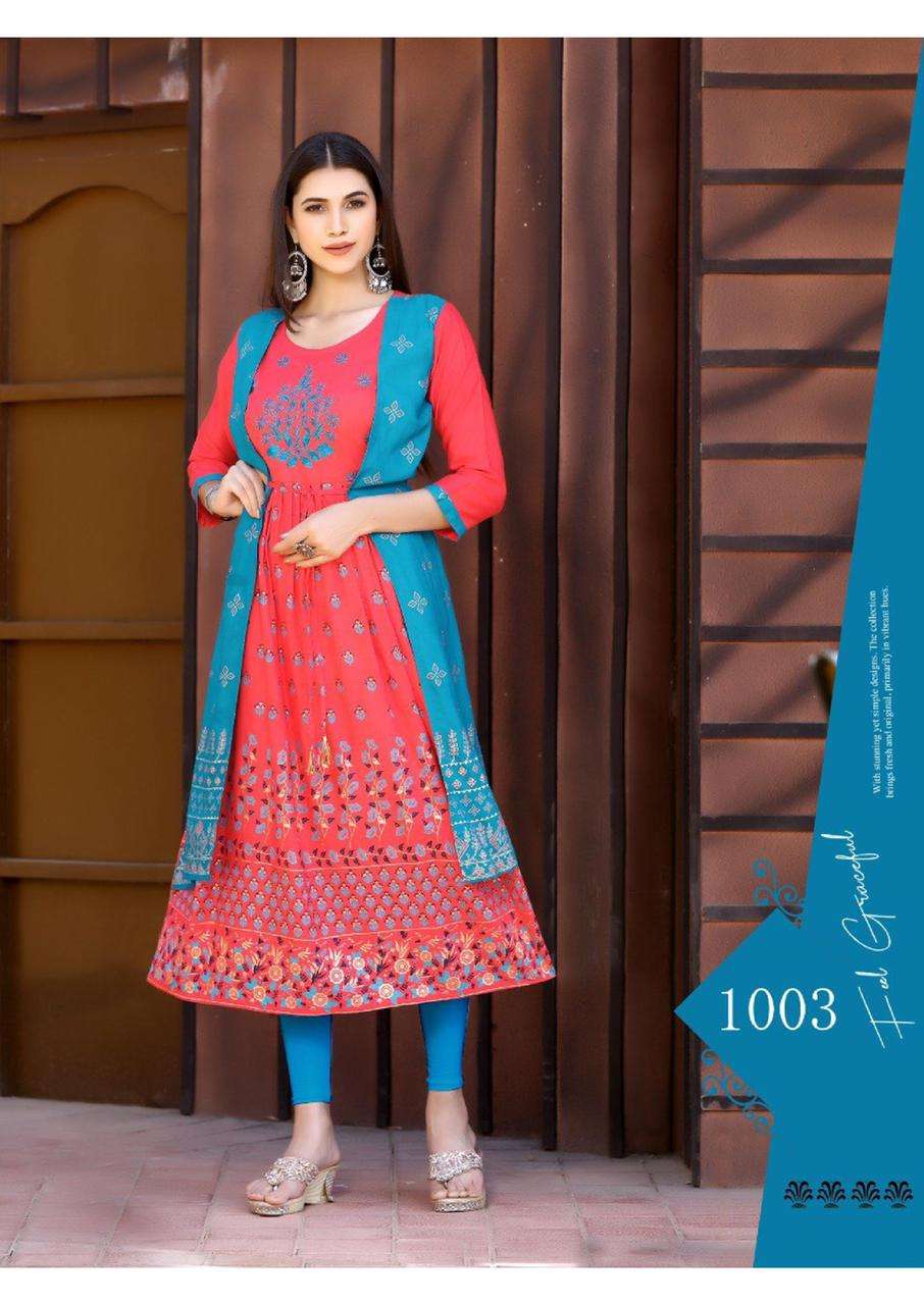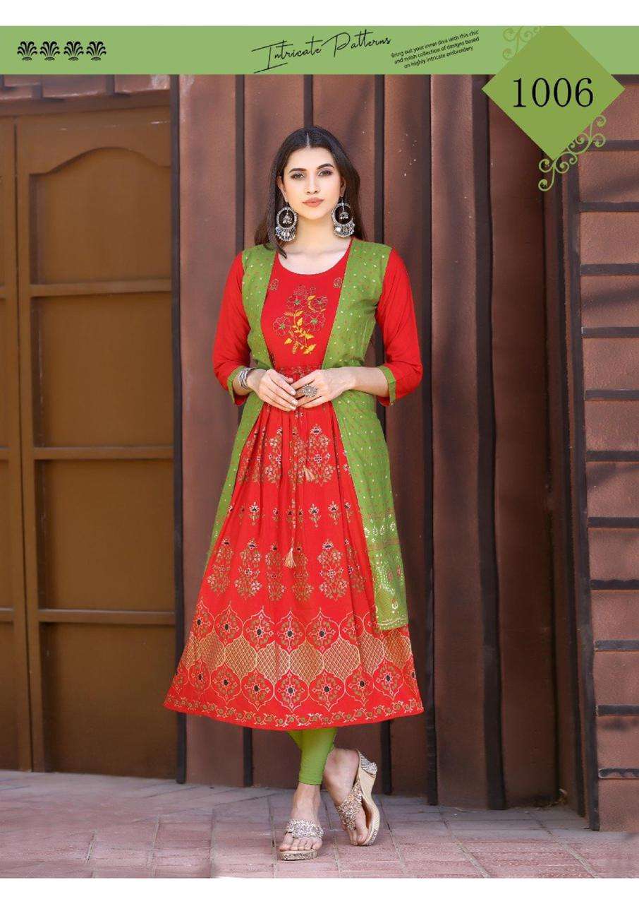 MISTHI BY BEAUTY QUEEN HEAVY RAYON FOIL GOLD PRINT FRONT-BACK / JACKET MODEL KURTI CATALOG WHOLESALER BEST RATE