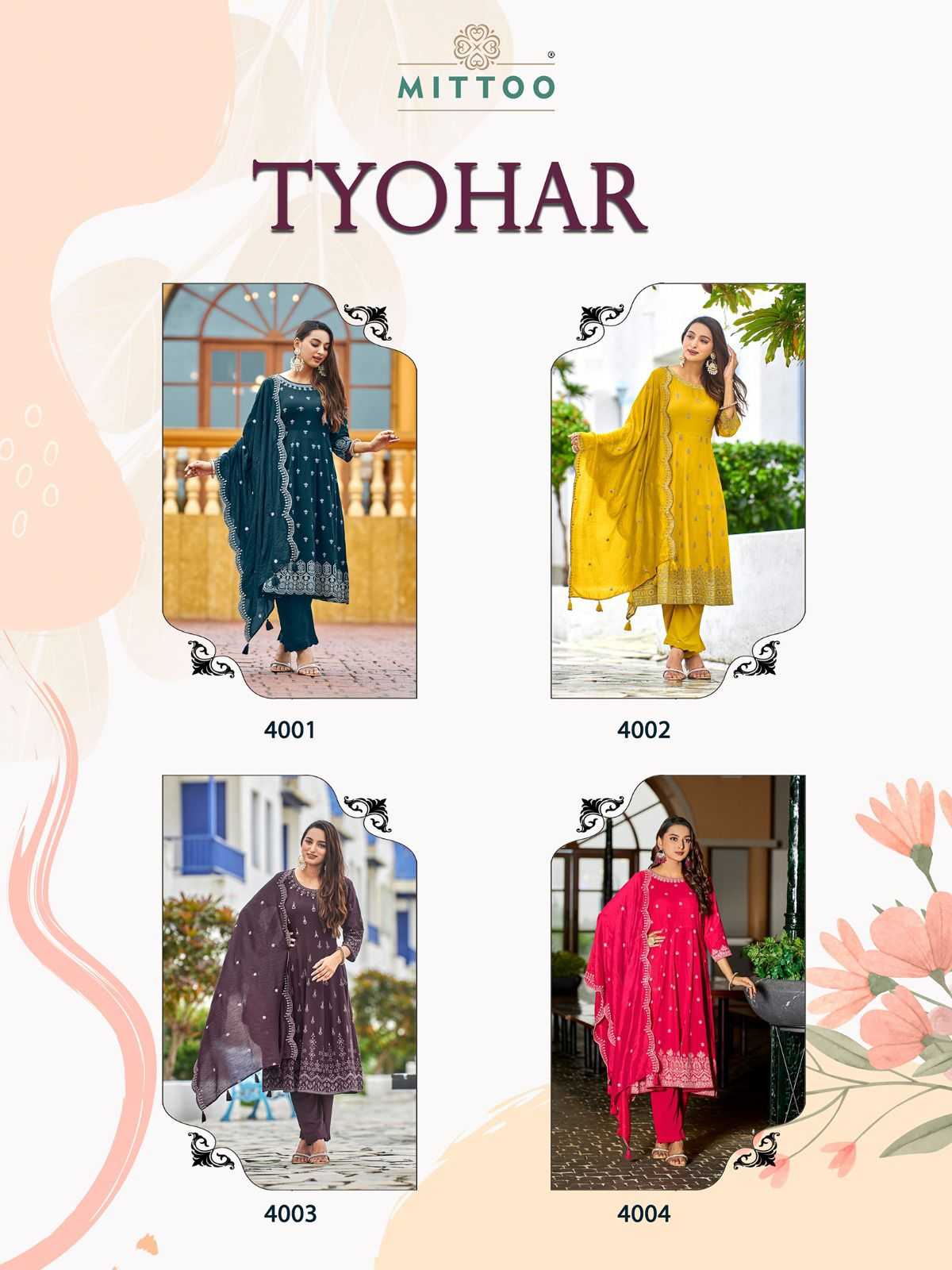 Brand Name : MITTOO Catalog : TYOHAR Design : 4 Fabric : Rayon Print Bottom : Heavy Rayon Dupatta : Chanderi with work Size : S(36), M(38), L(40), XL(42), XXL(44), 3XL(46) Rate : 1060 / Per pcs+ GST Dispatched with 3-4 days Set to set |