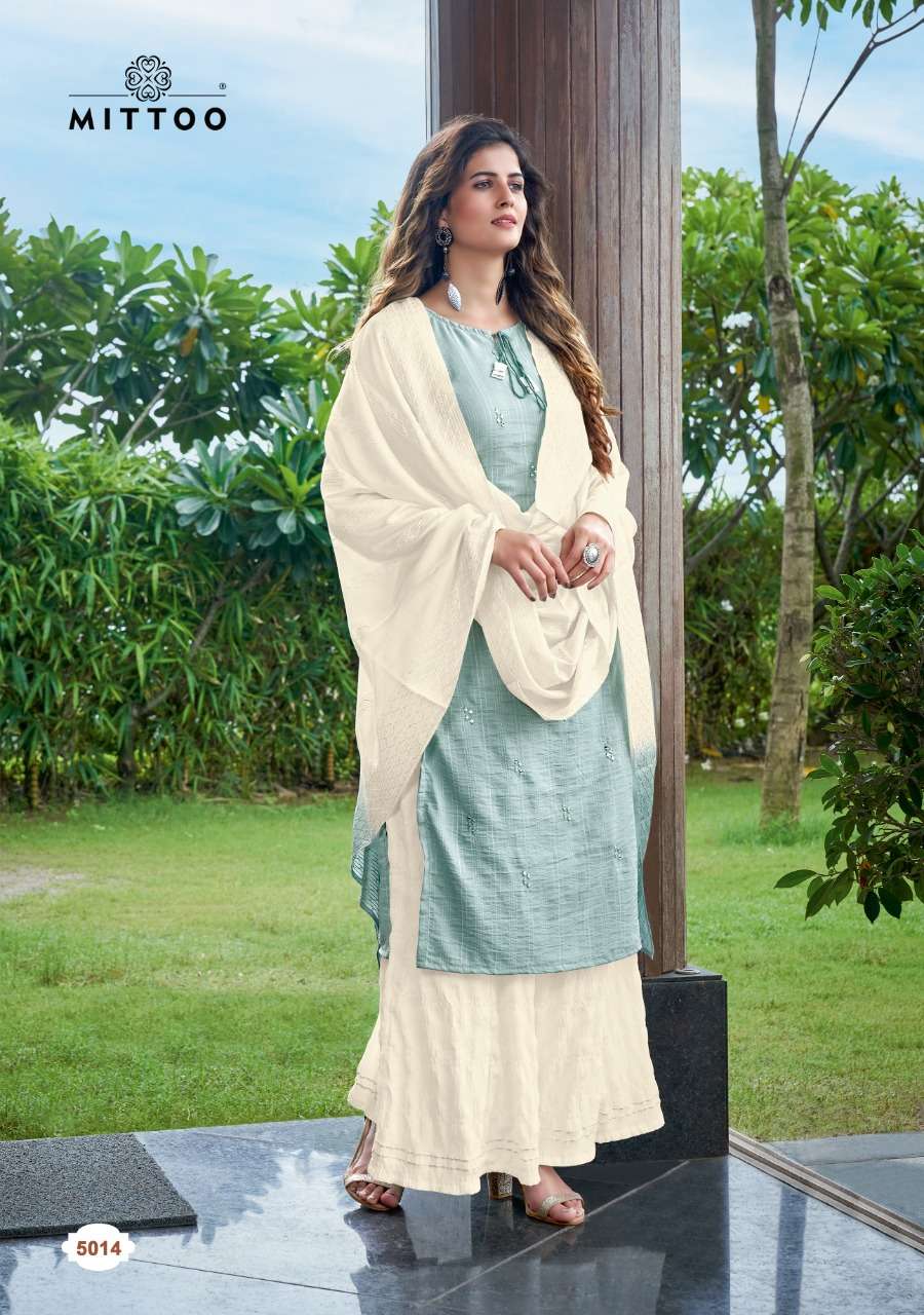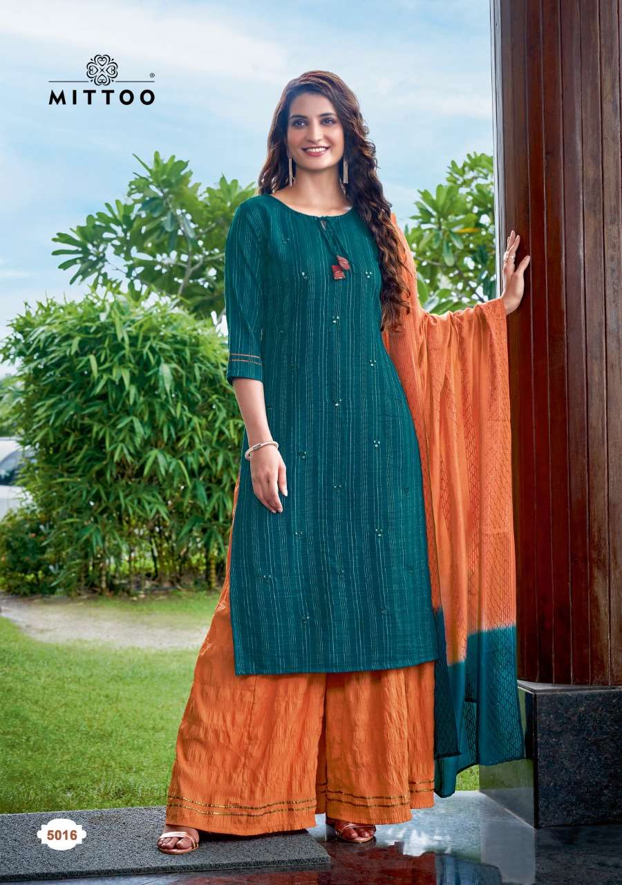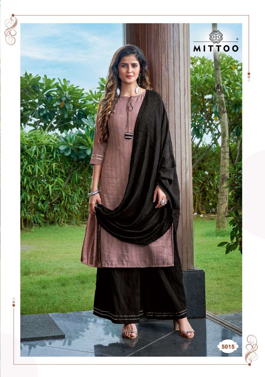 Brand Name : MITTOO Catalog : NOOR VOL 3 No of Design : 4 Fabric Details Bottom : Fancy Crush Lycra with Double Flair Plazzo Dupatta : Chanderi Squence Size : M(38), L(40), XL(42), XXL(44), 3XL(46) Rate : 1150 / Pic + 5% GST |