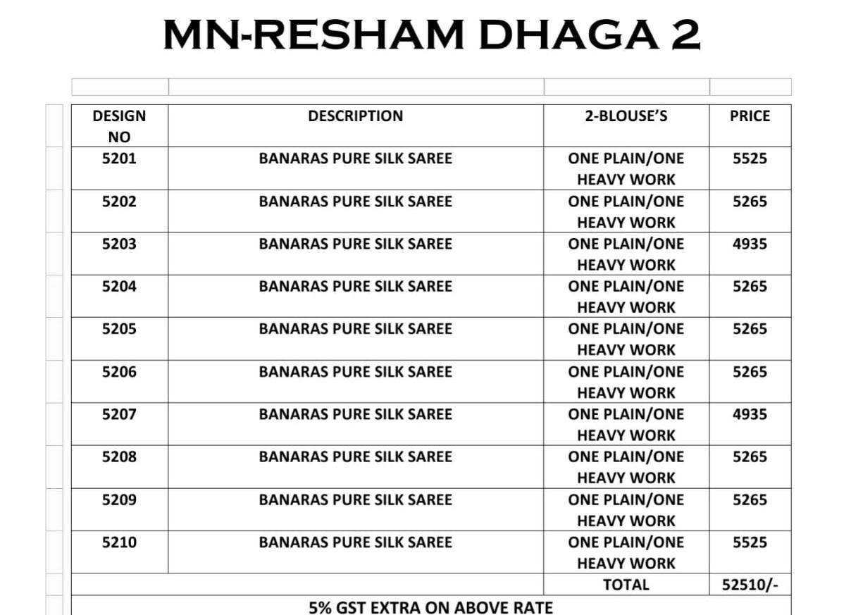 Brand-M.N. Type- Saree. Catlog Name- MN - REAHAM DHAGA -2. Series - 5201 to 5210. GST 5 Percent Extra. Delivery from tomorrow |