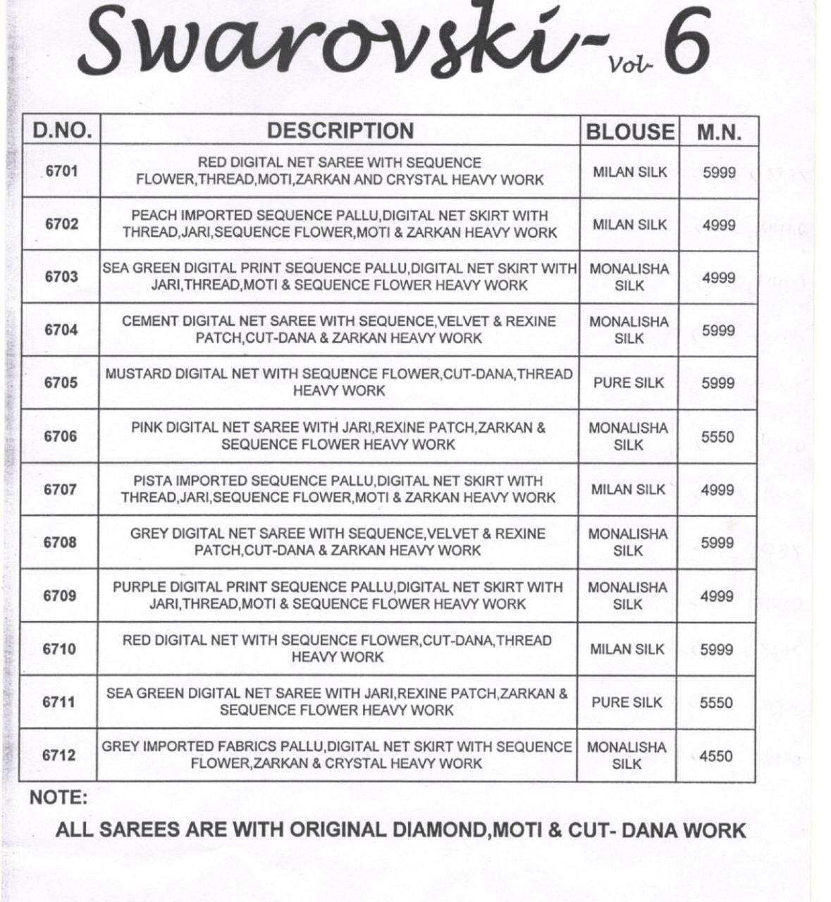 OUR NEW SAREE COLLECTION ♻️ BRAND : MN CATALOG : SWAROVSKI VOL 6 (6700 SERIES) PRICE :- ATTACHED FABRIC -: ATTACHED READY DISPATCH |