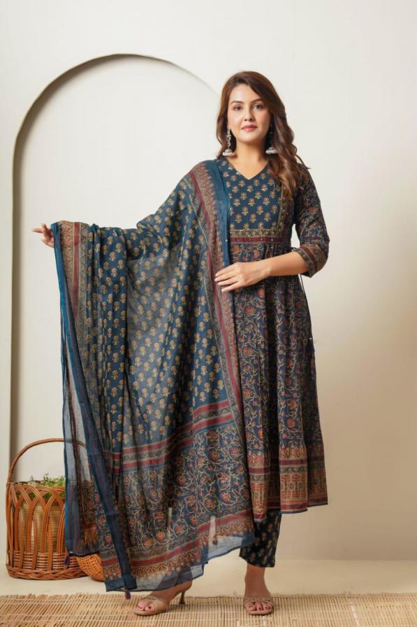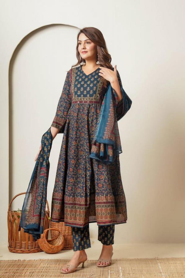 modern anarkali cotton pretty readymade combo kurti pant dupatta set