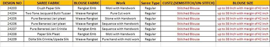 | Note | Stitching available on customer Requirment For Sarees , Salwar Kameez, Lehengha.(i.e M,L,XL,XXL). |