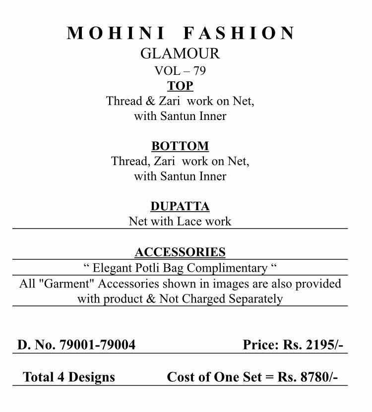 Brand - Mohini . Type - Suit . Series - 79001 to 79004. Rate- 2195 per Pcs GST 5 Percent Extra. Delivery 5- 6 days |