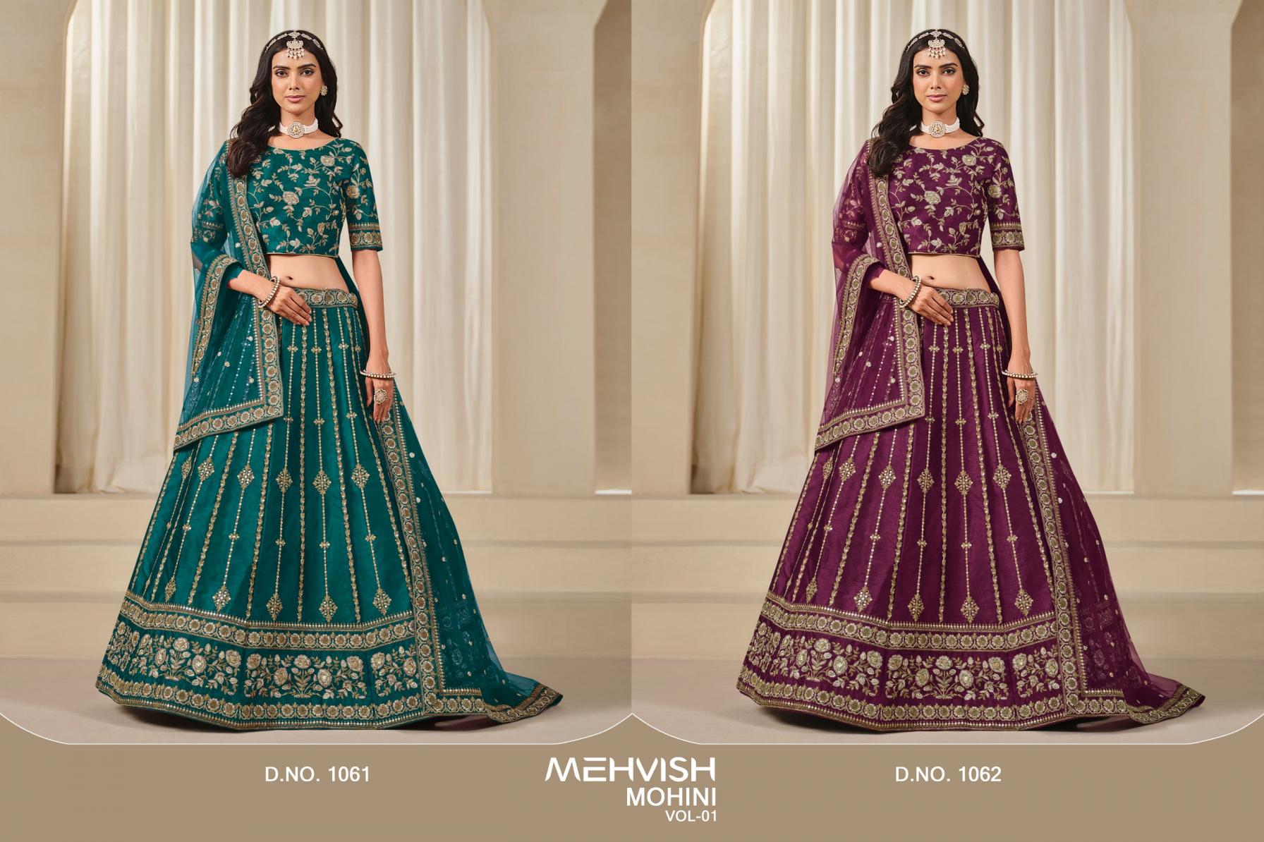 Brand : Mehvish Catalog Name : Mohini Vol -1 Series : 1061-1062 Lehenga Fabric : Art Silk With Heavy Thread & Sequins Work (Unstitched) Blouse : Art Silk With Heavy Thread & Sequins Work 0 .80 Meter Dupatta : Net With Heavy Thread & Sequins Work 2.00 Meter Rate : 3395/-+12% Gst Occasion: Party Wear,Festival Wear |