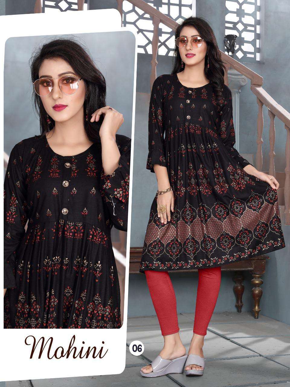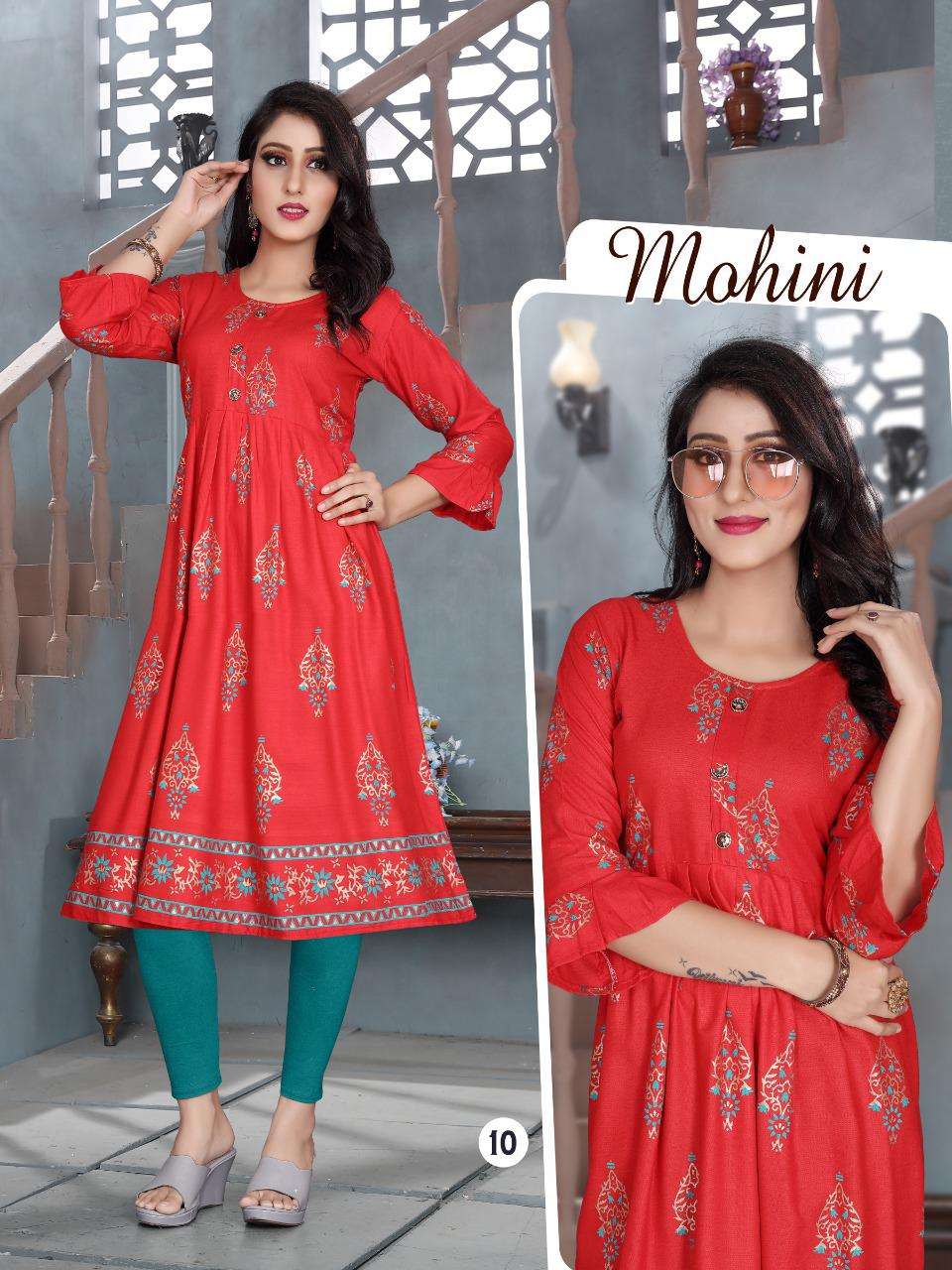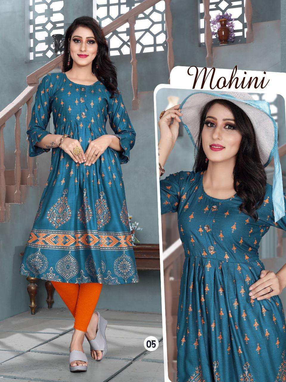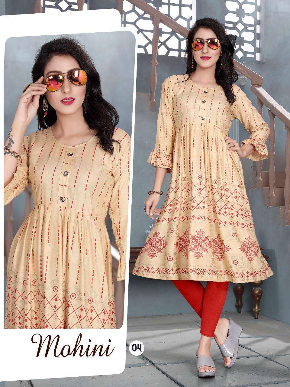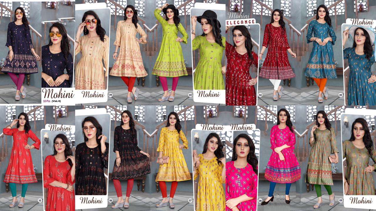 MOHINI VOL.4 Rayon 14 Kg Goil Foil and Screen Block Work Tux Pattern Kurti CATALOG WHOLESALER BEST RATE