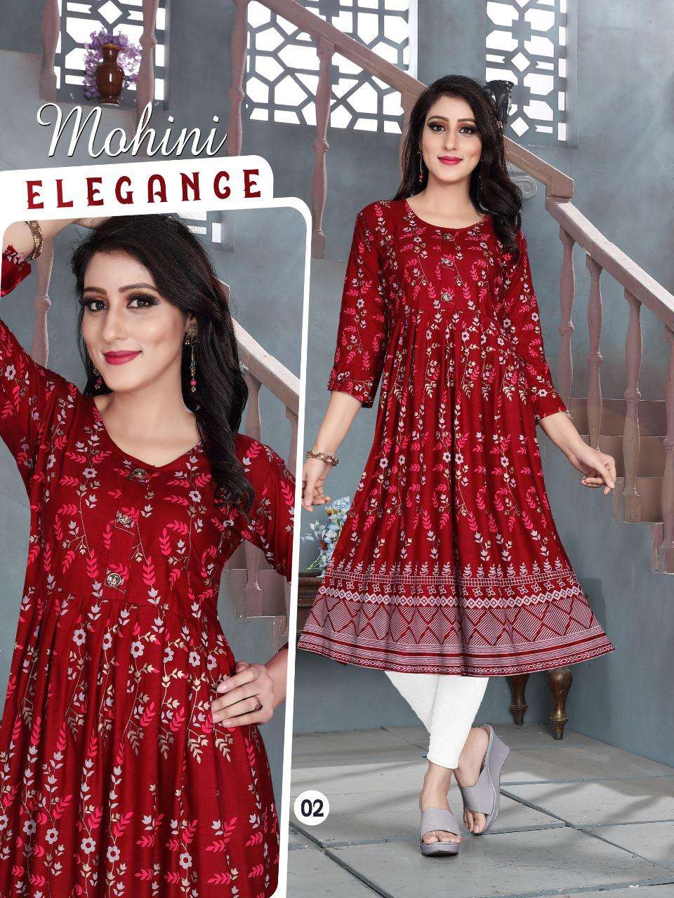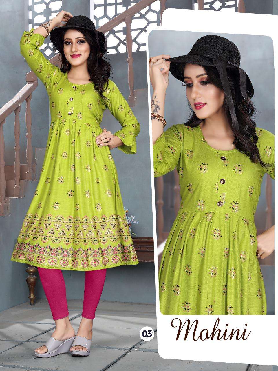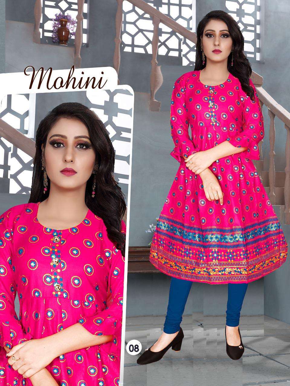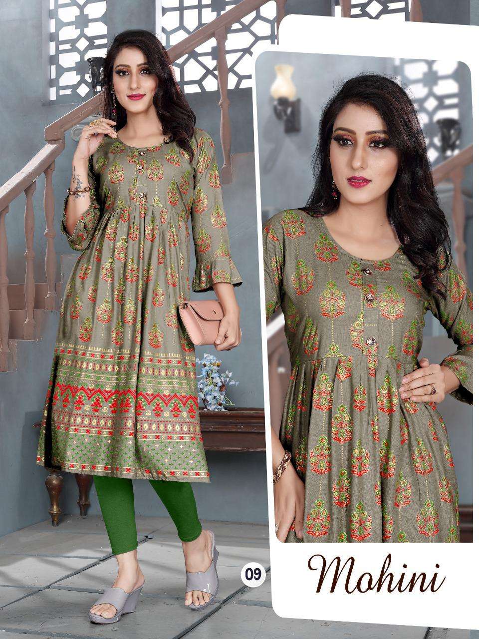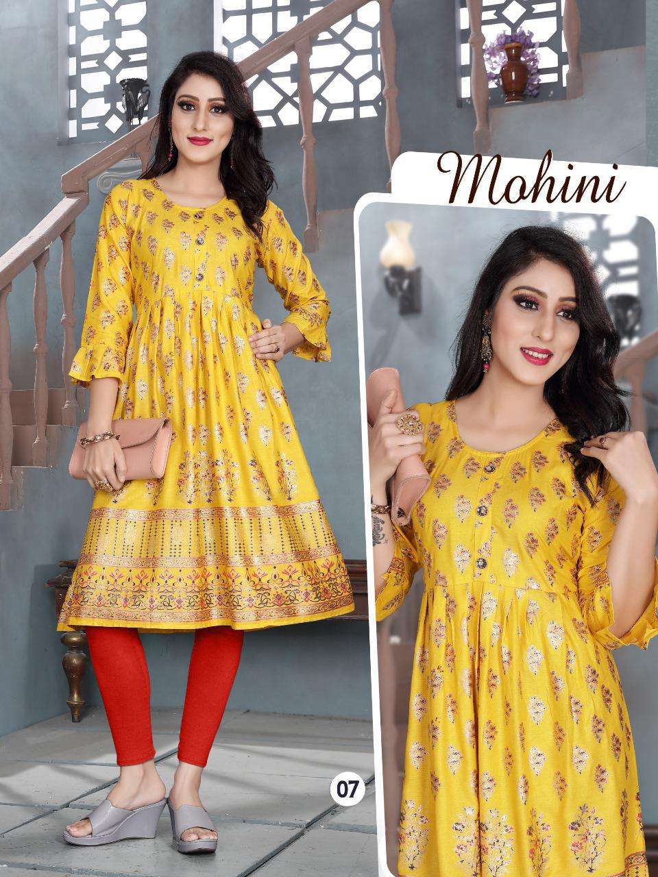 MOHINI VOL.4 Rayon 14 Kg Goil Foil and Screen Block Work Tux Pattern Kurti CATALOG WHOLESALER BEST RATE