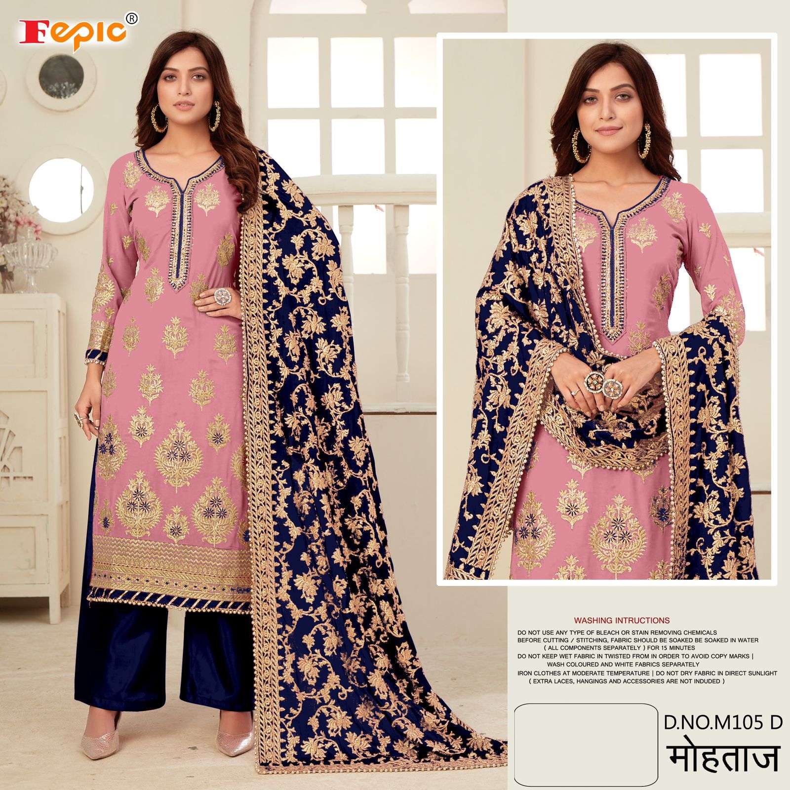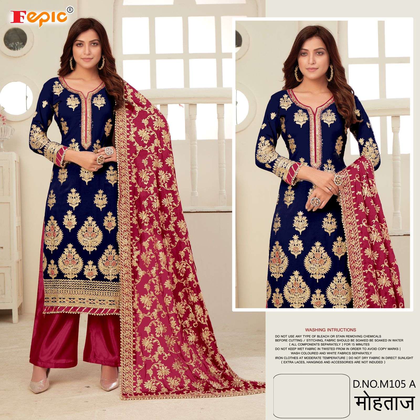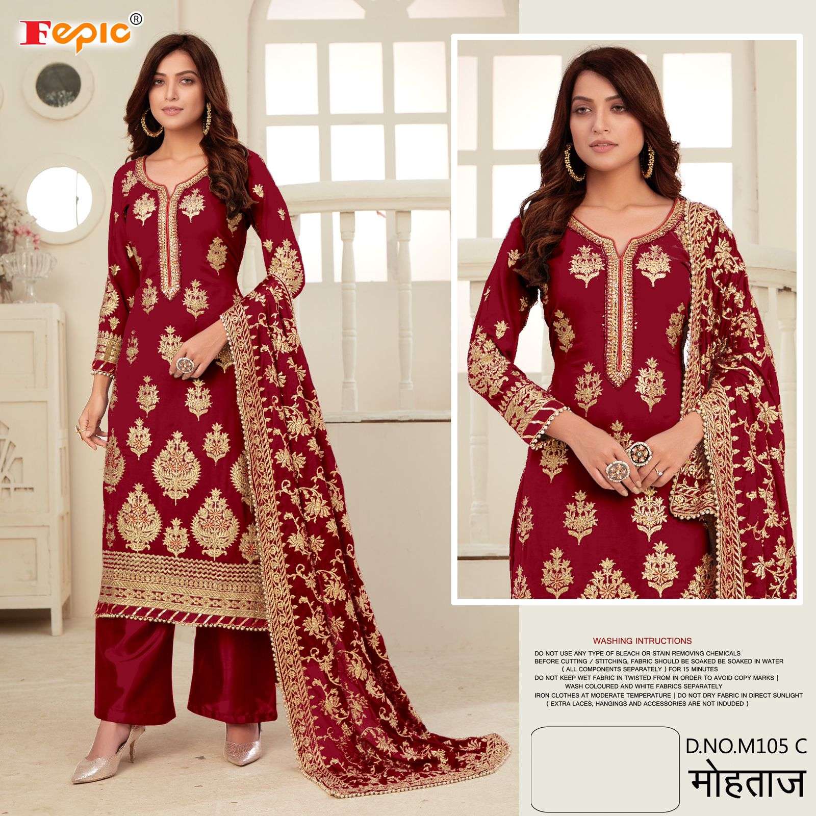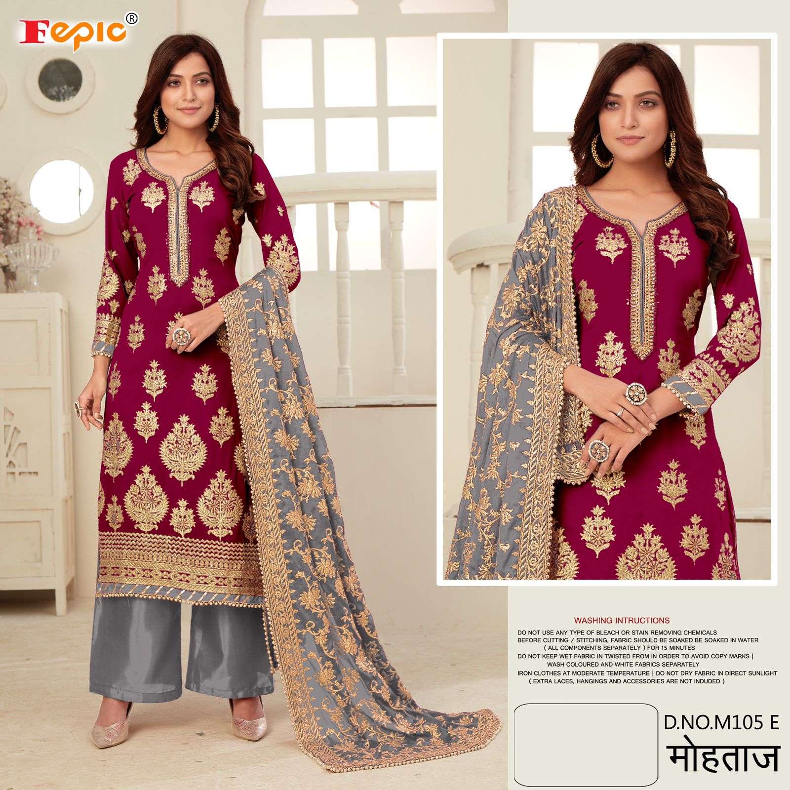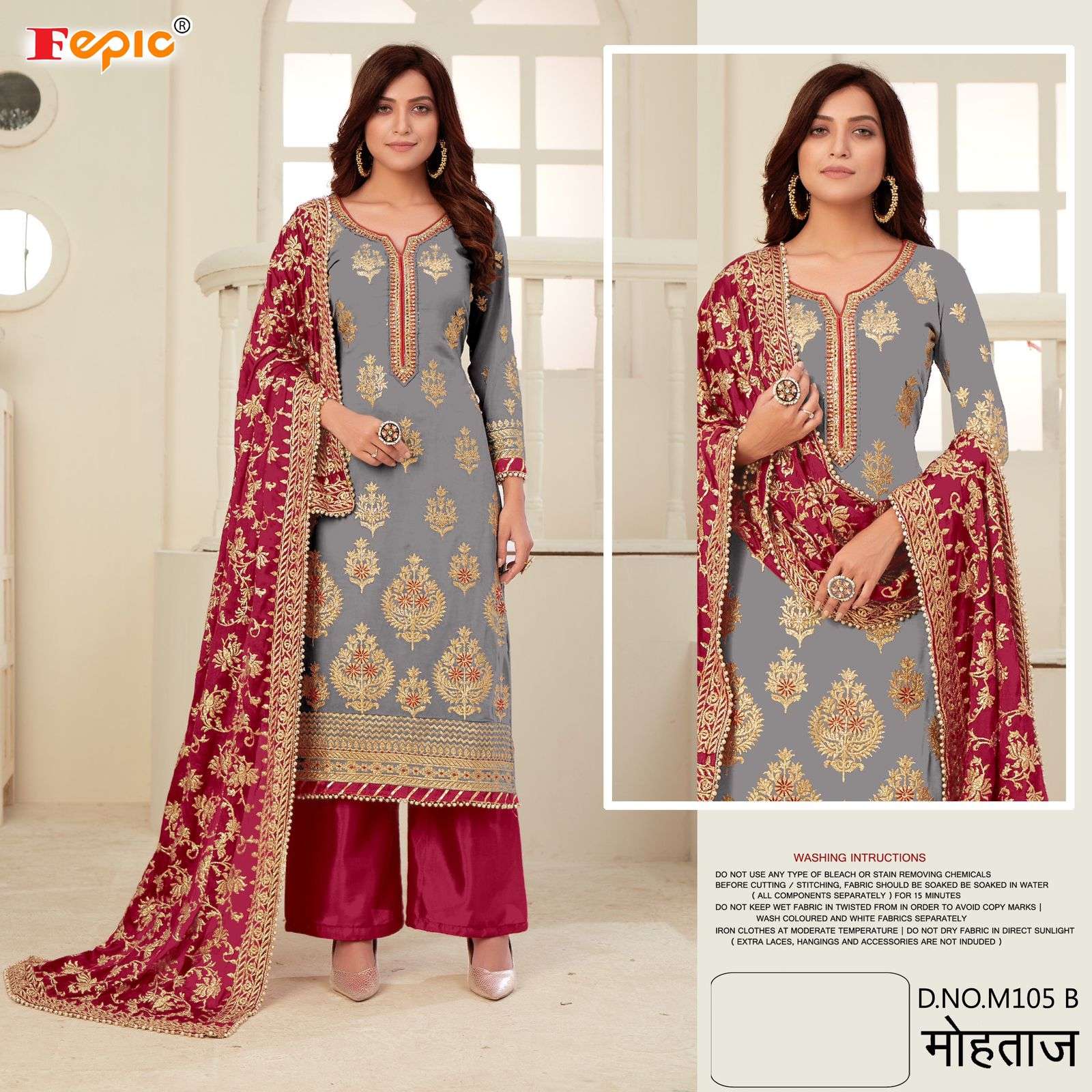 FEPIC   MOHTAZ VOL 2         Fabric details Top : FAUX GEORGETTE HEAVY EMBROIDERED WITH HEAVY HAND WORKED Bottom  : SANTOON INNER :- SANTOON Dupatta : PURE CHINNON EMBROIDERED PRICE : 1345/-+ GST |