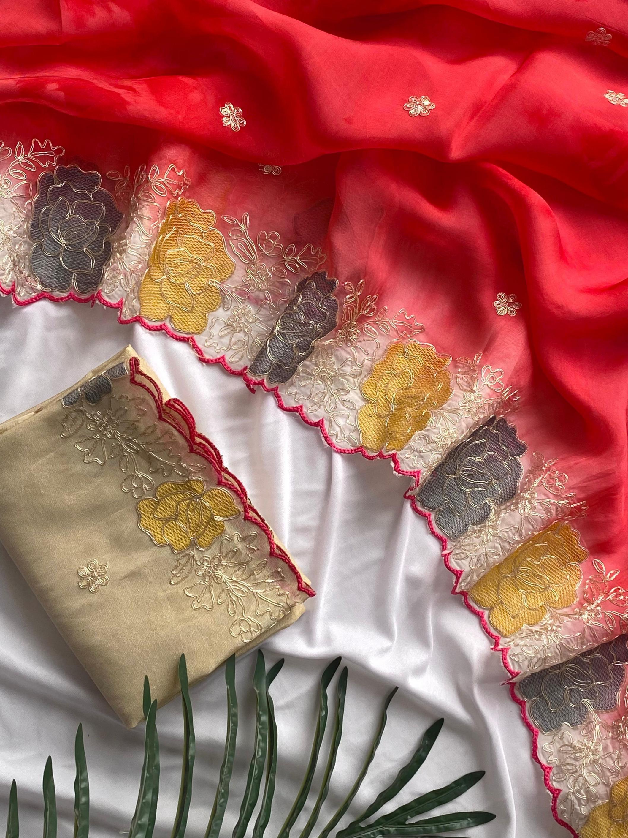FRESH ARRIVAL❤️ Catalog Mukti Pure organza saree with beautiful spray concept in red. With full embroidory and katdana work border Teamed with 1 mtr beautiful contrast blouse full embroided Price :- 1650/- |