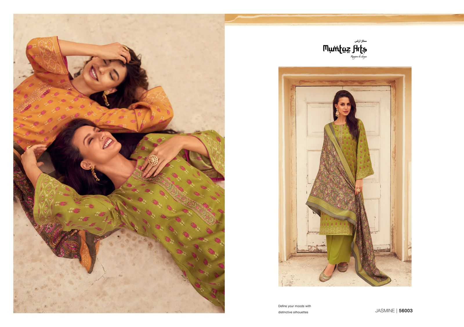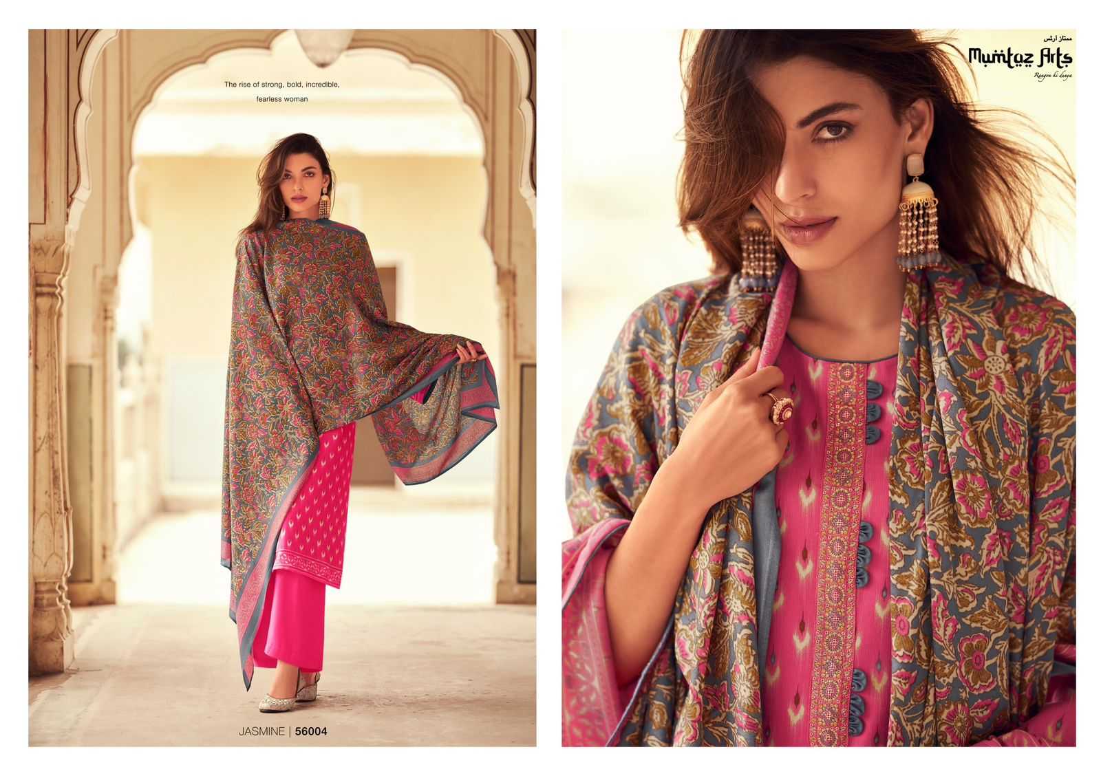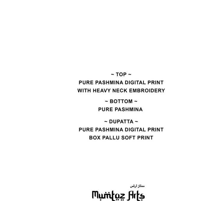 Name - Mumtaz arts JASMINE Top -Pure pashmina print with Elegant embroidery Bottom - pure spun pashmina Duppatta - pure soft shawl digital print Suits -6 |