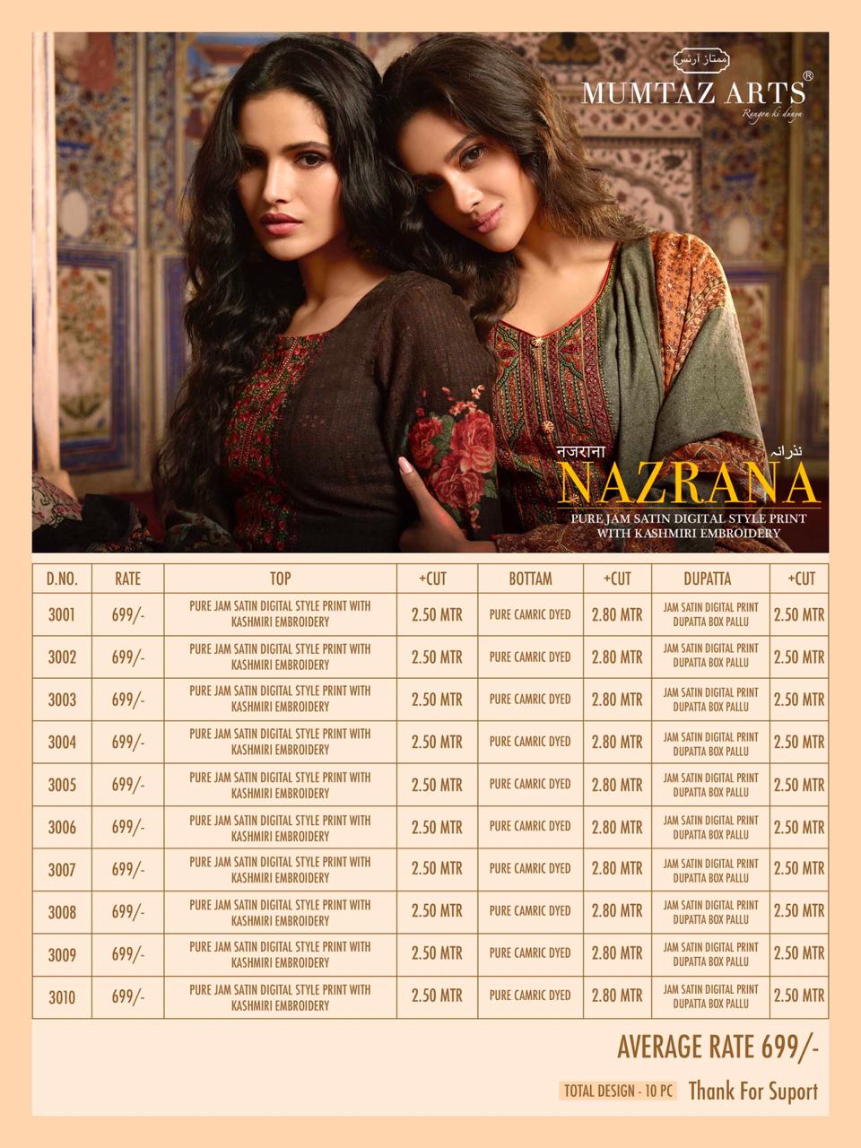 Today we MUMTAZ ARTS™ are launching our all time exclusive series with 100% PURE JAM SATIN DIGITAL PRINT STYLE top with Heavy designer embroidery WITH PURE LAWN MUL MUL DUP DIGITAL PRINT BOX PALLU MUMTAZ ARTS™ Name - NAZRANA WITH DESIGNER EMB KARACHI SUITS Fabric details - Top - Pure Jam Satin Digital Print With DESIGNER EMB Bot - Pure cotton dyed (2.80 mtr app) Dup - Pure Lawn Mul-Mul Dup box pallu Designs - 10 pcs Selling Rate - 699/- +GST DESIGNER EMB ON TOP SPECIAL POUCH PACKING LEATHER BAG PACKING |