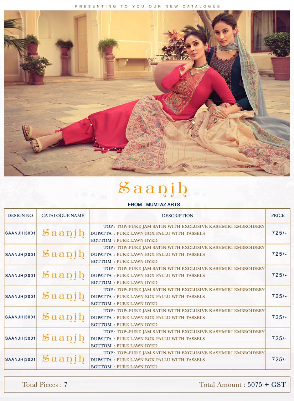 MUMTAZ ARTS™ RANGON KI DUNYA Name - SAANJH DESIGNER EMB ON SHIRT KARACHI SUITS DIGITAL PRINT DUP WITH TASSELS Fabric details - Top - Pure Original Jam Satin Dyed Top- Designer Kashmiri embroidery Bot - Pure cotton dyed (2.70 mtr app) Dup -LAWN BOX PALLU WITH TASSELS Designs - 10 pcs Selling Rate - 725/- +GST DESIGNER EMB ON TOP SPECIAL POUCH PACKING LEATHER BAG PACKING |