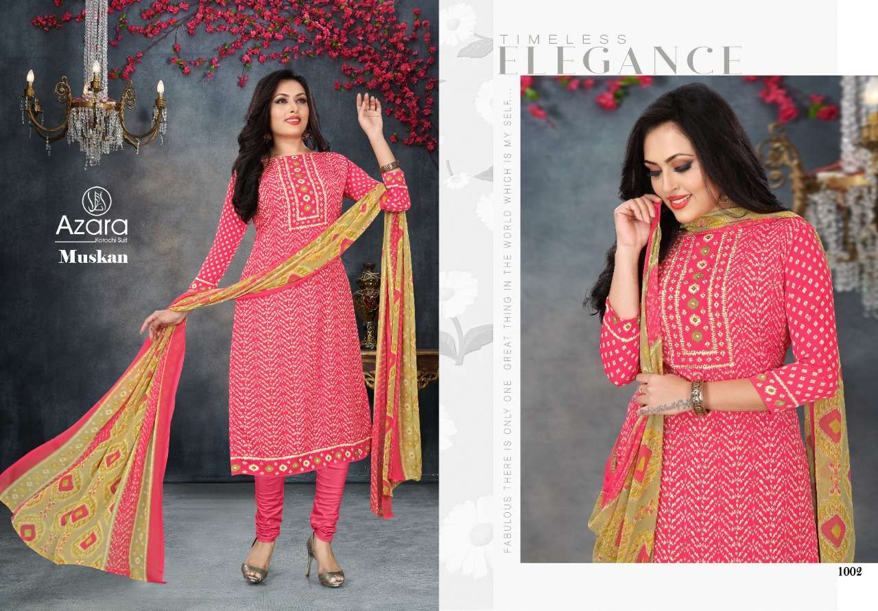 ............Azara...........           presents           "MUSKAN          Top:     french crape designer print             With diamond work             Dupatta:  pure weight less print             with four side lace  Bottom:  french crape  Pcs:     8     Rate 490/- +GST    Your trust is our capital      Radhika fashion |