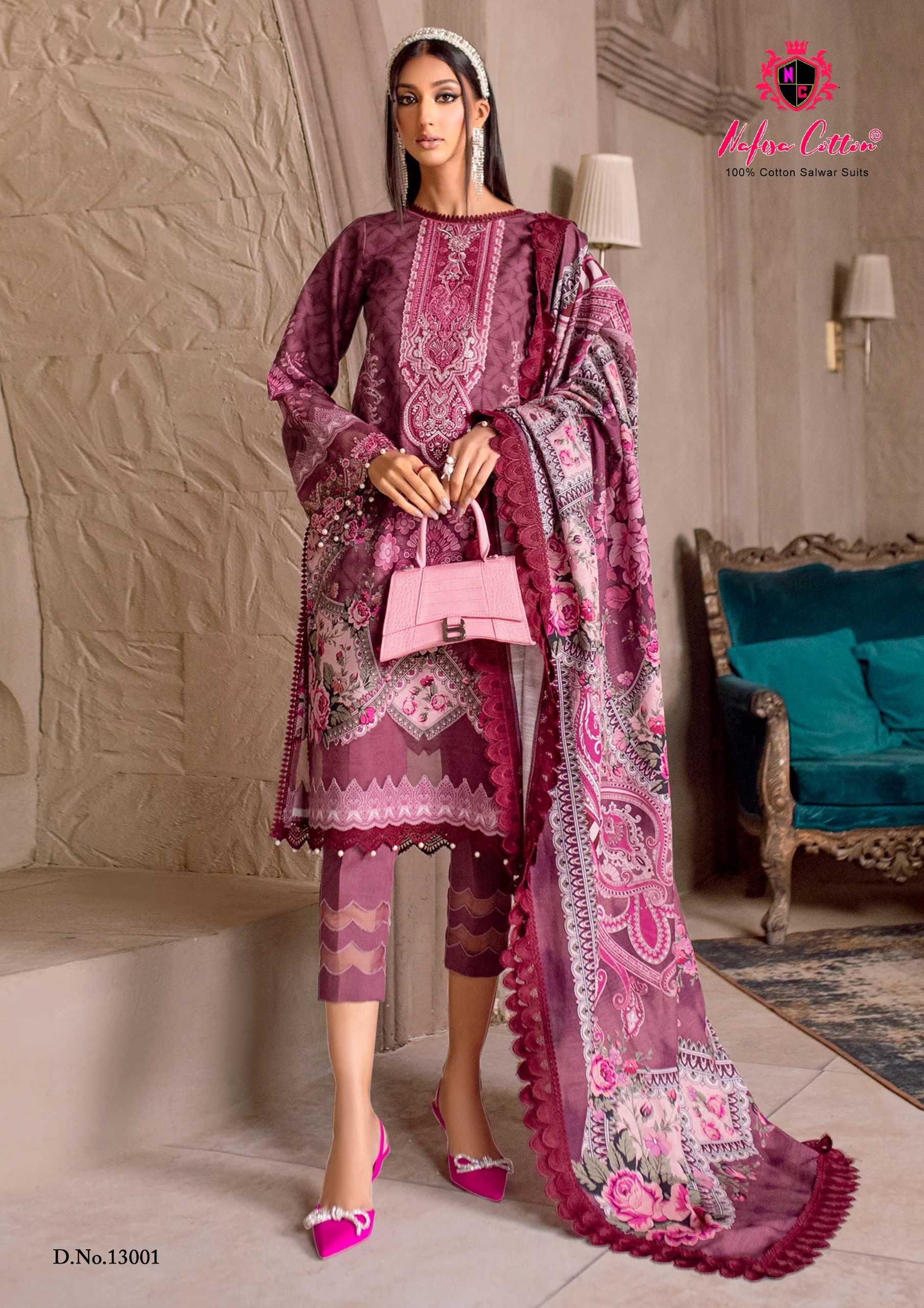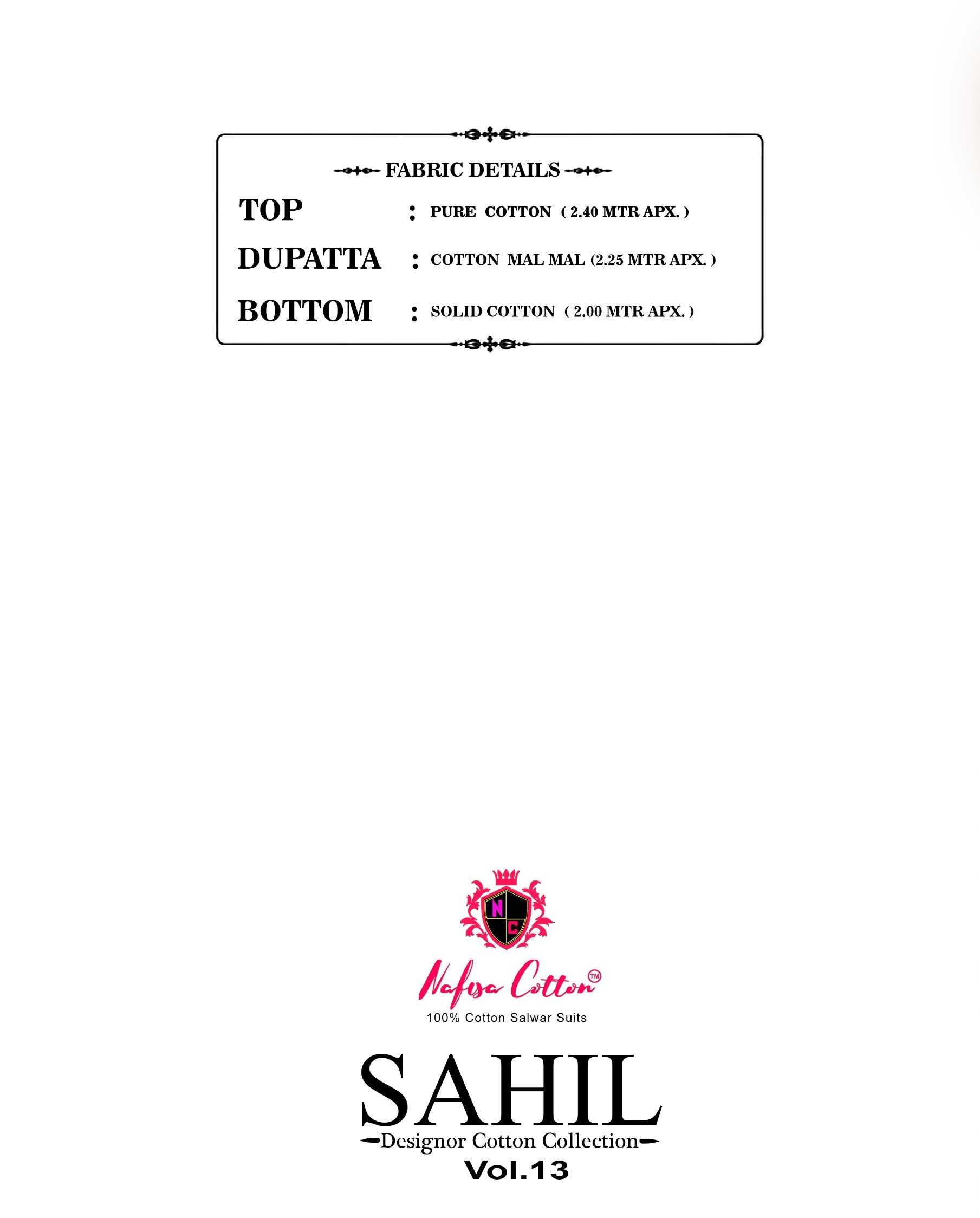 NAFISHA COTTON 🆕 PRESENT _SAHIL DESIGNOR COTTEN COLLECTION VOL 13 Exclusive 💯 karachi cotton collection Fabrics Details and cut ✂️:- TOP :-PURE COTTEN 2/40 MTR BOTTOM :- SOLID COTTEN 2/00 MTR APPROX DUPATTA :-PURE COTTEN MAL MAL Pauch with bag paking 🌺Beautiful 10 designs collection🌺 RATE…325/- Limited stock |