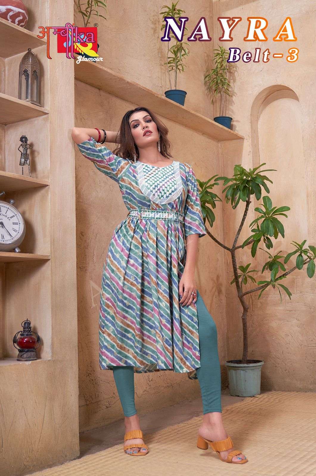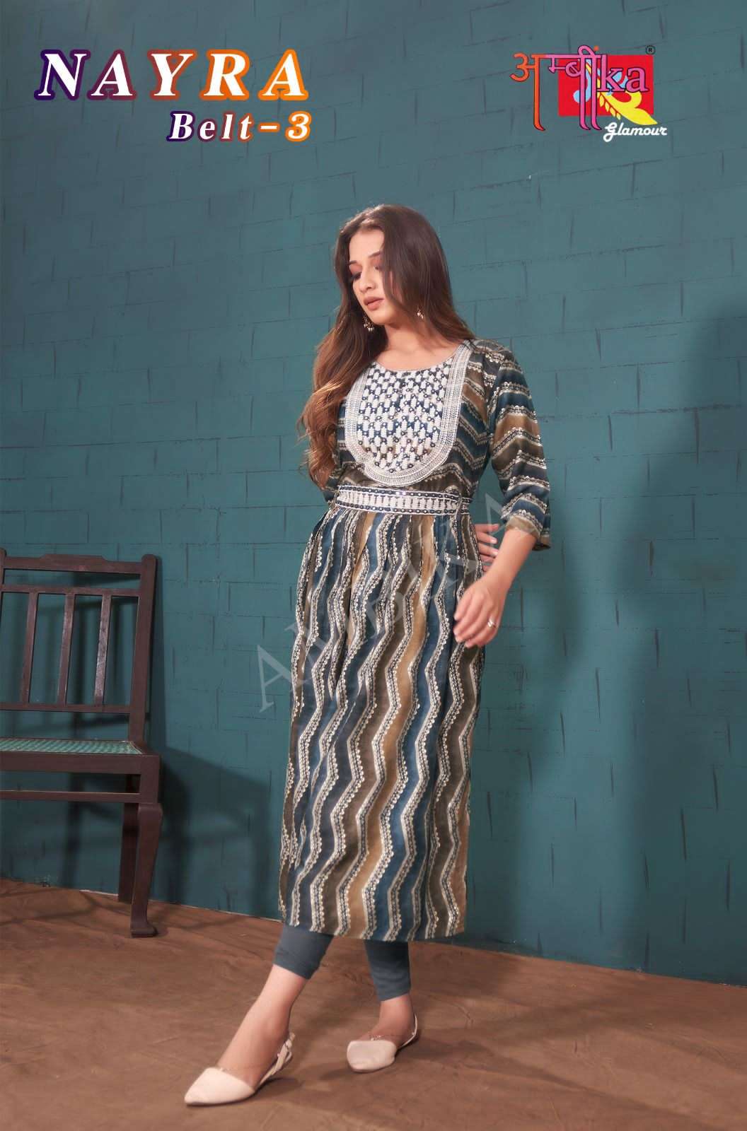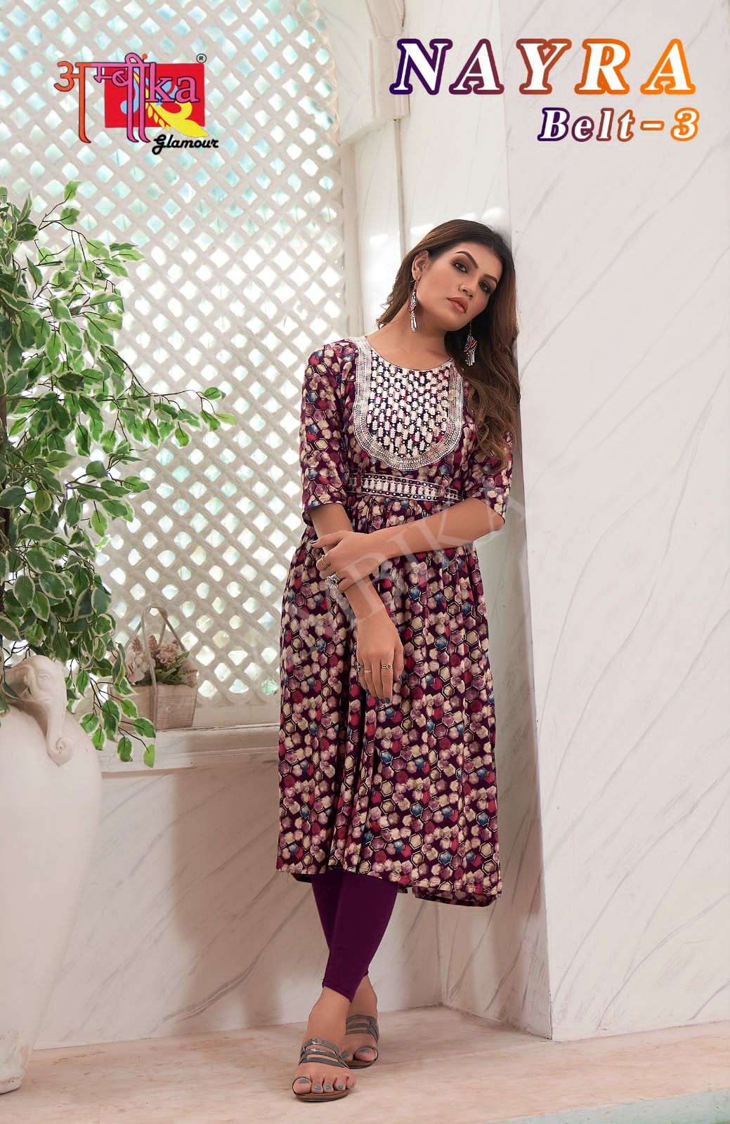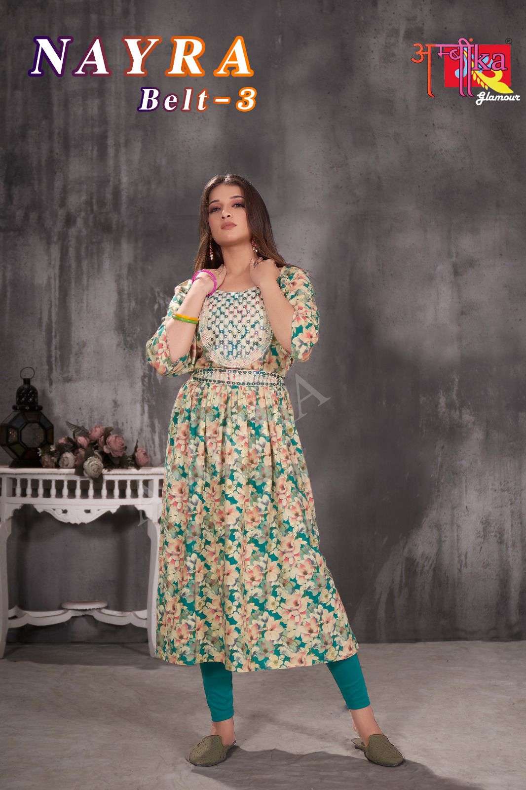 naira belt vol 3 by ambika kurtis fancy rayon nayra cut kurti with separate work belt combo set