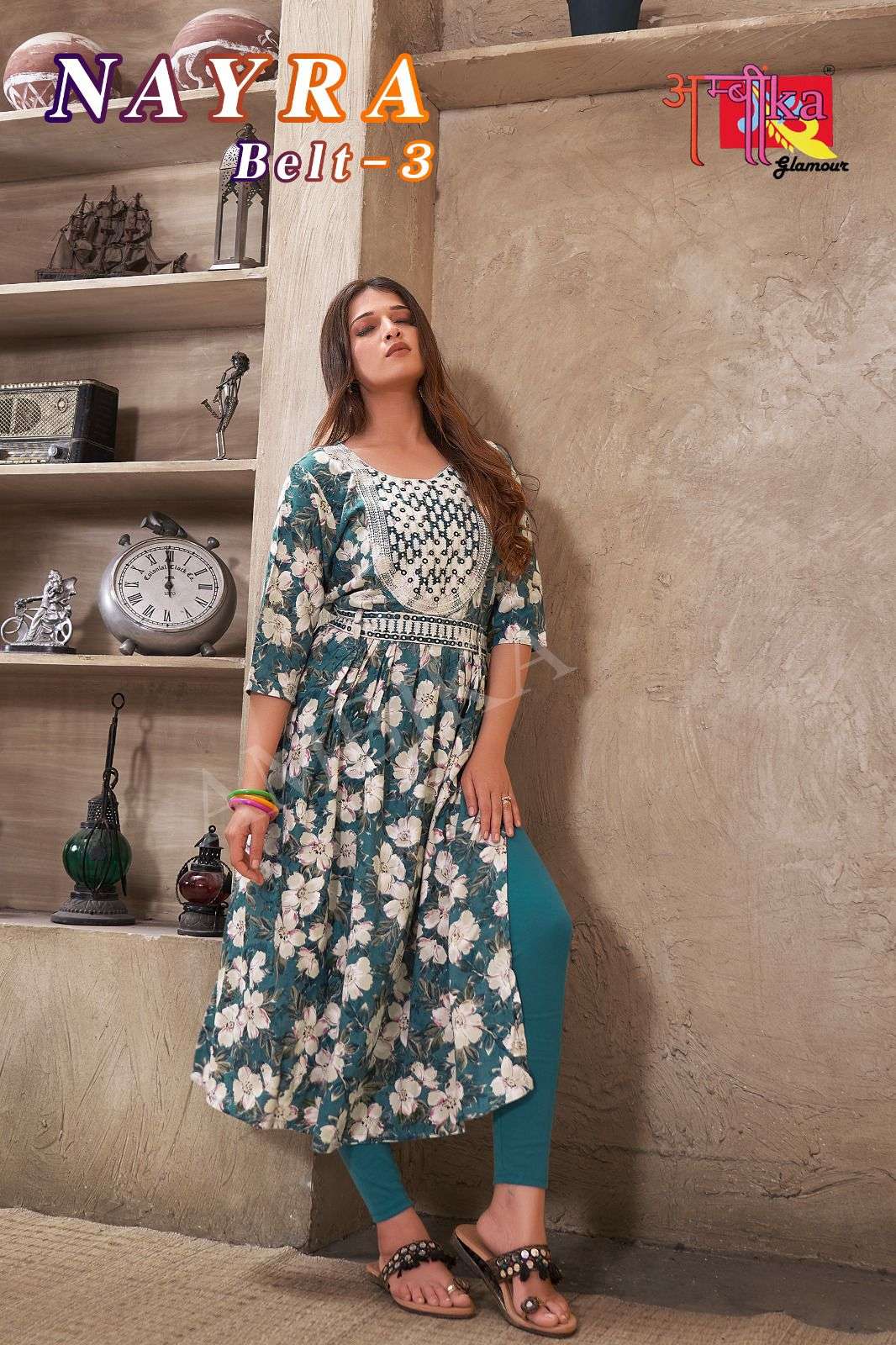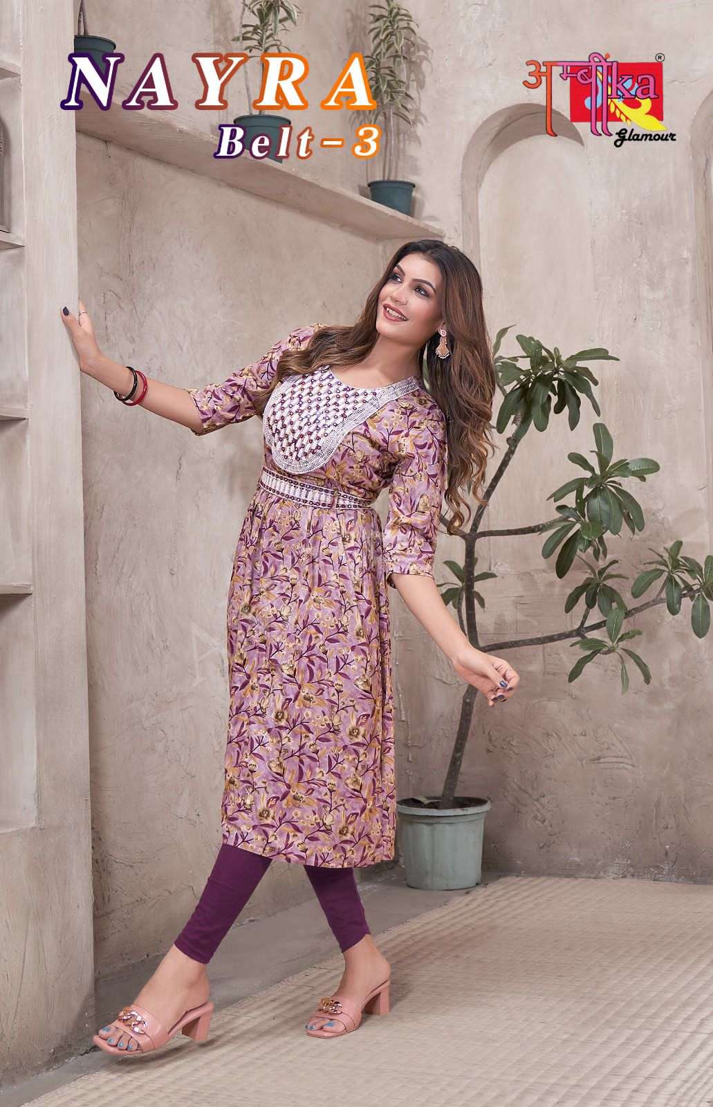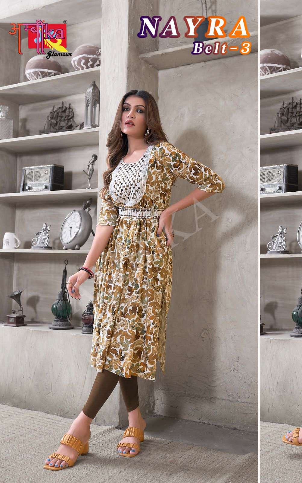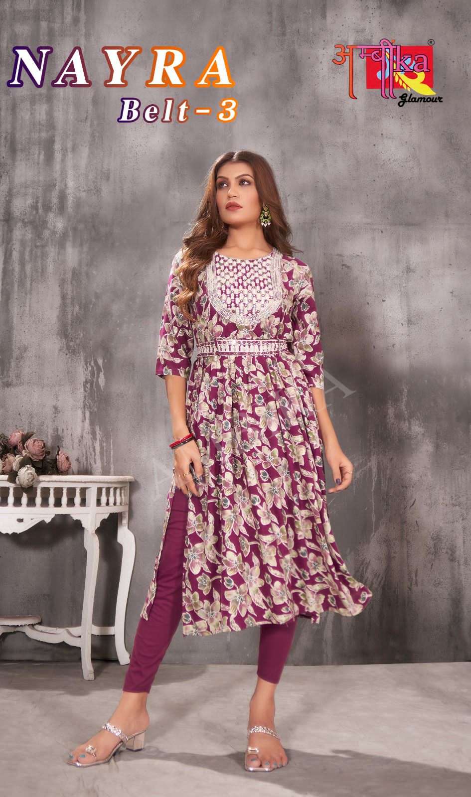 naira belt vol 3 by ambika kurtis fancy rayon nayra cut kurti with separate work belt combo set
