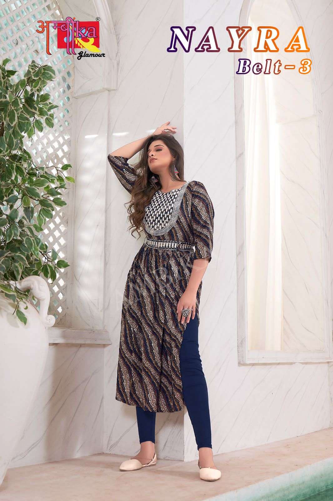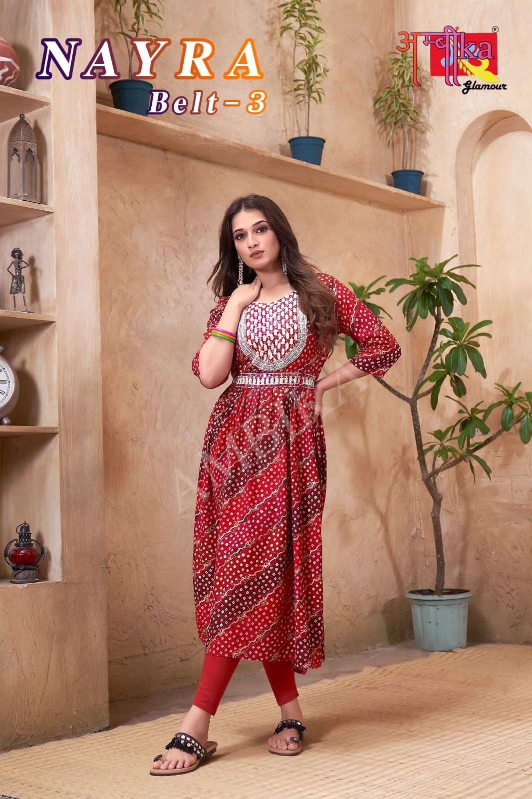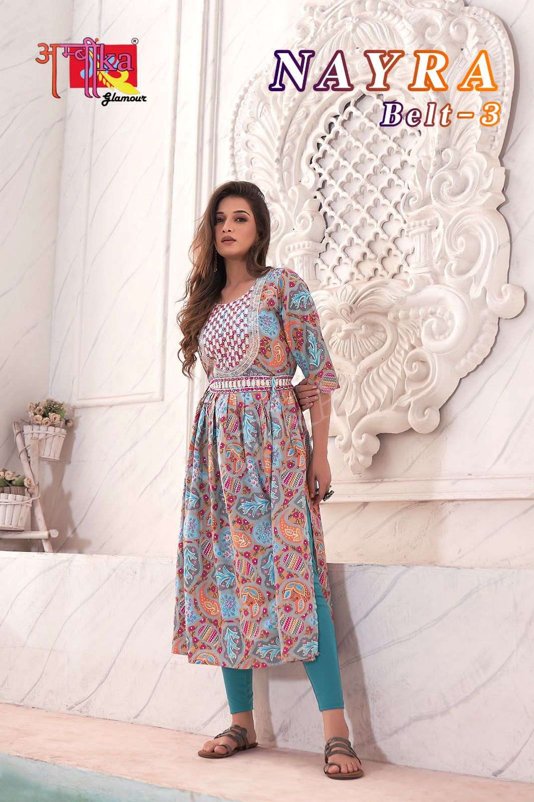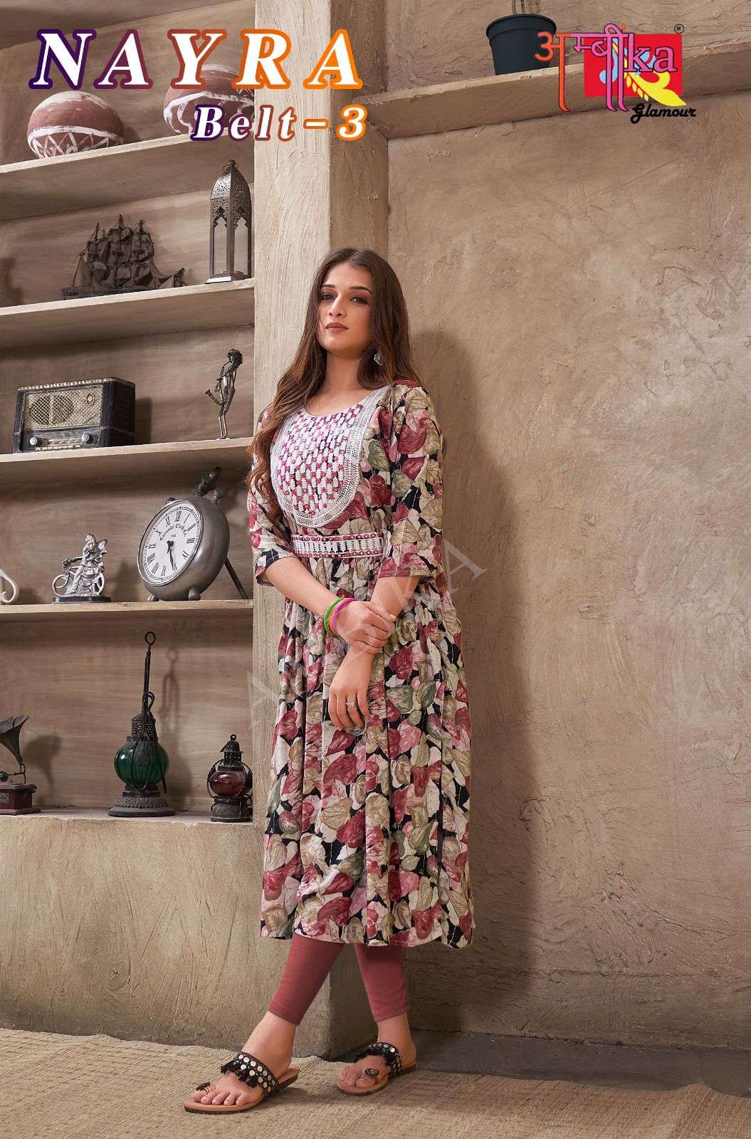 naira belt vol 3 by ambika kurtis fancy rayon nayra cut kurti with separate work belt combo set