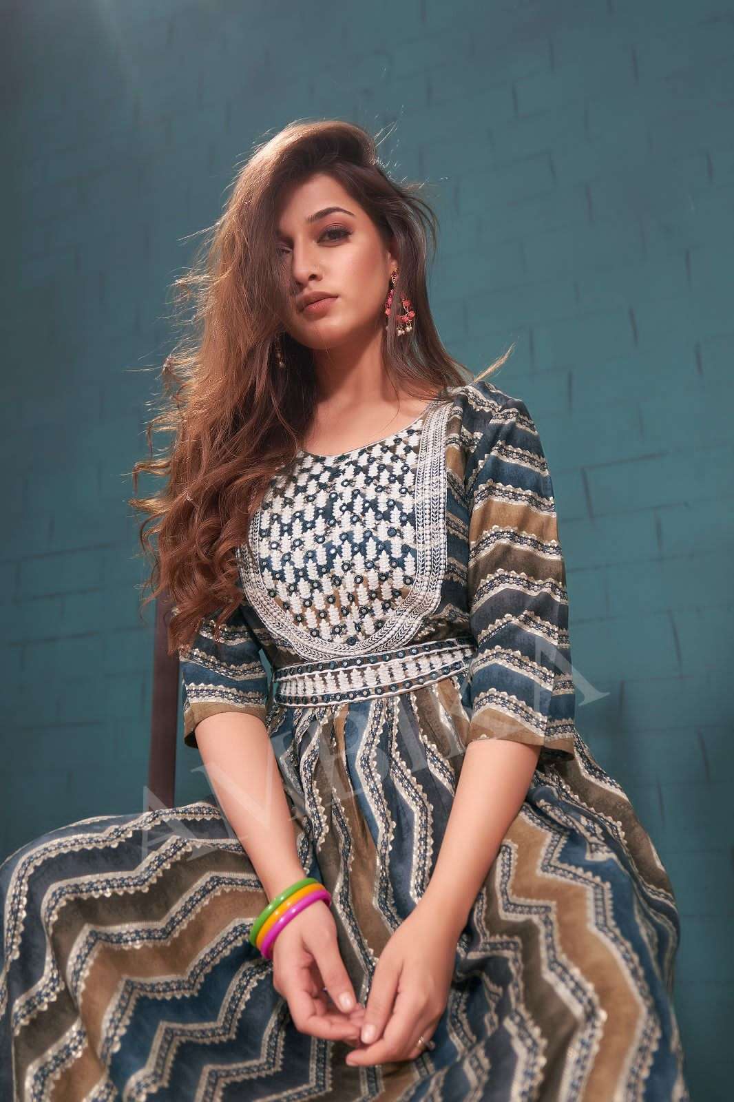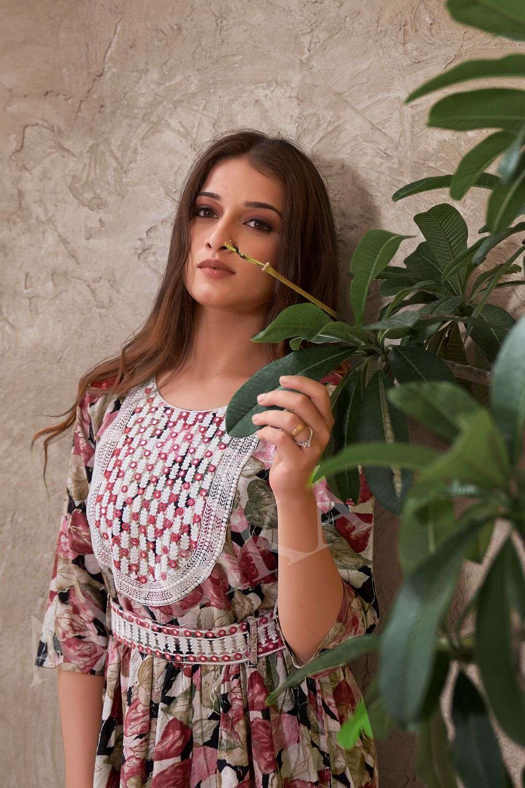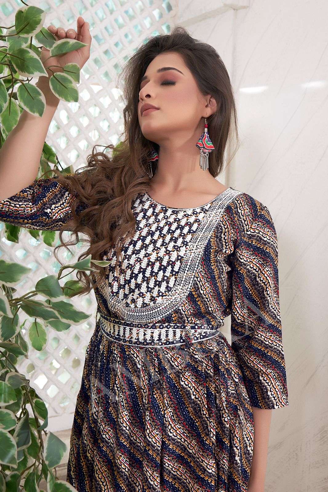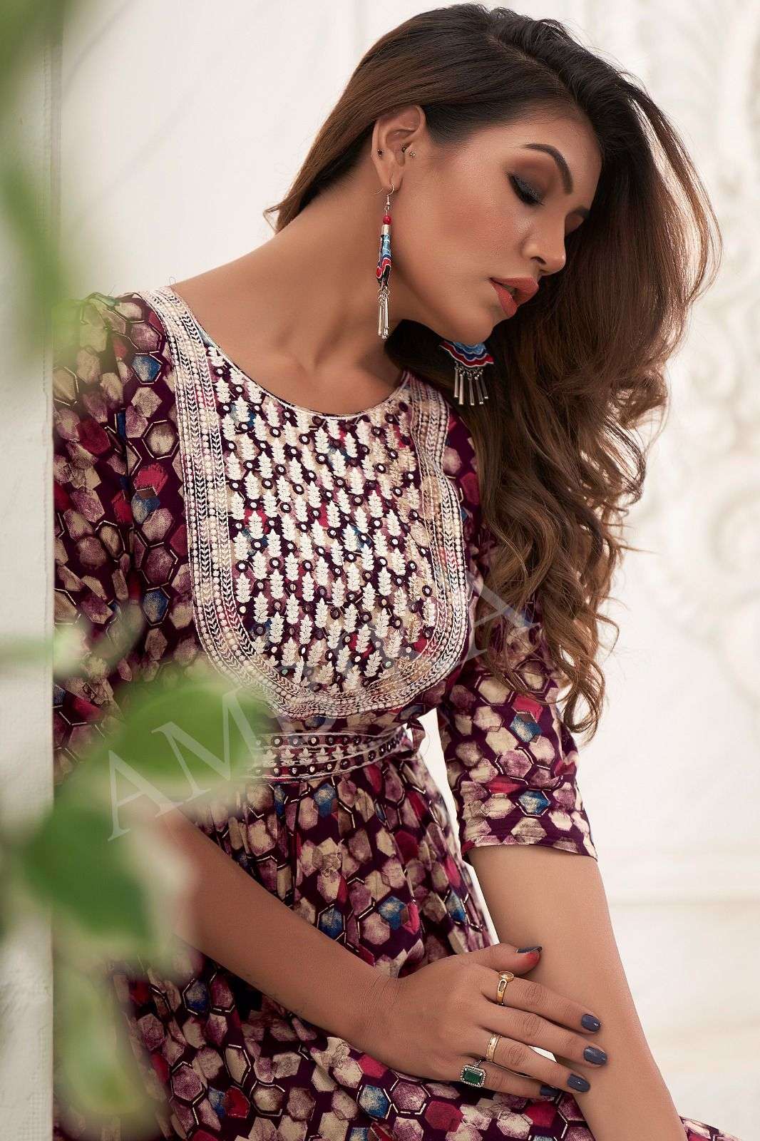naira belt vol 3 by ambika kurtis fancy rayon nayra cut kurti with separate work belt combo set