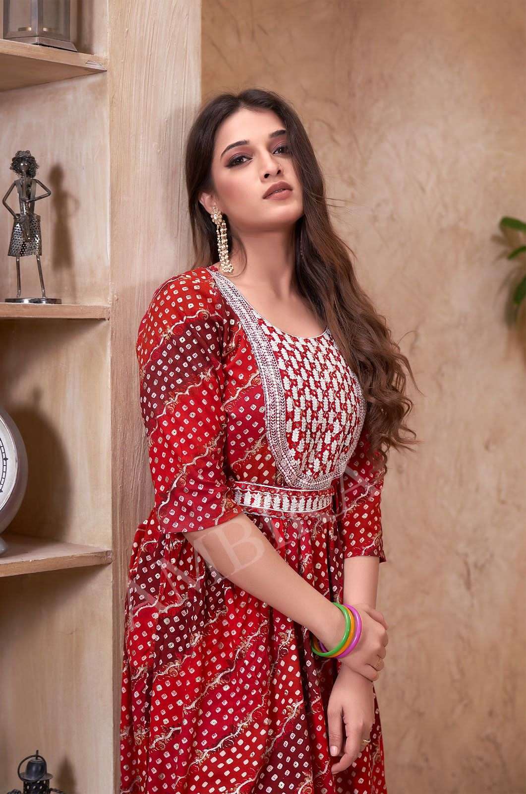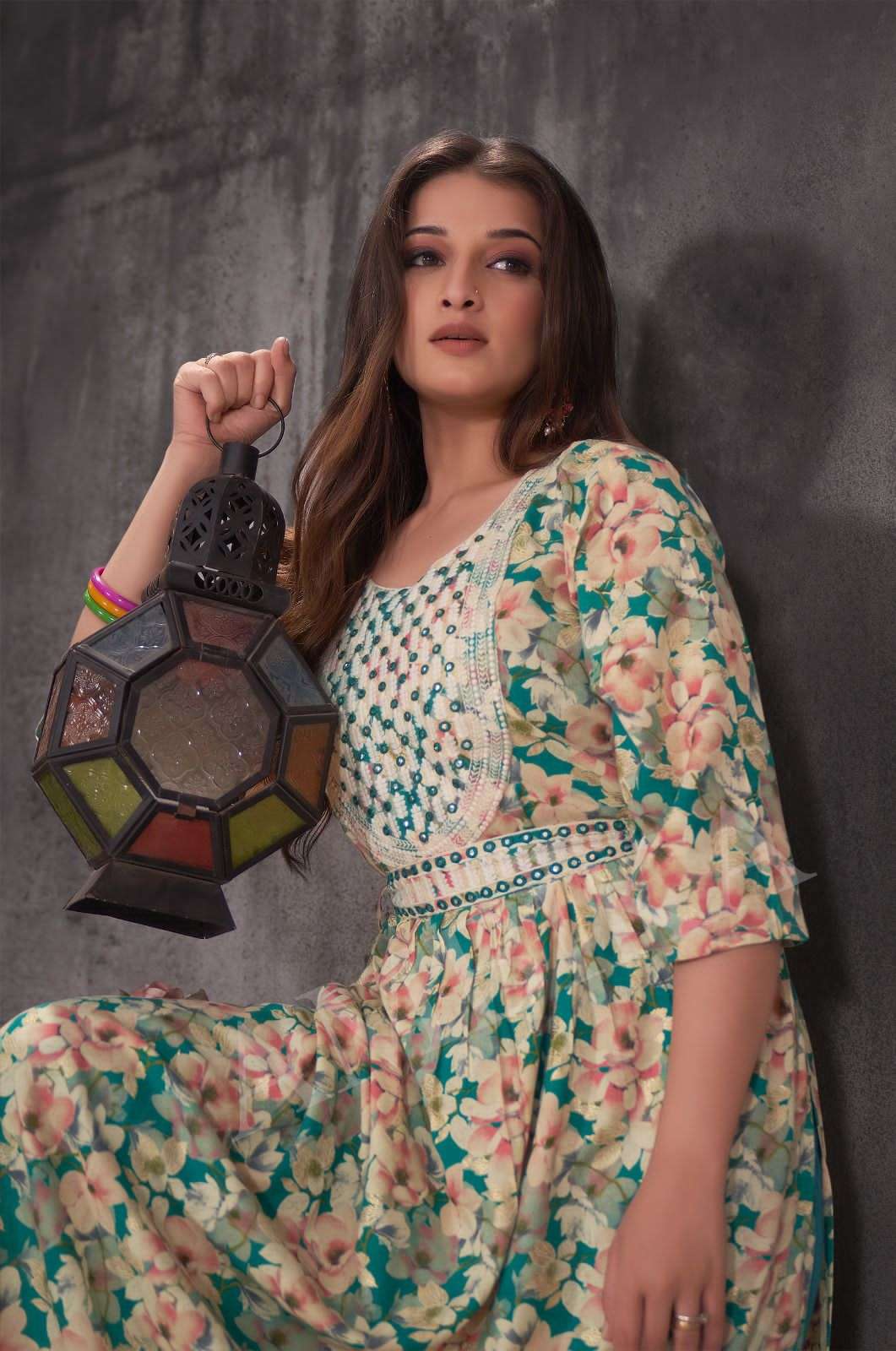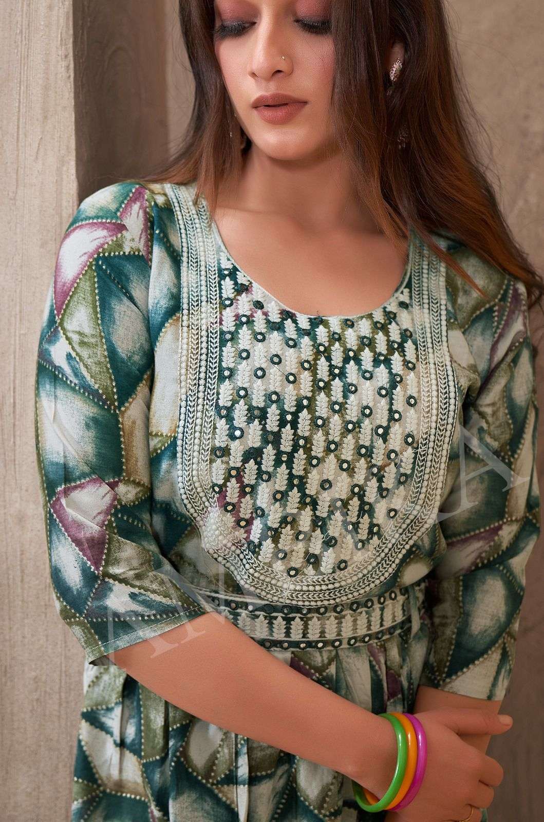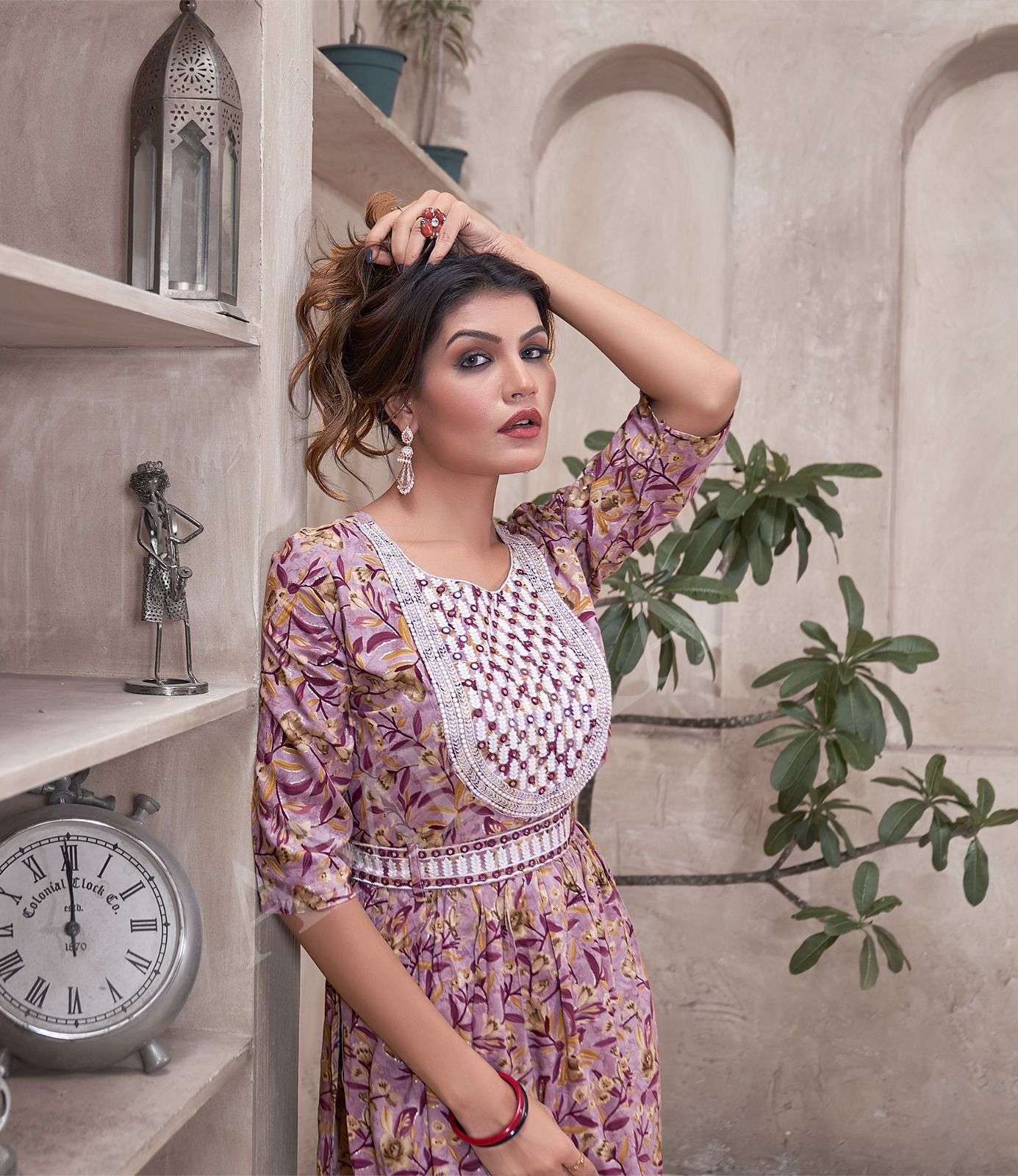 *Ambika kurtis* Colours : * 15 Different * 2 colour Designs in 1 bale* Style : Nayra Side cut with separate work BELT*🪢🪢 Length : 48🐣🐣
