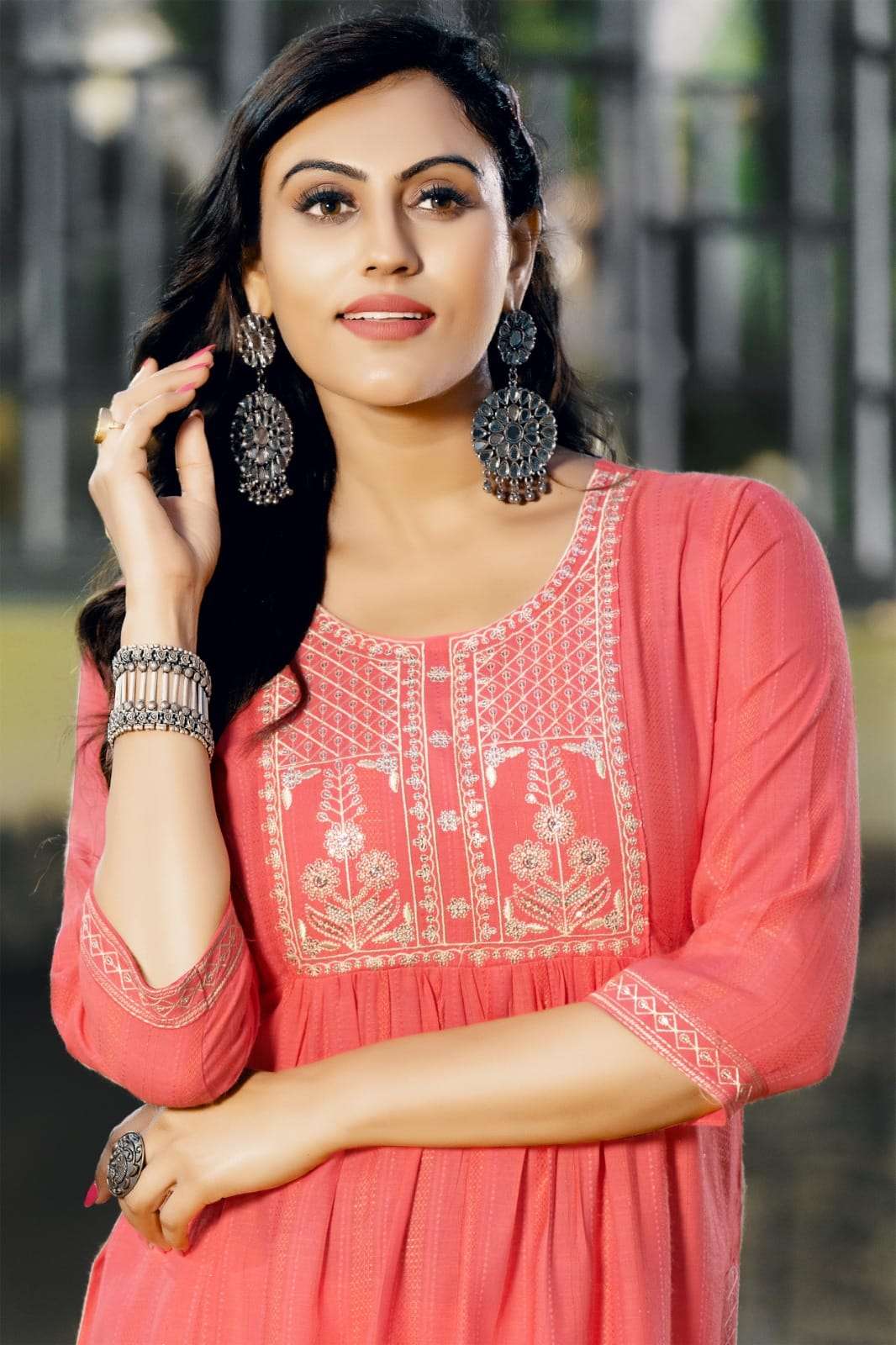 H.DOT by HIRWA presents its latest naira cut kurti catalog 📒NAME: NAIRA (Vol.3) 👗 Fabric: Self-Woven Fancy Viscose Rayon Concept: Naira Cut Festive wear Kurtis with Embroidery Work ✨ LENGTH: 45"+ ✨ DESIGNS: 7 ✨ SIZES: S, M, L, XL, XXL, 3XL, 4XL & 5XL Rate: 440/- |