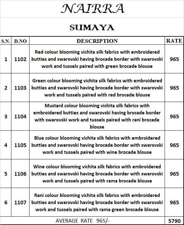 nakkashi nairra sumaya series 1102 to 1107 vichitra silk sarees collection