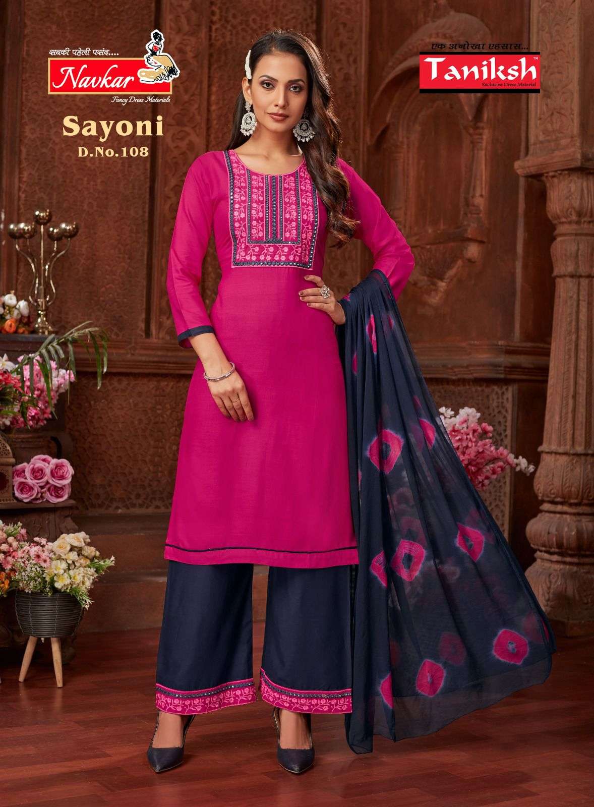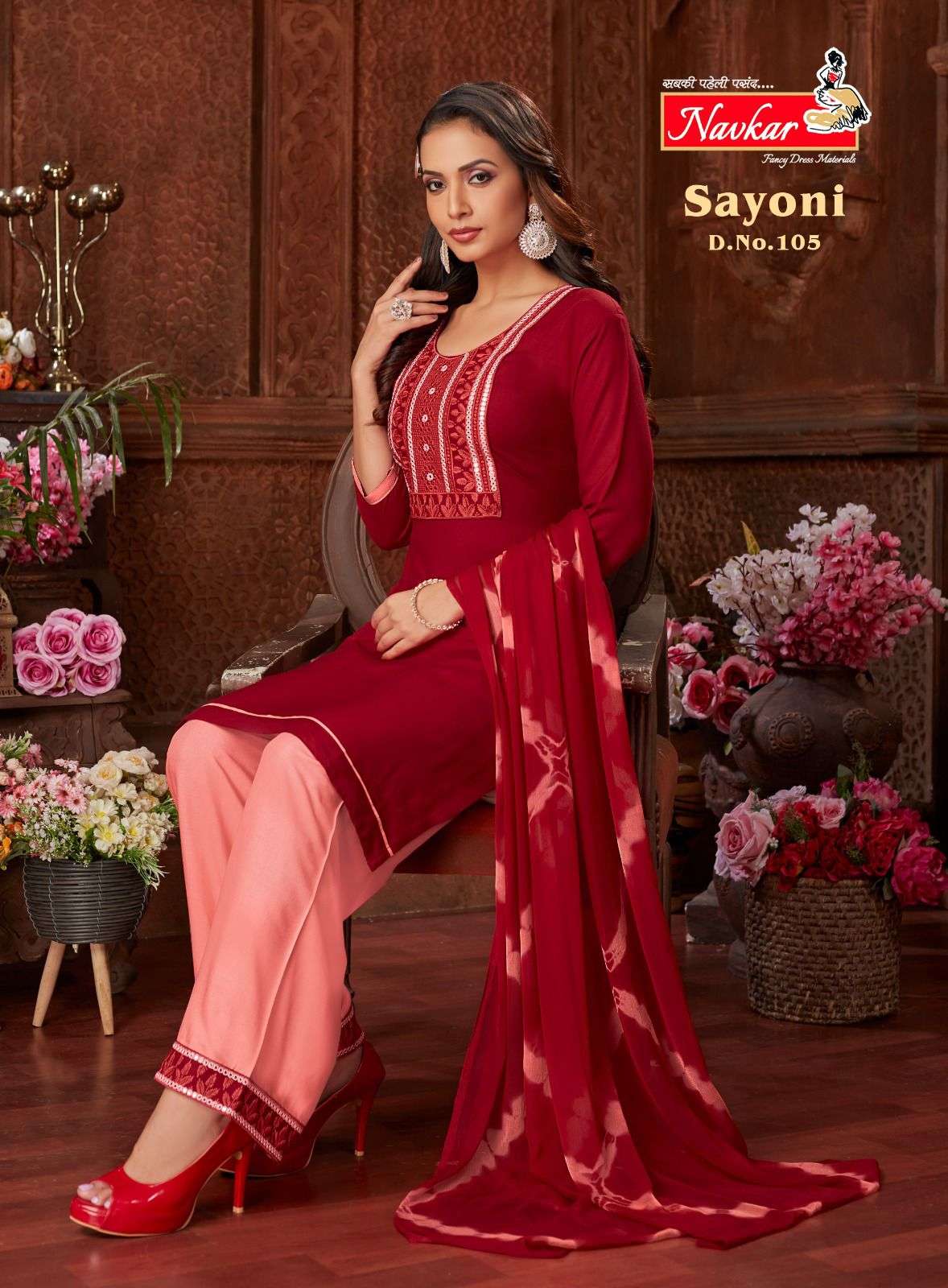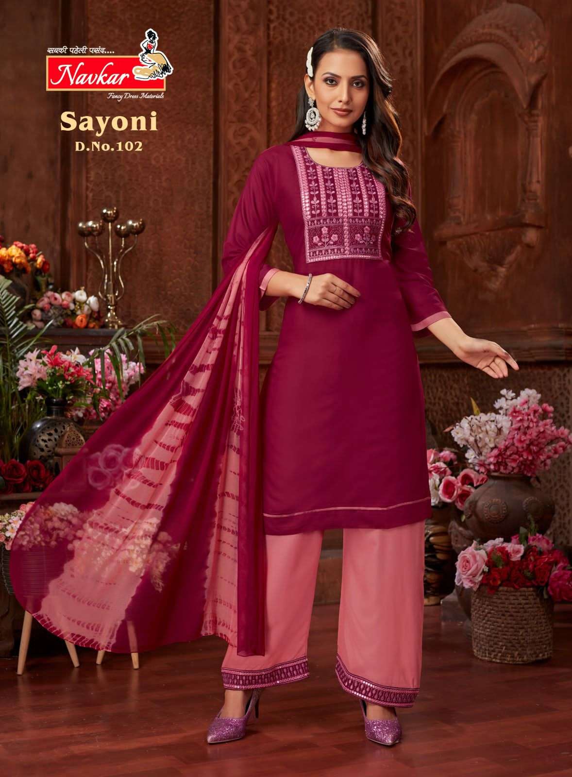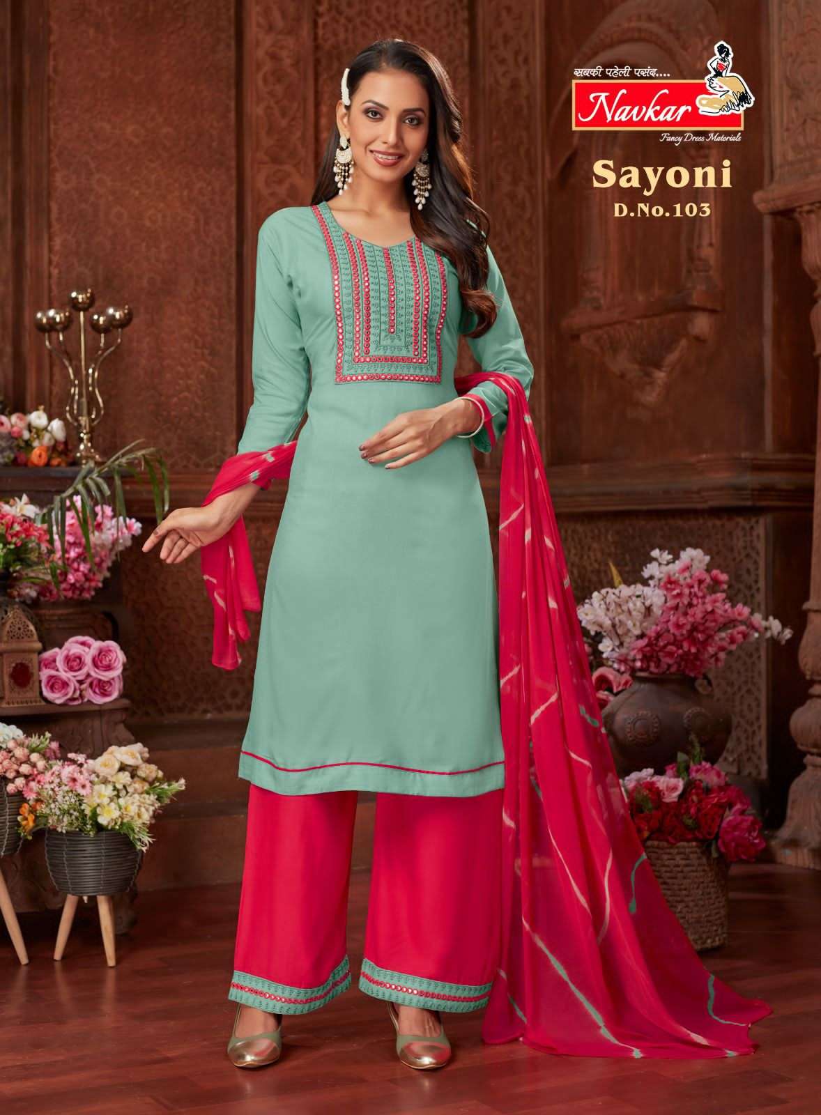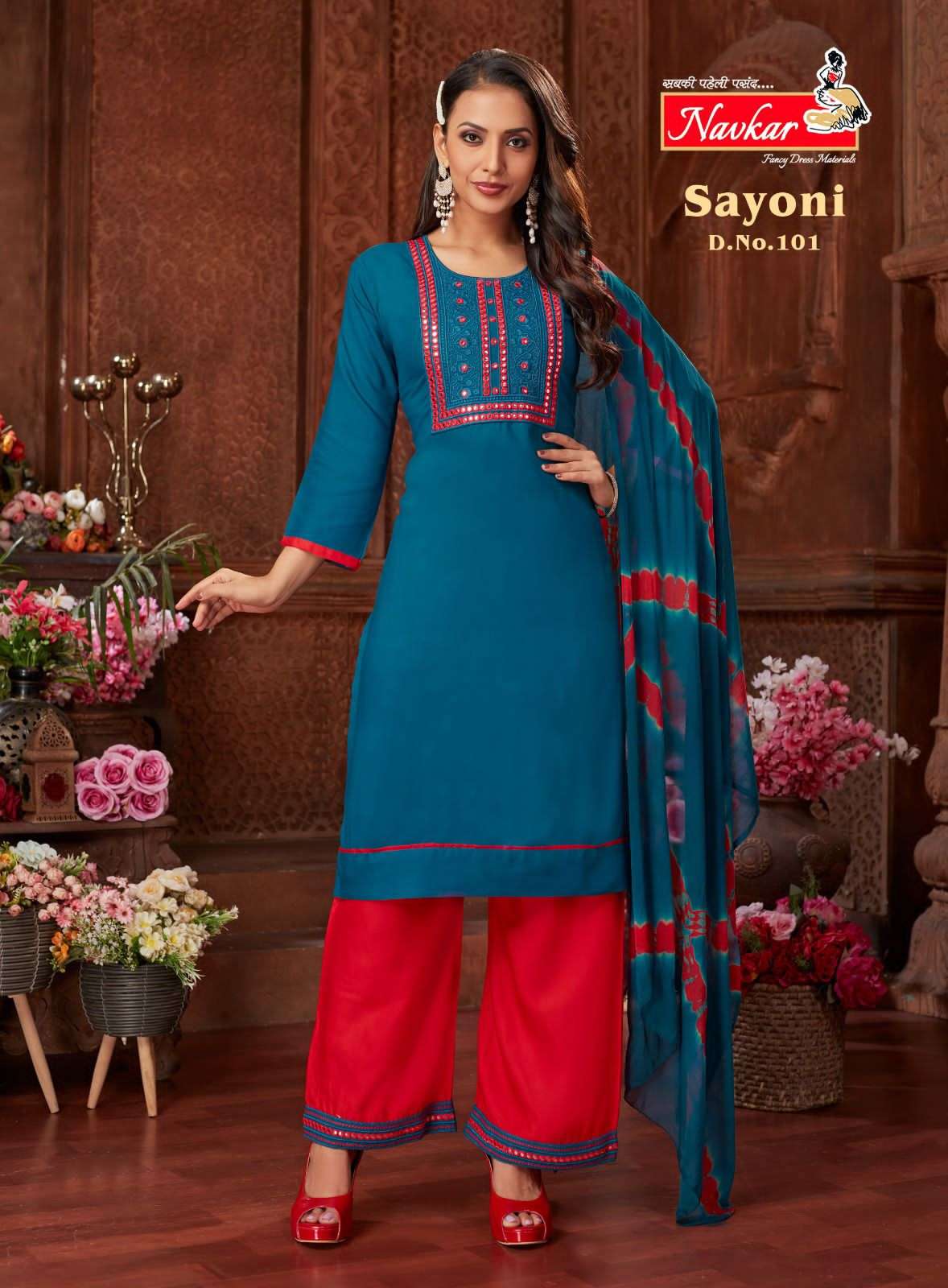 navkar present sayoni 3pcs set fabulous neck work kurti with plazzo and dupatta