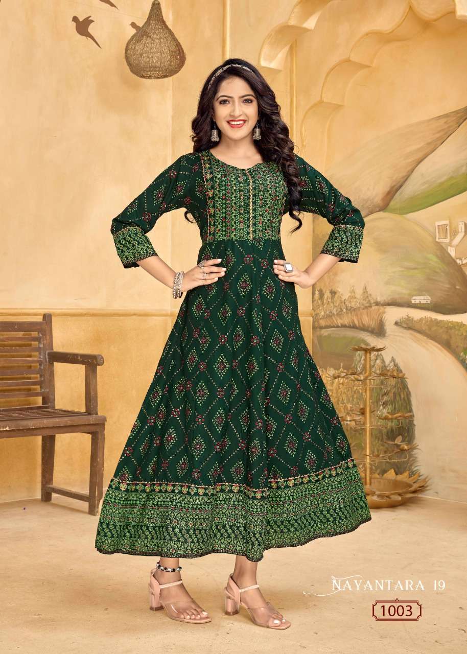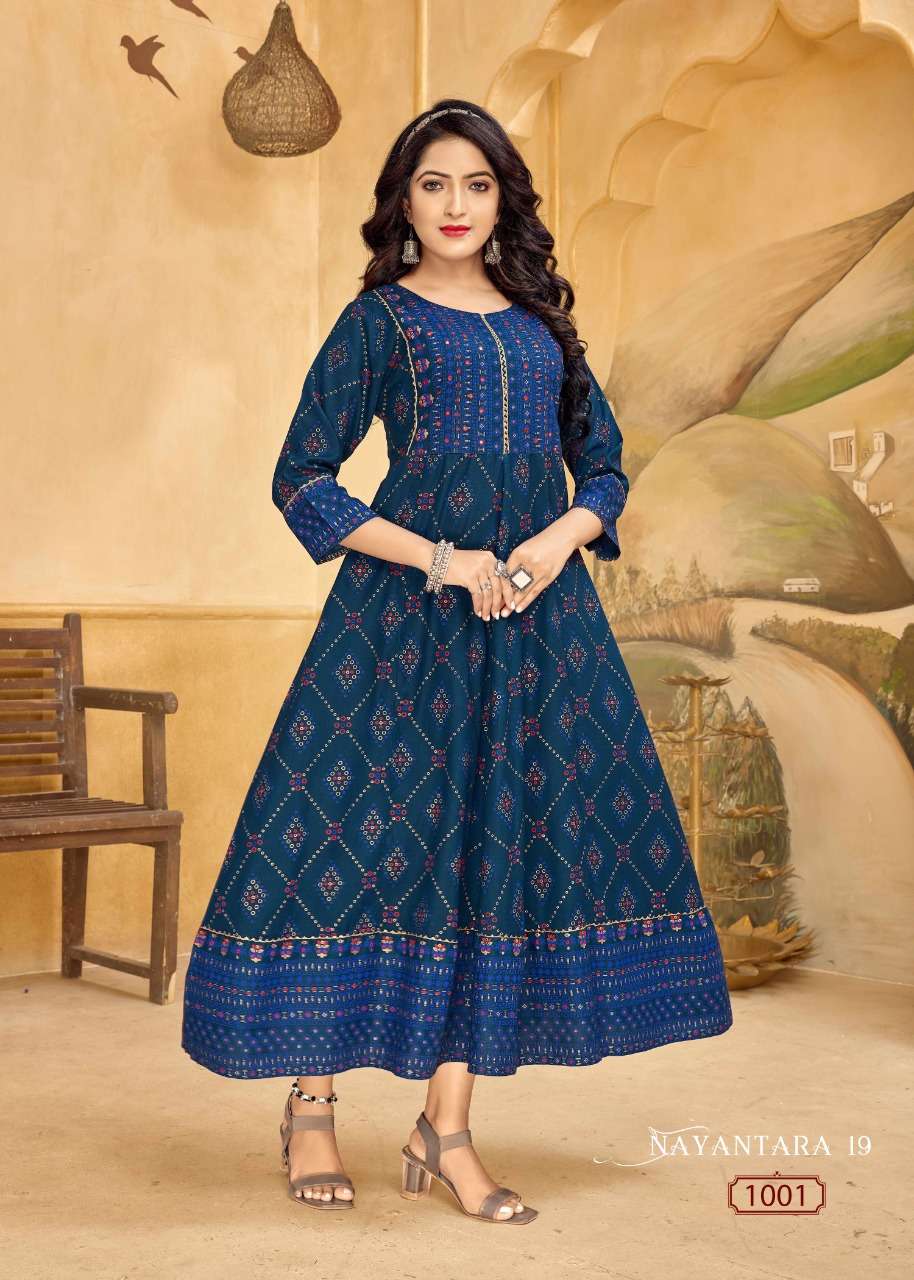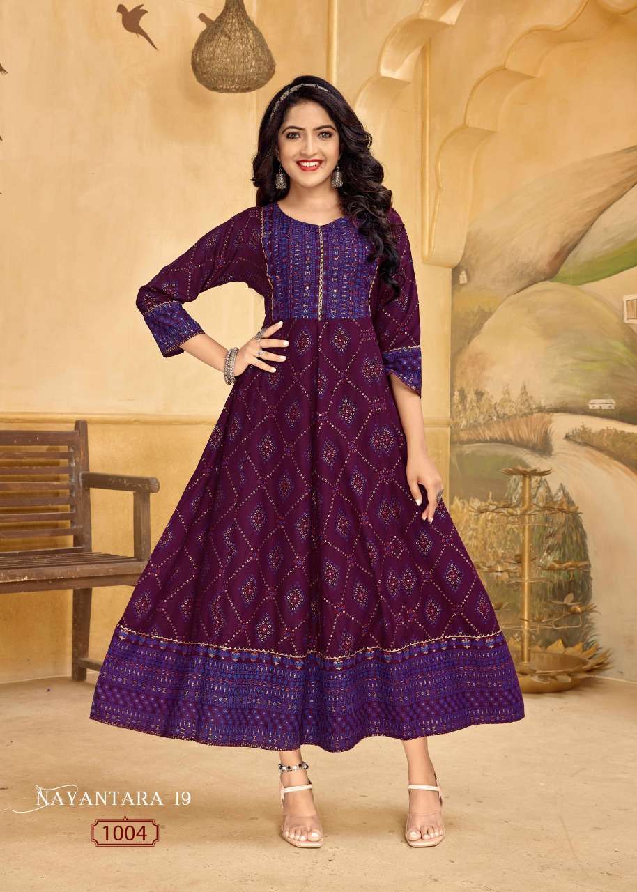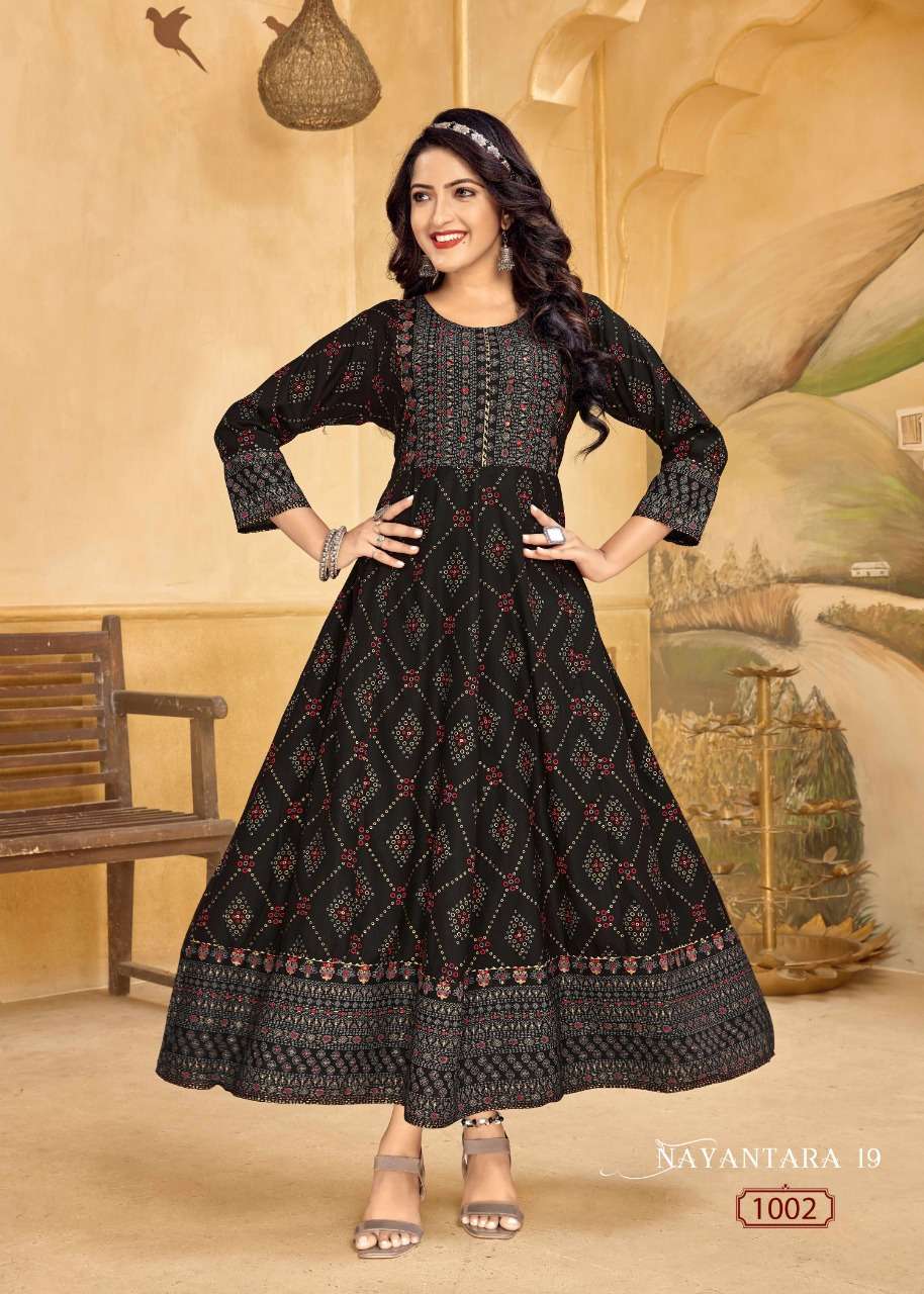 Banwery fashion Present NAYANTHARA V-19 Foil Print with Nack Handwork Flair Gown Fabric: 14kg Rayon with Foil Print Size: Length: 52” Price: 699/- + GST |