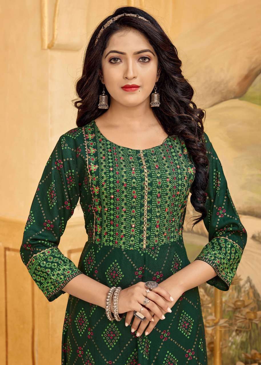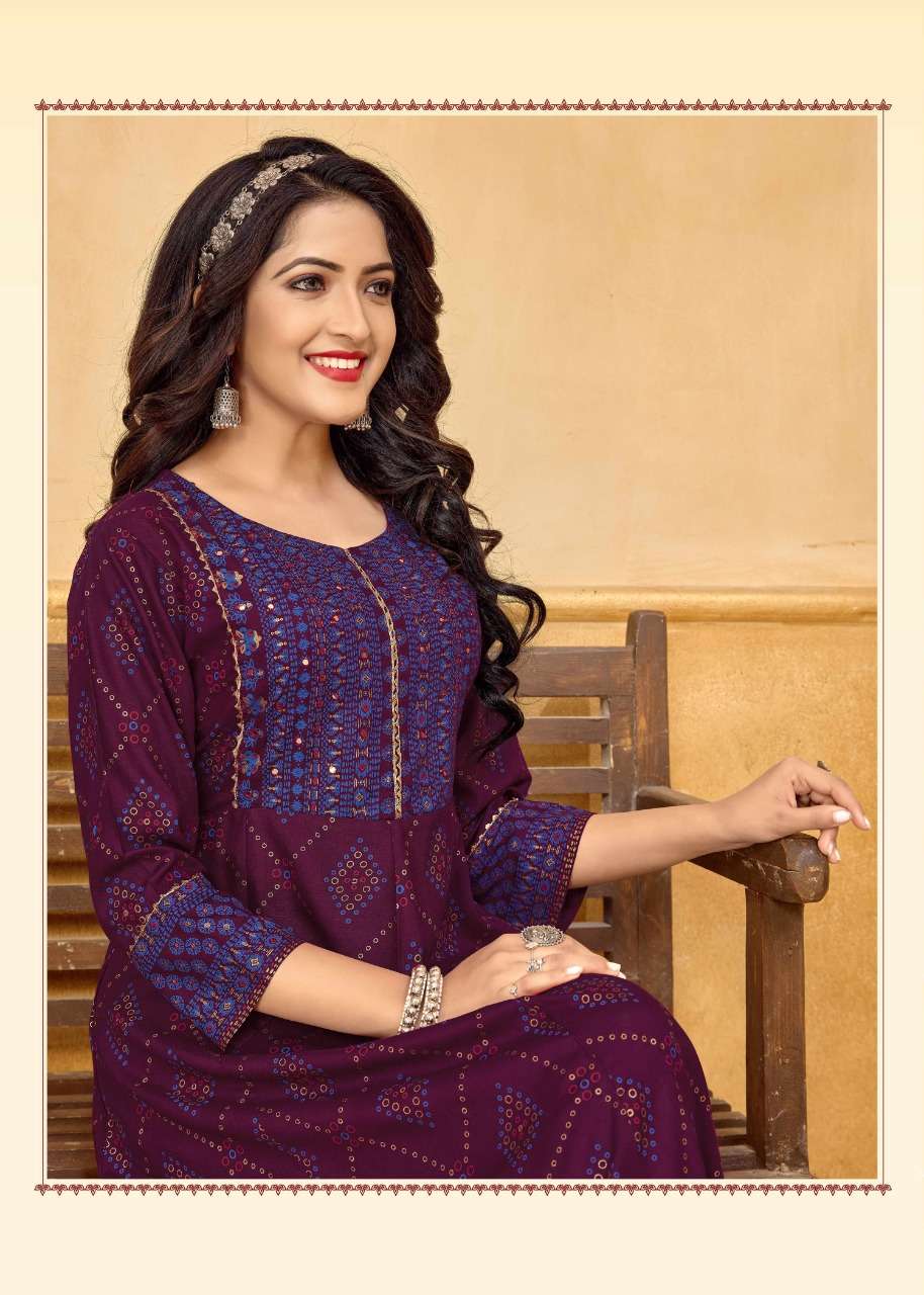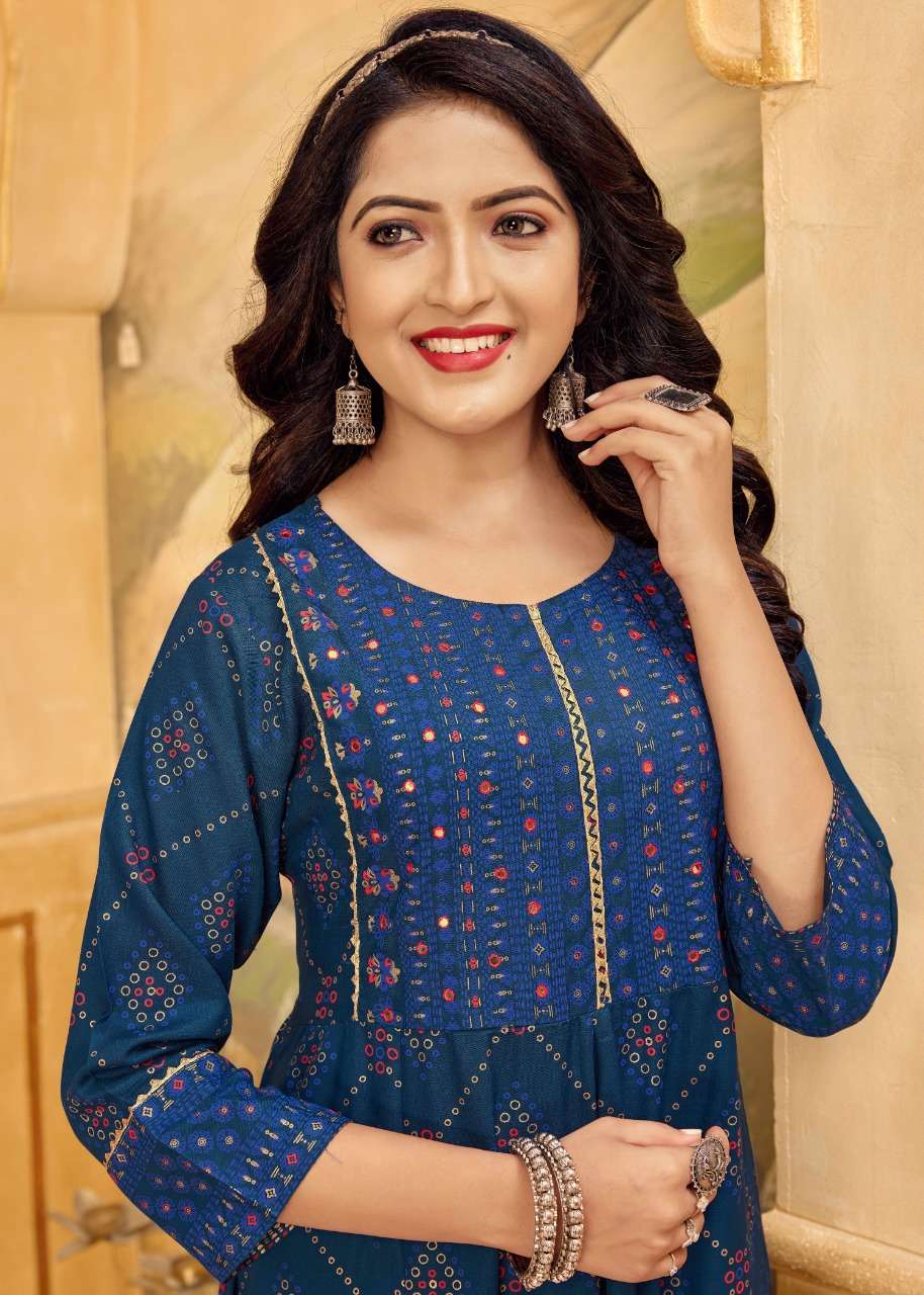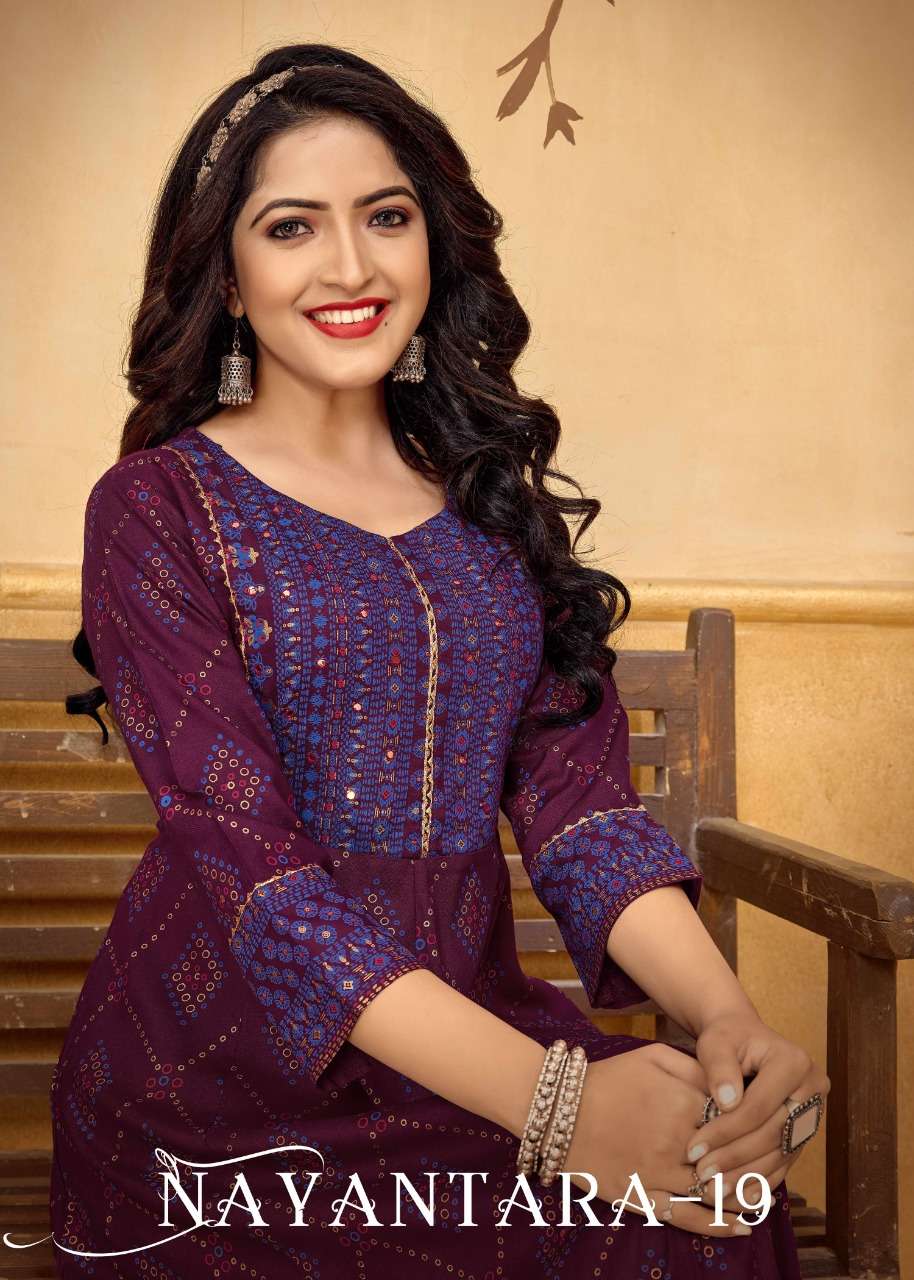 Banwery fashion Present NAYANTHARA V-19 Foil Print with Nack Handwork Flair Gown Fabric: 14kg Rayon with Foil Print Size: Length: 52” Price: 699/- + GST |