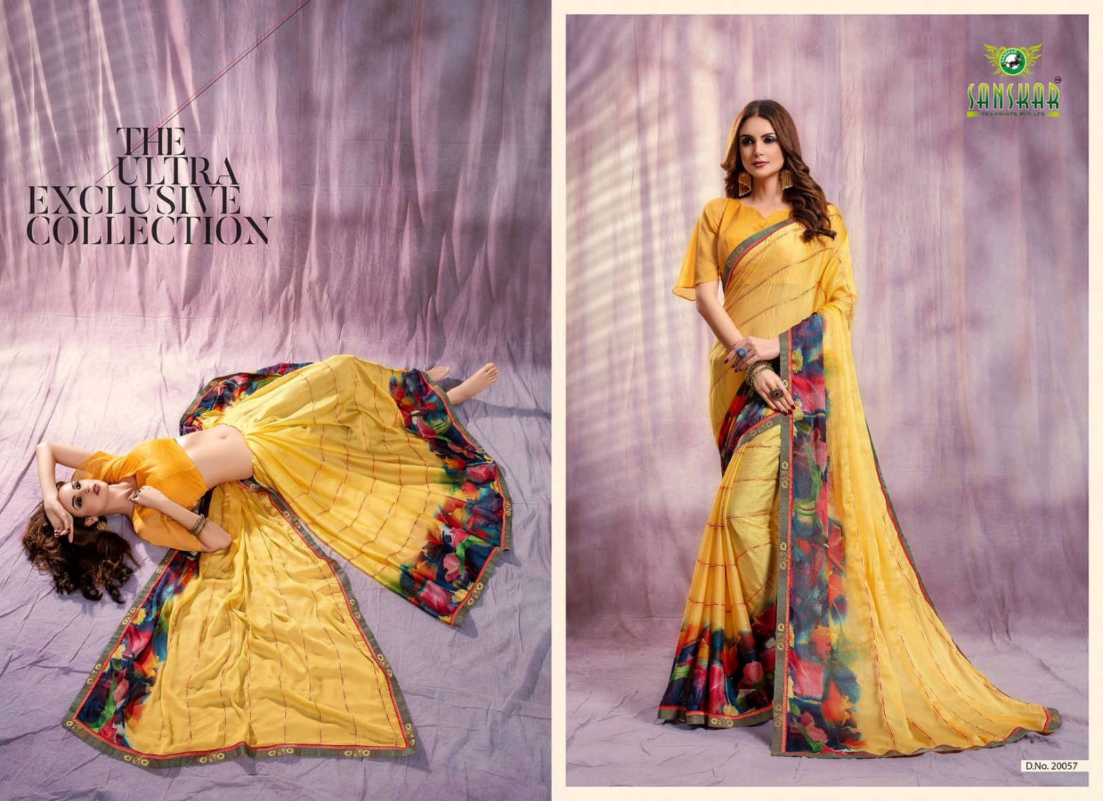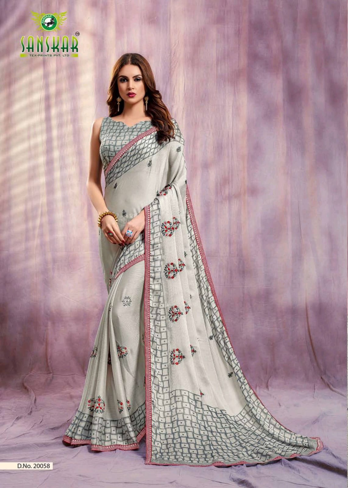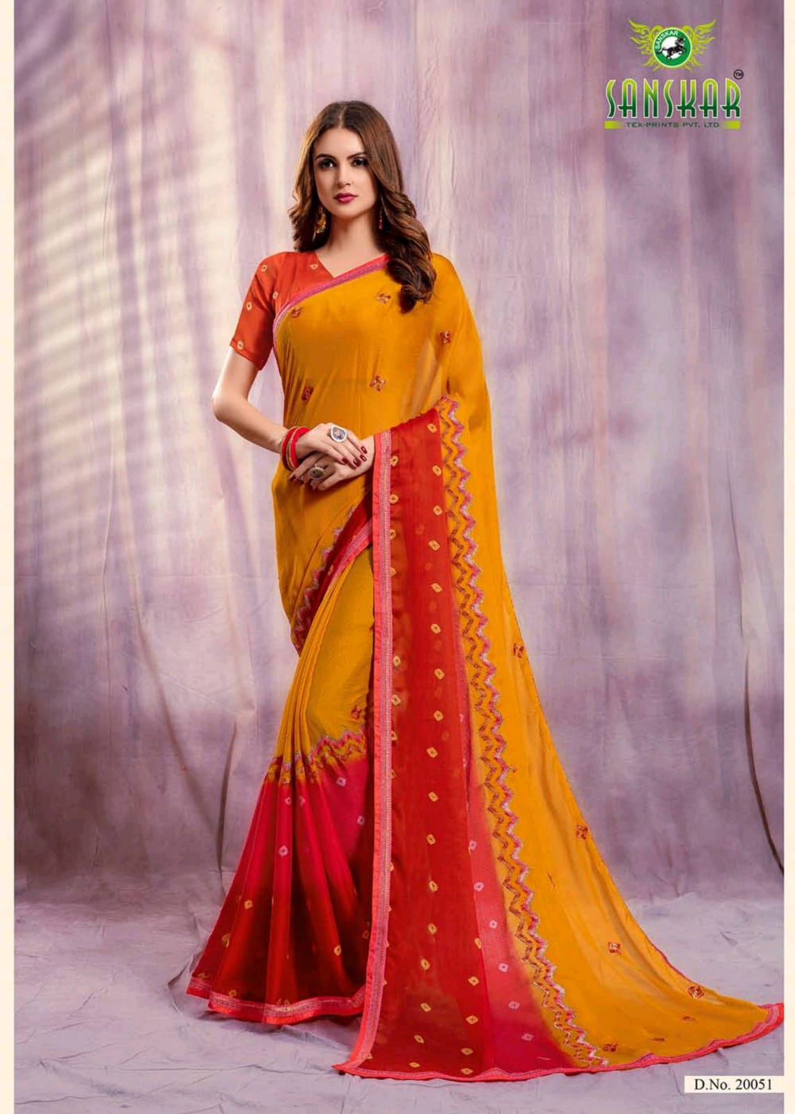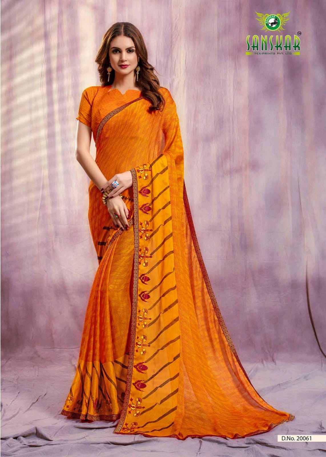 Nayna Hit By Sanskar Tex Prints Chiffon With Fancy Work Synthethic Saree Collections