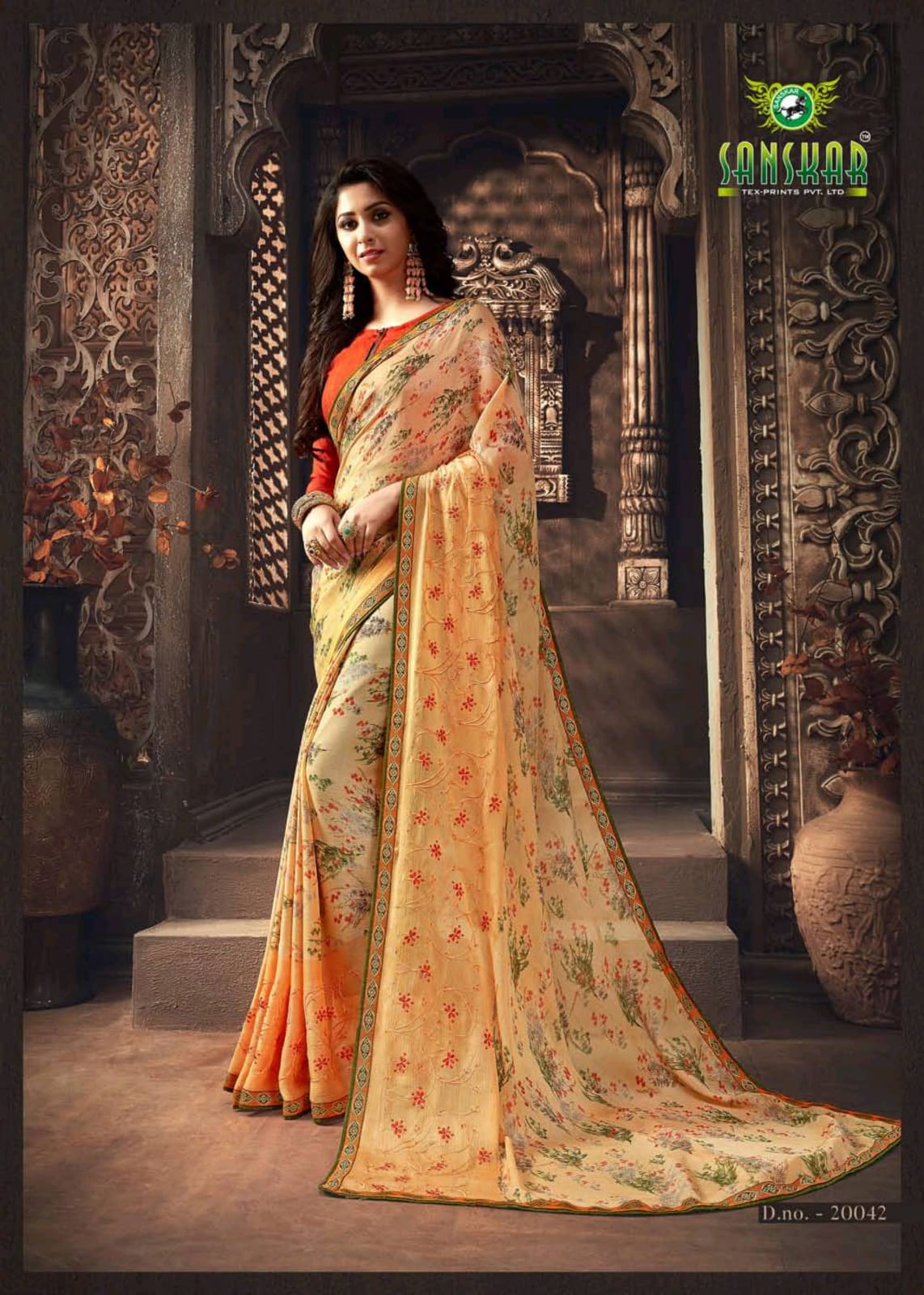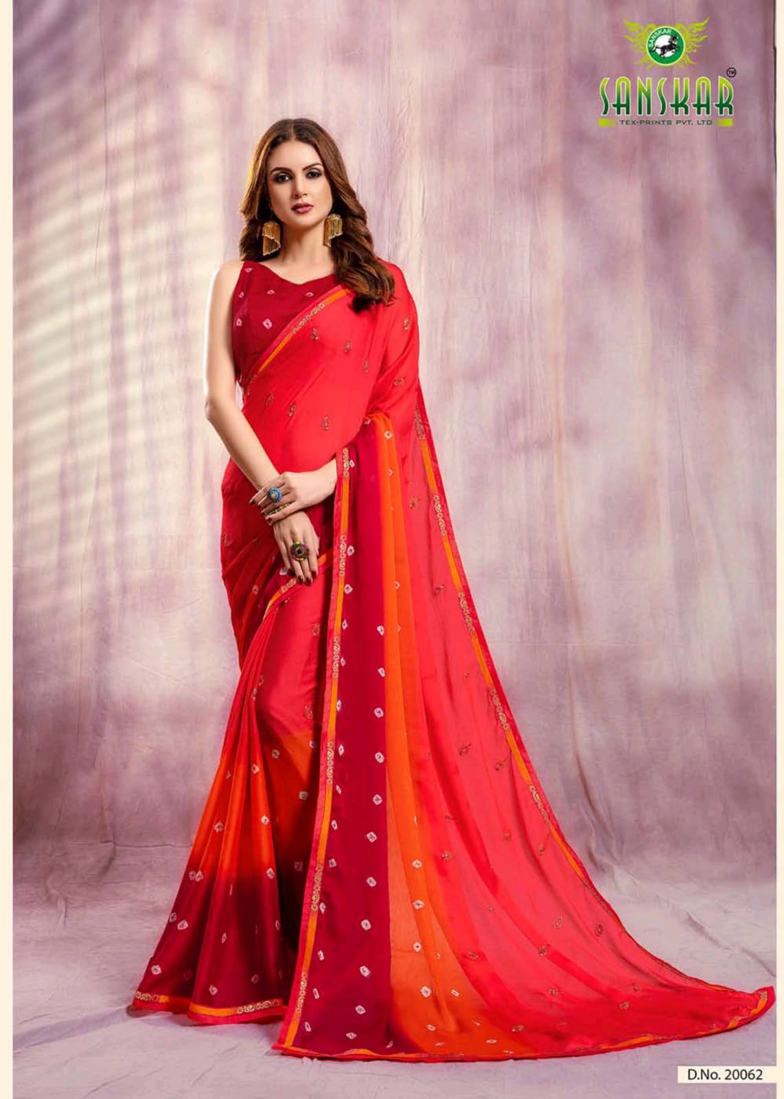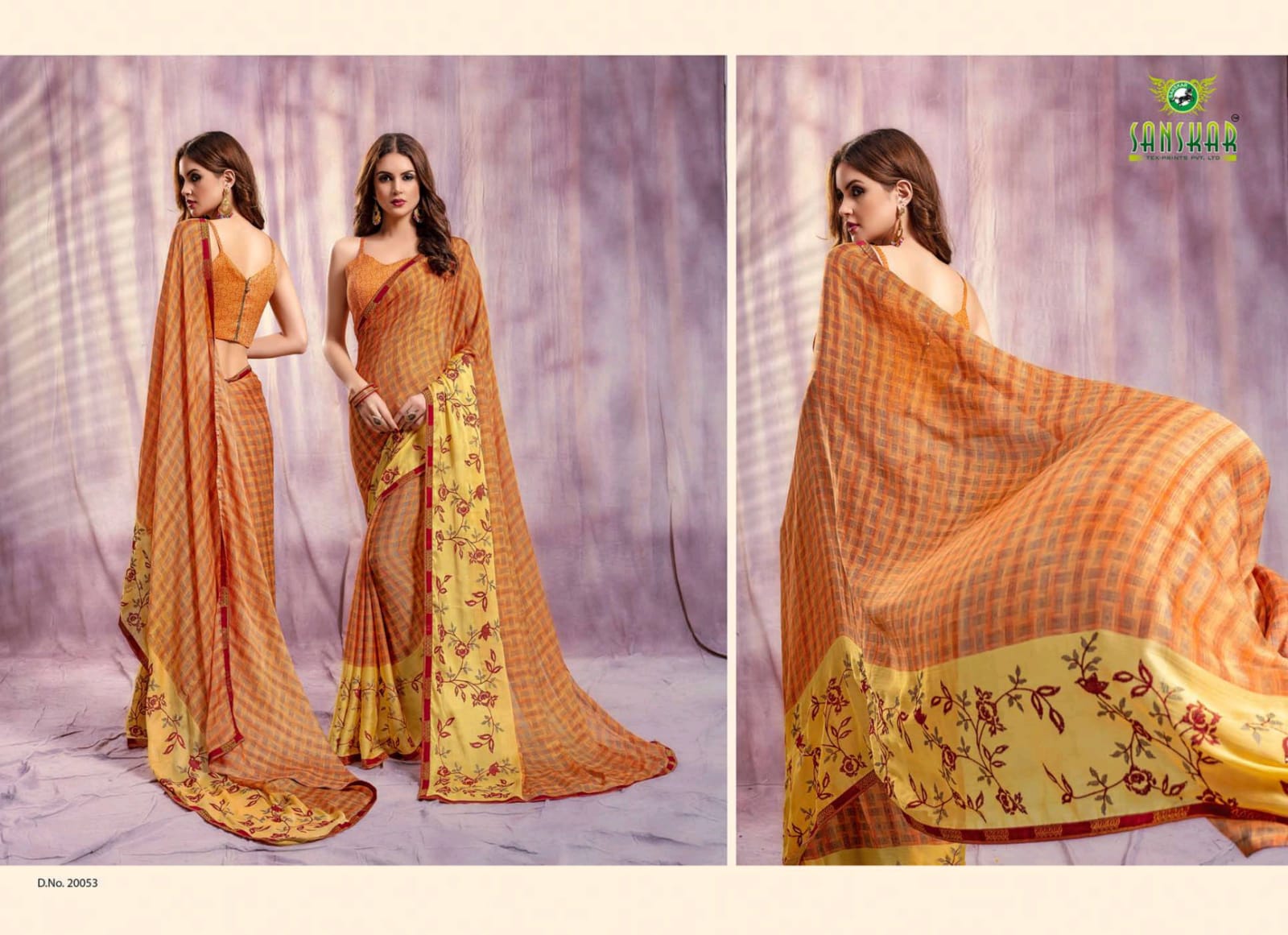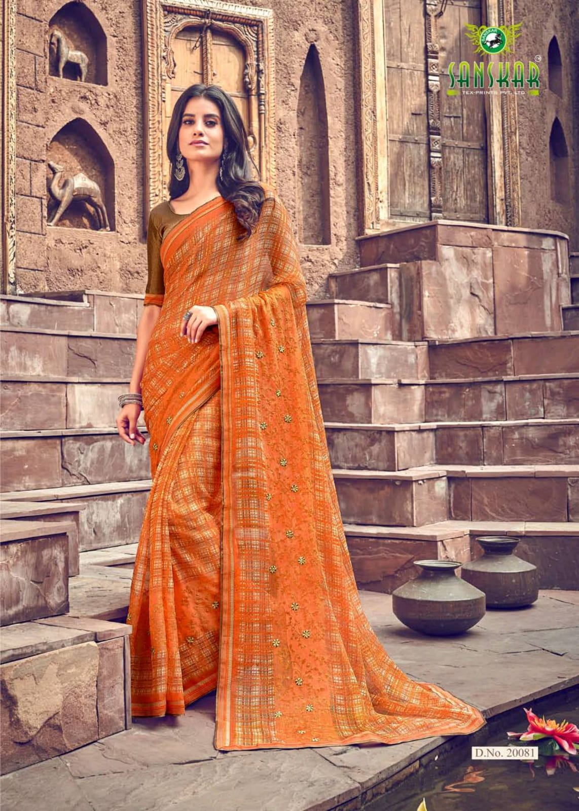 Nayna Hit By Sanskar Tex Prints Chiffon With Fancy Work Synthethic Saree Collections